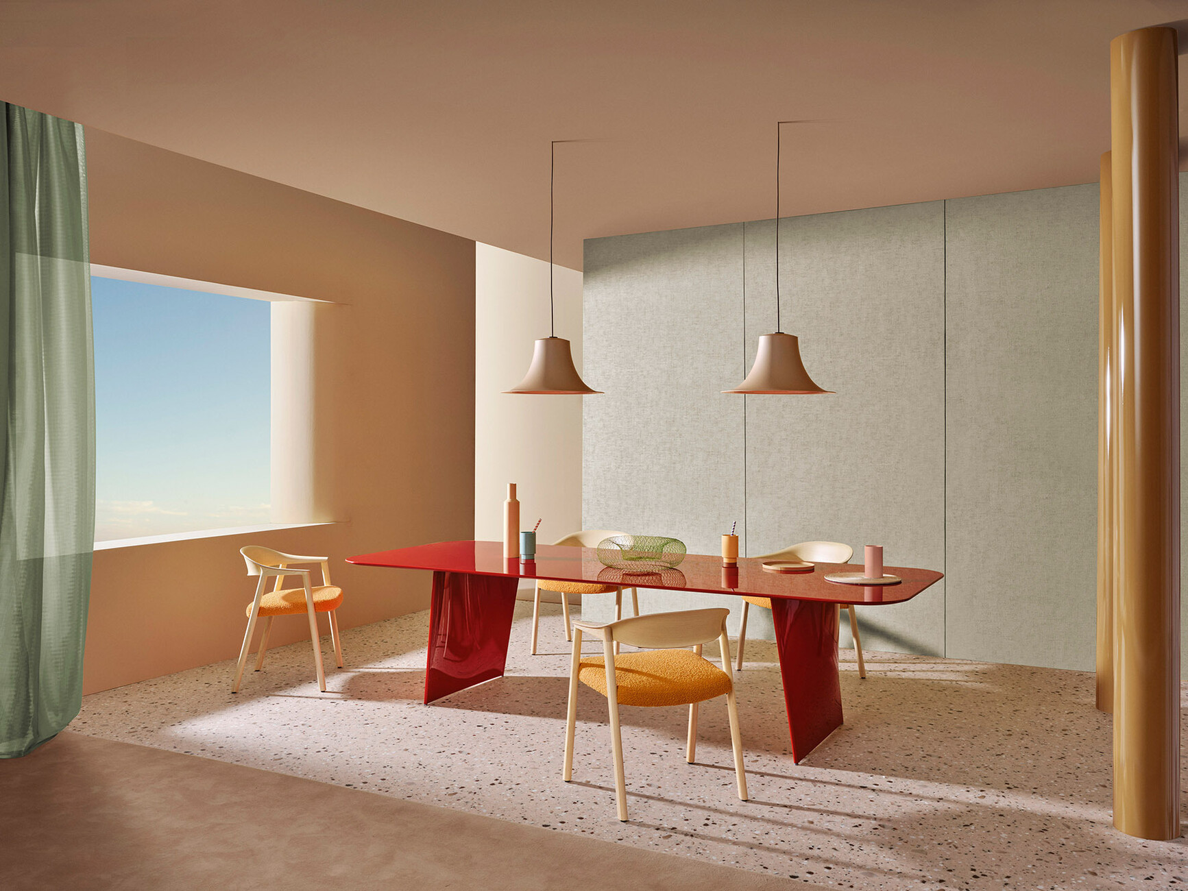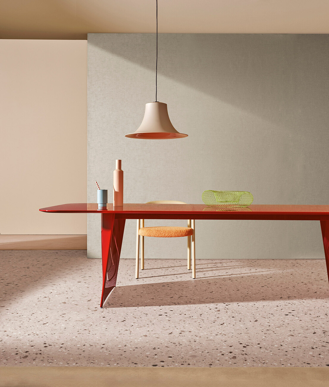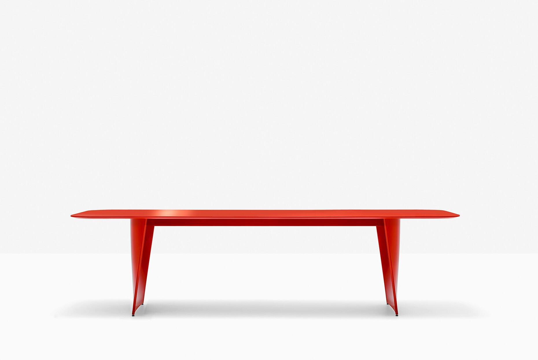 Mit dem Tisch "Frank" für Pedrali lotet Robin Rizzini die Möglichkeiten des Materials Aluminium aus: Zwei leicht nach innen gebogene Sockel tragen so die rechteckige Platte, die in drei Dimensionen, sowie aus Glas und lackiertem MDF erhältlich ist. Für die Version aus Aluminium sorgt zudem ein Antifingerprint-Finish für die stets perfekte Perfomance. Von einem stabilen Stahlträger direkt unter der Platte gehalten, verjüngt sich die dynamische Form der Sockel nach unten: "Für 'Frank' haben wir ein Untergestell aus Aluminiumdruckguss entworfen, das unmittelbar unter der Platte beginnt und zum Boden hin fast gerade wird. Die Idee war, den Eindruck eines sehr stabilen Tisches zu erwecken, trotz seiner schlanken Profile", so Robin Rizzini. Mit der Kombination von geraden und geschwungenen Linien schafft der Designer für Pedrali so einen Tisch, dessen Wahrnehmung sich je nach Blickwinkel verändert. Die segelförmigen Sockel verleihen dem Möbel dabei einen eleganten Schwung, der sich in jeden Kontext integrieren lässt. Und wer den großen Auftritt liebt, für den hat Robin Rizzini eine besonders markante Version aus rot glänzendem MDF. (am)