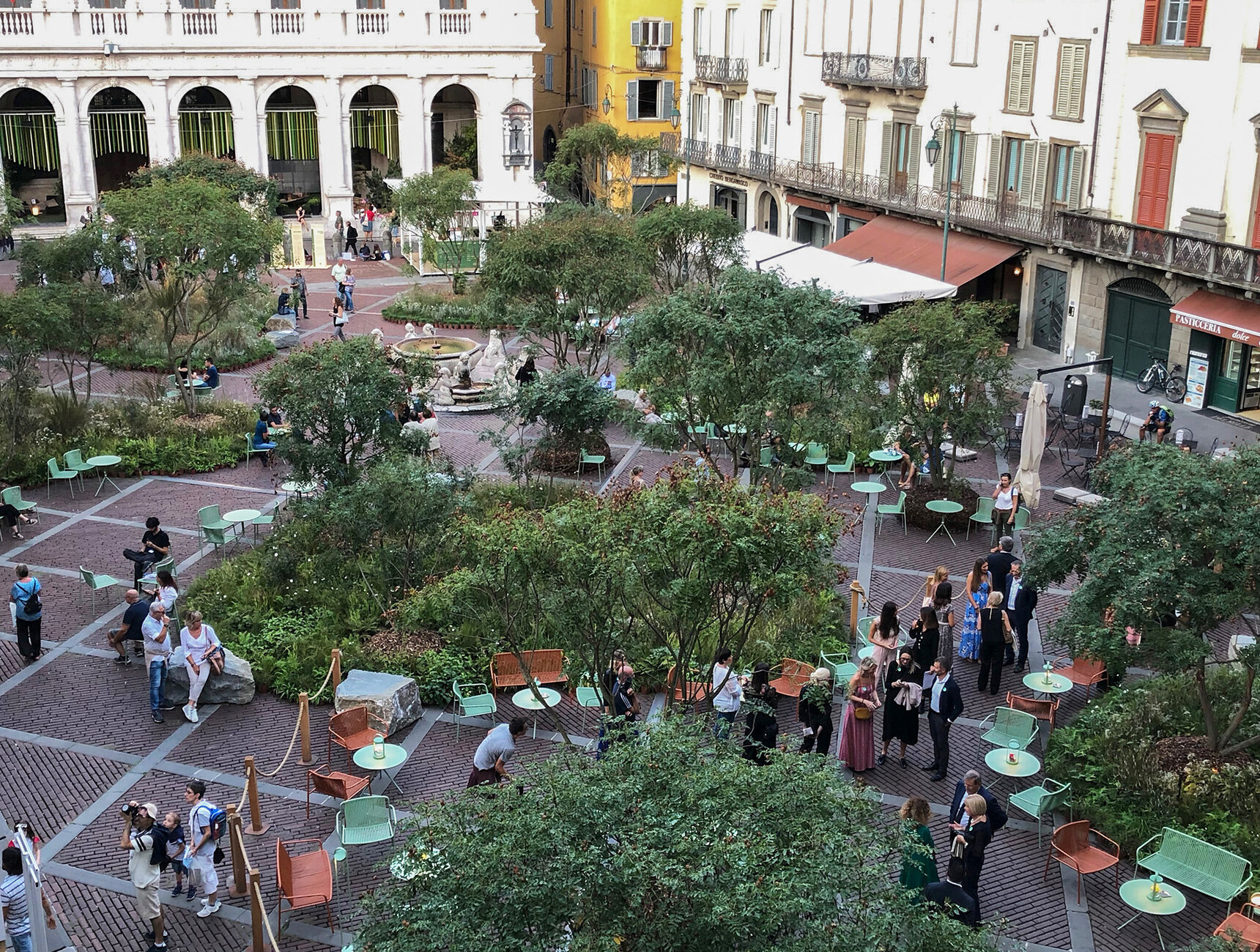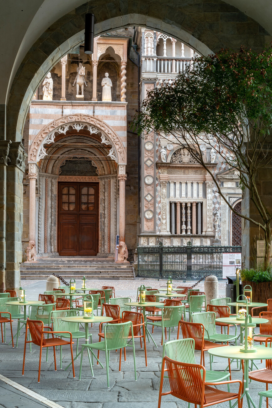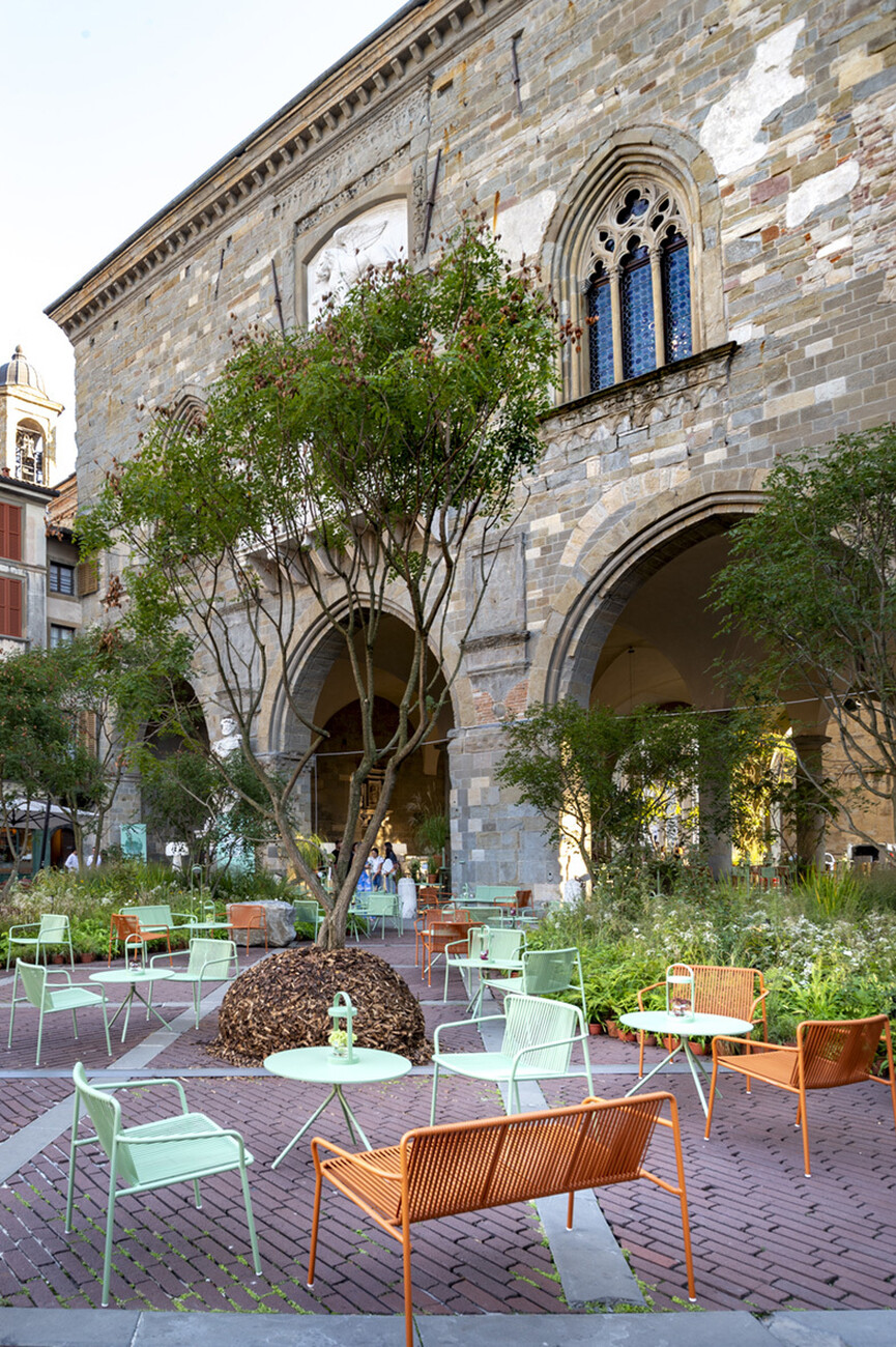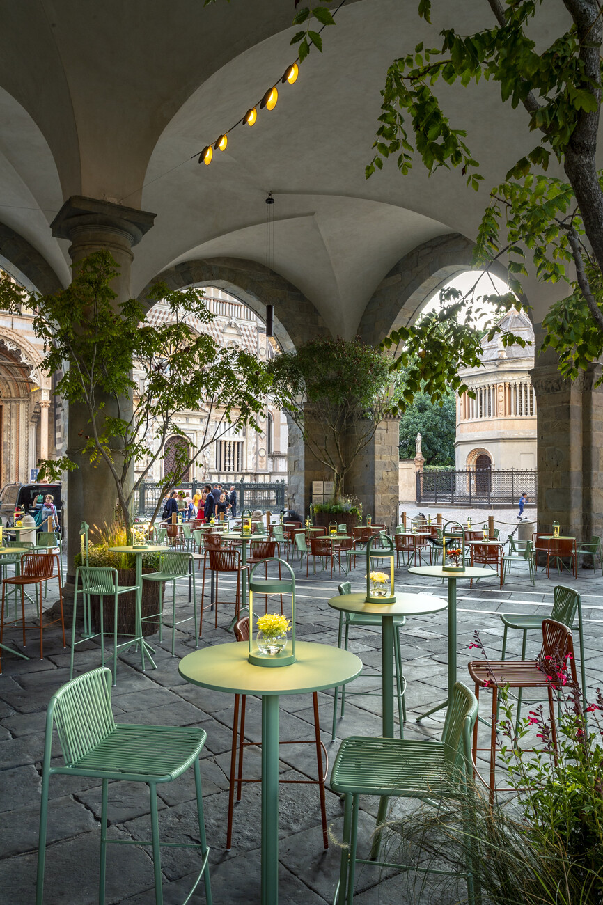 Der Zeitpunkt der Veranstaltung konnte indes nicht besser gewählt sein, da es den Gästen die Möglichkeit gab, die historische Kulisse mit zahlreichen Bäumen, Blumen und Sträuchern begrünt zu erleben: Im Rahmen des Festivals "I Maestri del Paesaggio" schaffte der Landschaftsarchitekt Luciano Giubbilei passend zum diesjährigen Motto "Pioneer Landscape" auf der Piazza Vecchia neue Ansatzpunkte für die Zukunft des kulturellen Erbes. "Pedrali ist bekannt dafür global zu agieren, aber gleichzeitig ist es sehr bedeutend in unserer Heimat einen kulturellen Mehrwert zu schaffen", so Monica Pedrali. Es gehe daher nicht nur darum, im Rahmen des "I Maestri del Paesaggio" die Möbel des Unternehmens zu präsentieren. Pedrali wolle mit der Unterstützung der Reinterpretation des Piazza Vecchia erreichen, dass die Besucher die historische Stadt aus einer Perspektive sehen, in der Architektur und Natur harmonisch ineinander übergehen.