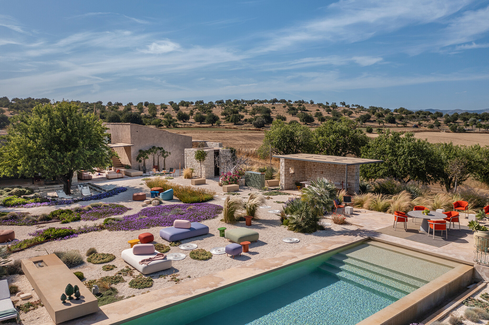 Das urbane Abenteuer definiert das Rivage Paris, ein Eventboot, dass auf zwei Ebenen viel Platz für Veranstaltungen aller Art bietet. Entsprechend flexibel sollten die Möbel sein, um sowohl für informelle wie formelle Ereignisse die passende Bühne zu bieten. Die Barstühle "Tribeca" von CMP Design sind beispielsweise mit einer Struktur aus Stahl und PVC Geflecht ideal für alle Wetterverhältnisse geeignet – in Rosa und kombiniert mit den hohen Tischen "Elliot" von Patrick Jouin in Hellgrün sind diese zudem ein Farbtupfer, der eine fröhliche Atmosphäre schafft. Eine wahres Feuerwerk hat Pedrali zudem im Außenbereich der privaten Villa in der sizilianischen Stadt Noto gezündet: Busetti Garuti Redaelli schafft es für "Buddy Oasi" ein volles Sitzvolumen mit Polsterung aus geschäumtem Polyurethan mit einer leichten Struktur aus Aluminium zu einem harmonischen Ergebnis zu verbinden. Dank des wasserdichten Futters und den abnehmbaren Bezügen in vielen Farben, ist das System aus Ottomanen und Sofas sehr pflegeleicht und bietet dabei unzählige Möglichkeiten individuelle Sitzlandschaften zu kreieren. Im Detail lässt sich der Pouf beispielsweise mit flexiblen Rückenlehnen je nach Wunsch gestalten.