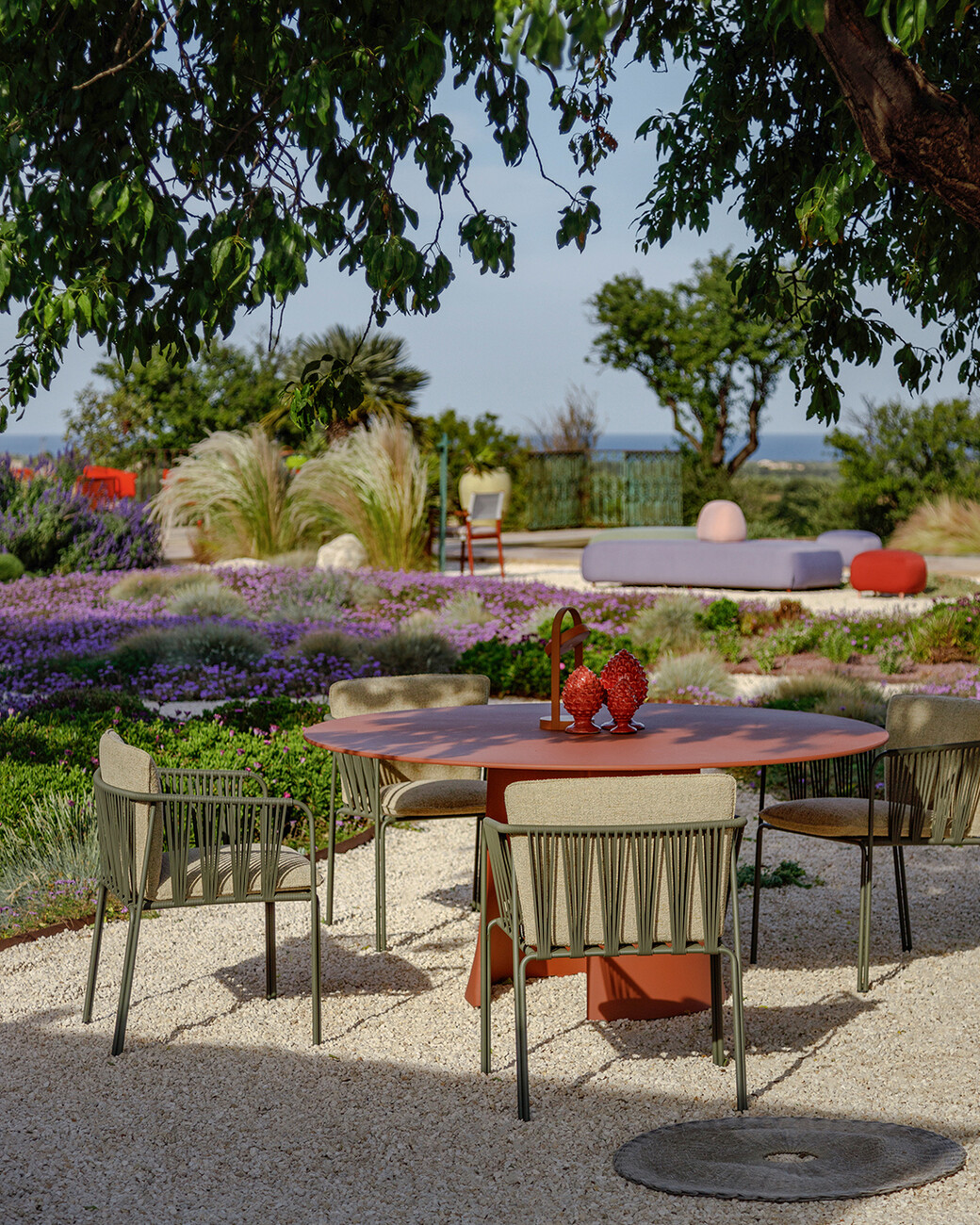 Gemütliche Sitzecken im Schatten wurden zudem unter anderem mit "Reva Cocoon" von Patrick Jouin erstellt – die Lounge-Sitze bieten unterschiedliche Sofaelemente und Chaiselongues mit Rückenlehnen in zwei verschiedenen Höhen. Dazu gesellt sich die Outdoor-Kollektion "Philía" von Odo Fioravanti, dessen Stahlrohrstruktur mit von Hand geflochtenen PVC-Gewebe an das Dolce Vita Lebensgefühl der 60er-Jahre aufleben lässt. Andrea Pedrali schafft mit seinem Stuhl "Narì" eine Hommage an die ersten Gartenstühle aus Schmiedeeisen, mit denen Mario Pedrali einst die Erfolgsgeschichte des heute international agierenden Unternehmen startete.