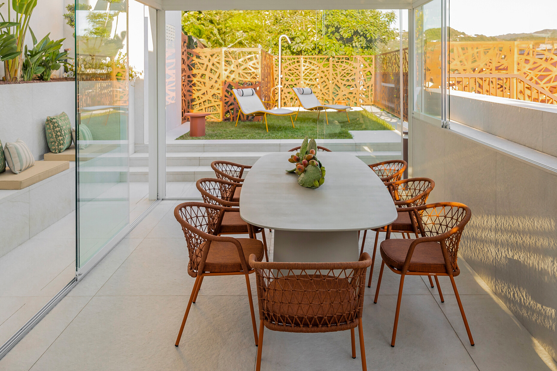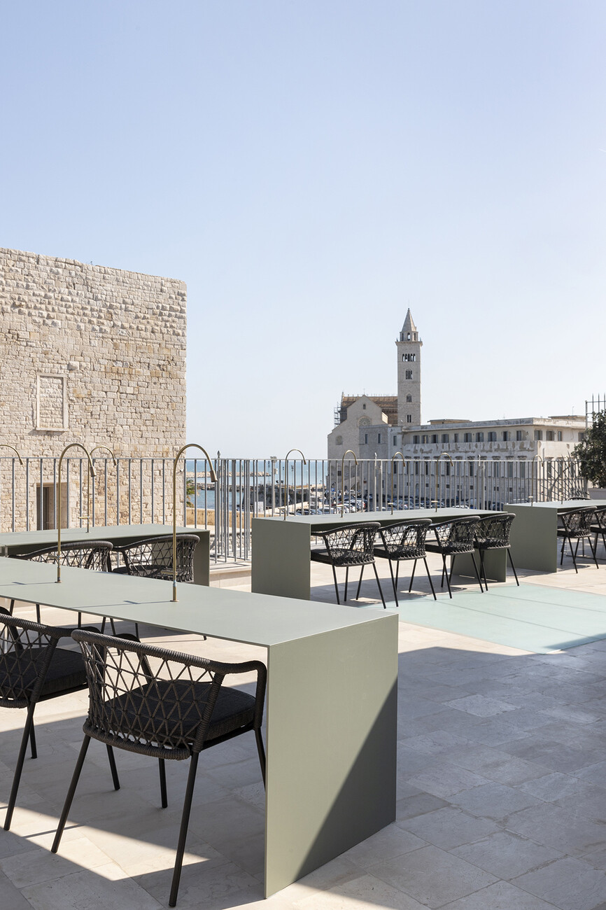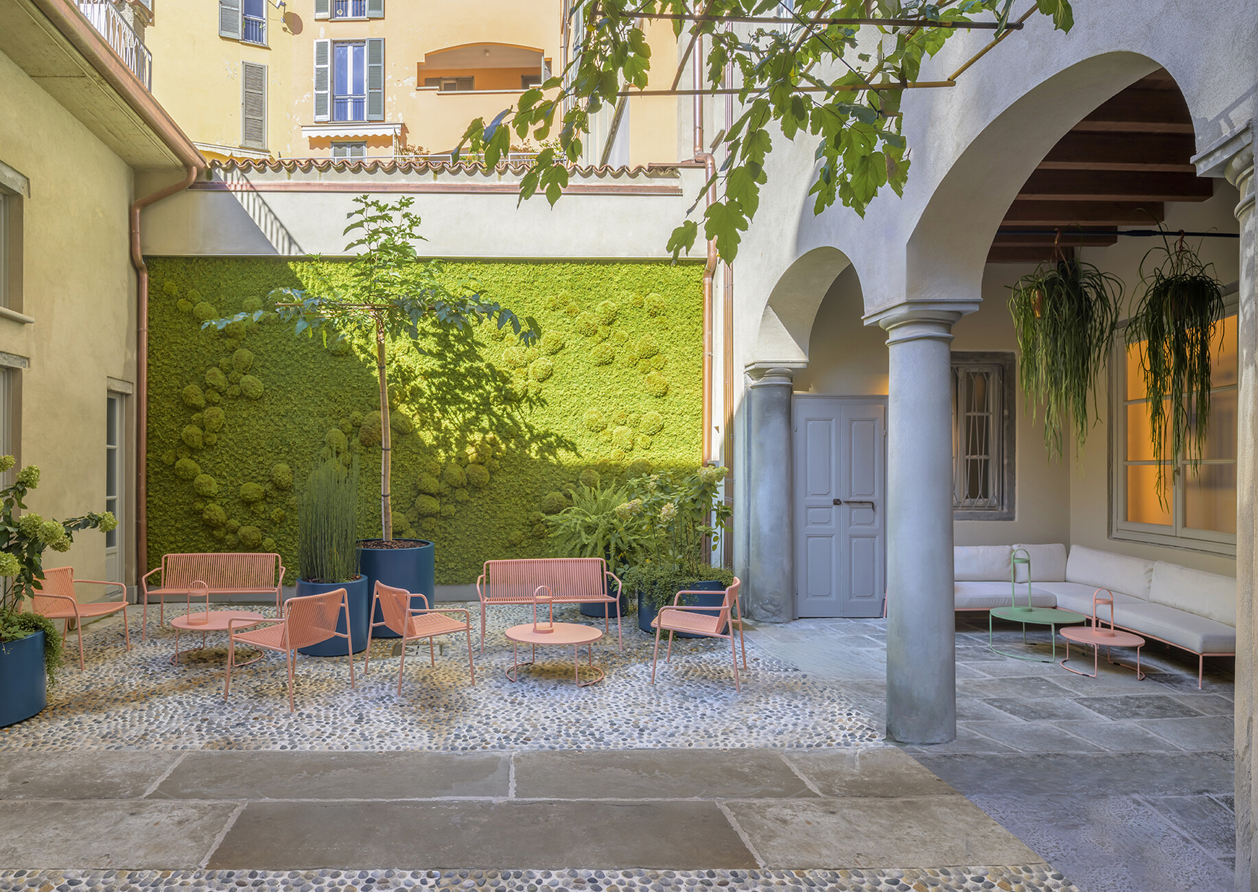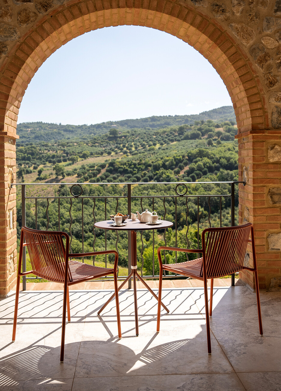 Passgenau können die Outdoor-Möbel aus dem Sortiment von Pedrali für das individuelle Projekt ausgewählt werden – wie für die Gäste des Villa Riviera Resort in Santa Giulia: Die Sessel und Lounges "Tribeca" von CMP Design bieten einen komfortablen Platz, während der Blick über die Weite der genuesischen Riviera schweift. Gefertigt aus einem schlanken Rohrrahmen mit einer luftigen gewebten Bespannung aus extrudiertem PVC mit Nylonkern erinnern diese formal an die klassischen Sixties-Terrassenstühle aus geflochtenem Stahl. Für die Farbgebung wurde ein warmes Terrakotta gewählt, das sich in den Details der Architektur der historischen Villen des Fünf-Sterne-Luxusresorts wiederfindet – wie der Wandfarbe oder den Fliesen. Den passenden Tisch haben CMP Design gleich mitgedacht: "Nolita", ein leichtes Modell mit drei Beinen aus Stahlrohr, dessen Platte sich bei Bedarf ganz einfach zu Seite klappen lässt. Aus den zahlreichen Ausführungen wurde die Version mit runder Platte in Anthrazit gewählt, die im Zusammenspiel mit "Tribeca" einen feinen Kontrast bietet. Die Gestaltung der Sessel "Volt" von Claudio Dondoli und Marco Pocci zeigt derweil angesichts der fantastischen Landschaft eine zurückhaltendes Ensemble mit klaren Linien aus Polypropylen. Passend zu dem industriellen Look wurden die Tische "Arki-Base" mit vier Beinen aus Stahlrohr und rechteckigem Querschnitt kombiniert.