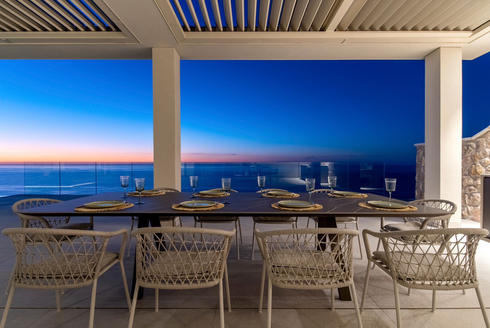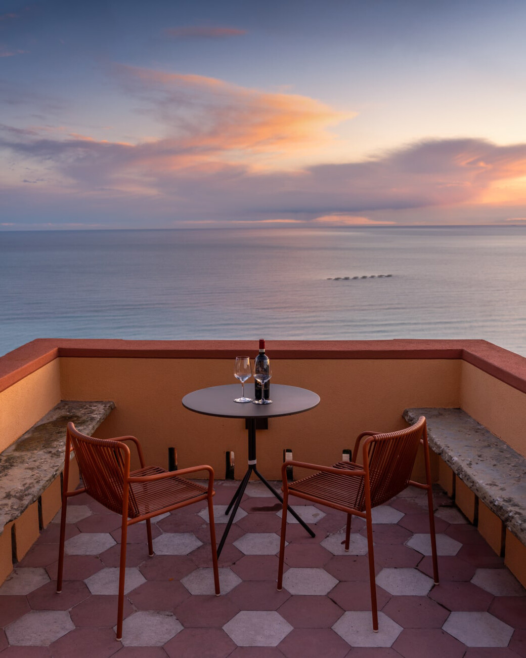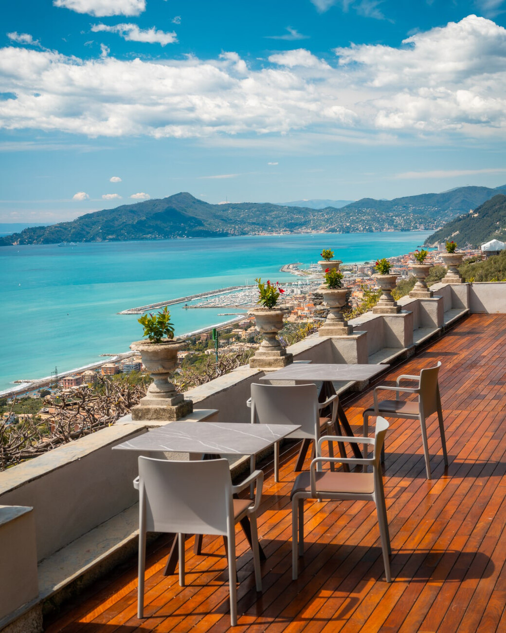 Passgenau können die Outdoor-Möbel aus dem Sortiment von Pedrali für das individuelle Projekt ausgewählt werden – wie für die Gäste des Villa Riviera Resort in Santa Giulia: Die Sessel und Lounges "Tribeca" von CMP Design bieten einen komfortablen Platz, während der Blick über die Weite der genuesischen Riviera schweift. Gefertigt aus einem schlanken Rohrrahmen mit einer luftigen gewebten Bespannung aus extrudiertem PVC mit Nylonkern erinnern diese formal an die klassischen Sixties-Terrassenstühle aus geflochtenem Stahl. Für die Farbgebung wurde ein warmes Terrakotta gewählt, das sich in den Details der Architektur der historischen Villen des Fünf-Sterne-Luxusresorts wiederfindet – wie der Wandfarbe oder den Fliesen. Den passenden Tisch haben CMP Design gleich mitgedacht: "Nolita", ein leichtes Modell mit drei Beinen aus Stahlrohr, dessen Platte sich bei Bedarf ganz einfach zu Seite klappen lässt. Aus den zahlreichen Ausführungen wurde die Version mit runder Platte in Anthrazit gewählt, die im Zusammenspiel mit "Tribeca" einen feinen Kontrast bietet. Die Gestaltung der Sessel "Volt" von Claudio Dondoli und Marco Pocci zeigt derweil angesichts der fantastischen Landschaft eine zurückhaltendes Ensemble mit klaren Linien aus Polypropylen. Passend zu dem industriellen Look wurden die Tische "Arki-Base" mit vier Beinen aus Stahlrohr und rechteckigem Querschnitt kombiniert.