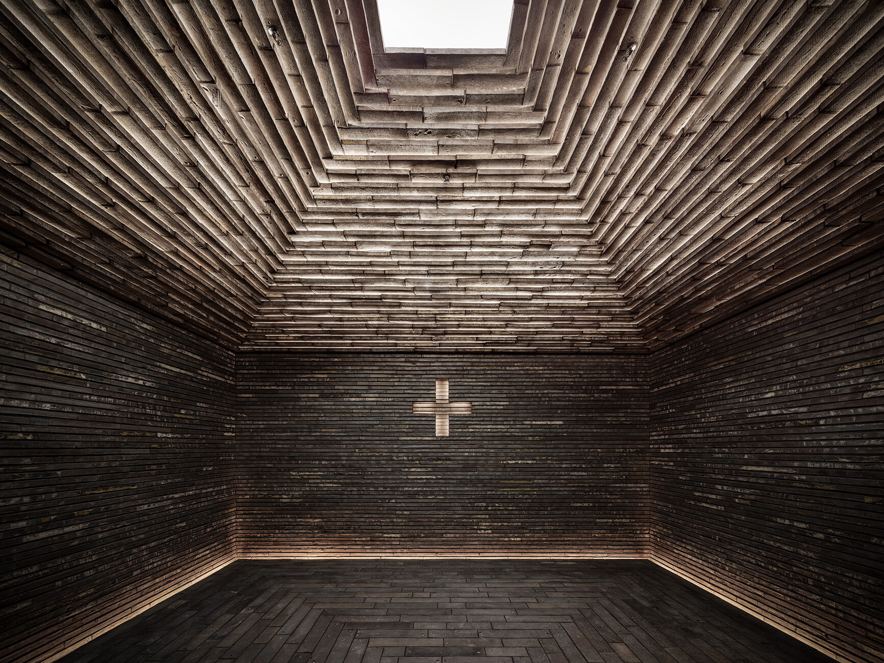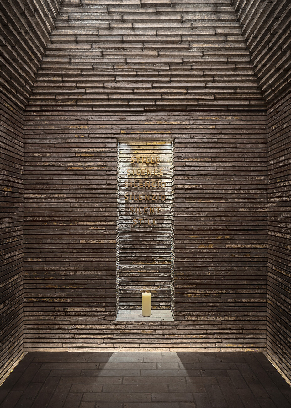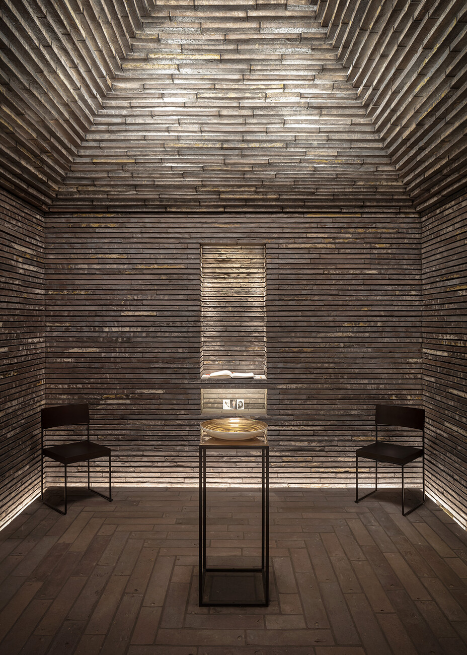 Wände, Boden und Gewölbe des Raums der Stille sind vollständig mit dunklen gebrannten "Kolumba"-Ziegeln von Petersen Tegl verkleidet. Ziegelsteine, die nicht nur eine jahrhundertelange Tradition Handwerkskunst mit sich bringen, sondern auch auf eine besondere Entstehungsgeschichte zurückblicken: "Kolumba" wurde 2000 als gemeinsames Projekt des Schweizer Architekten Peter Zumthor mit dem dänischen Hersteller für das Kolumba Museum in Köln entwickelt. Der Einsatz eines einzigen Materials lässt den Berliner Raum der Stille wirken, als sei er aus einem großen Stein herausgemeißelt. Durch leicht versetzte Versprünge im Gewölbe entsteht eine Pyramidenform, die jeweils durch ein indirekt beleuchtetes Okulus-Fenster abgeschlossen wird. "Der Ziegel verleiht dem Raum ein Gefühl von Ewigkeit und Geborgenheit. Die Zeit scheint in diesen Räumen stillzustehen, so dass man sich vollkommen auf seine Gedanken konzentrieren kann", erläutert Hans Joachim Paap, Architekt und Partner von gmp. Um die besondere Atmosphäre des Raums der Stille zu erreichen, war der Einsatz eines besonderen Materials fundamental. "'Kolumba' ist ein sehr schöner Ziegel mit einer fantastischen Oberfläche. Die warme, dunkelbraune Farbe schafft eine gute Atmosphäre", führt Paap weiter aus. "Jeder Stein ist einzeln hergestellt – man sieht deutlich die Fingerabdrücke, die entstanden sind, als die Steine aus ihrer Form genommen wurden. Der Ziegel verleiht dem Raum ein Gefühl von Ewigkeit und Geborgenheit. Die Zeit scheint in diesen Räumen stillzustehen, so dass man sich vollkommen auf seine Gedanken konzentrieren kann."