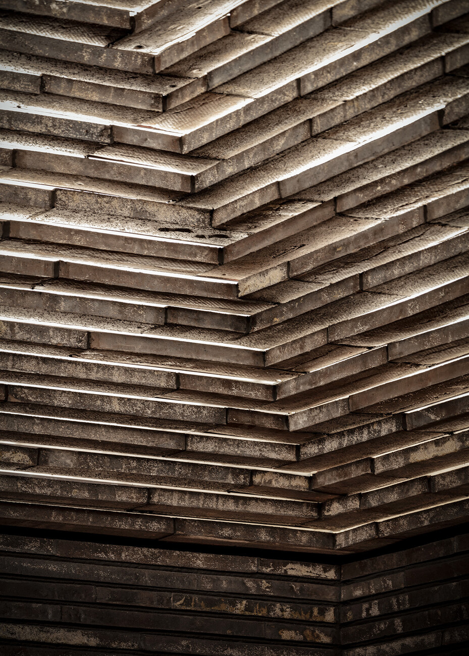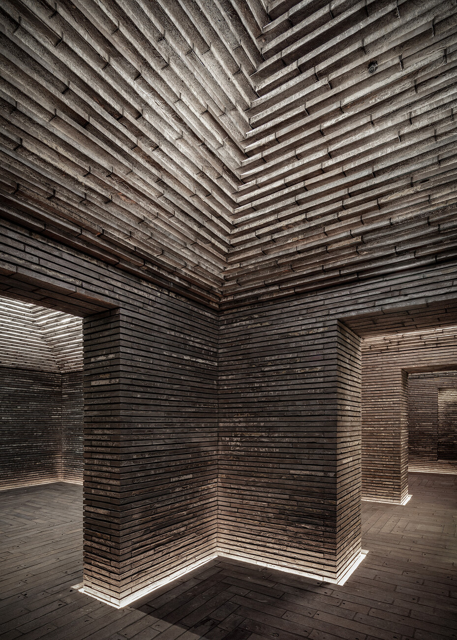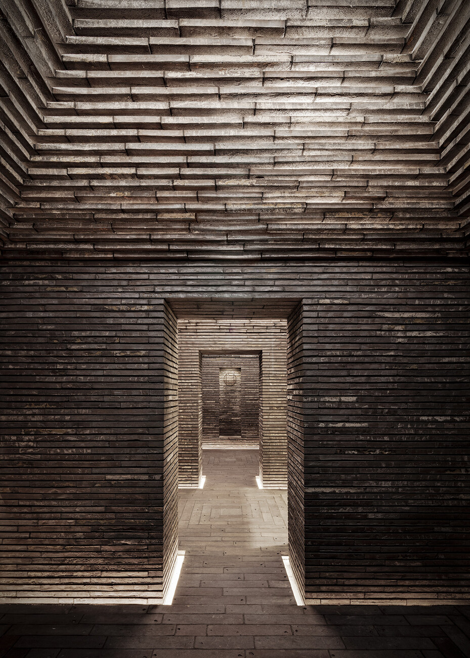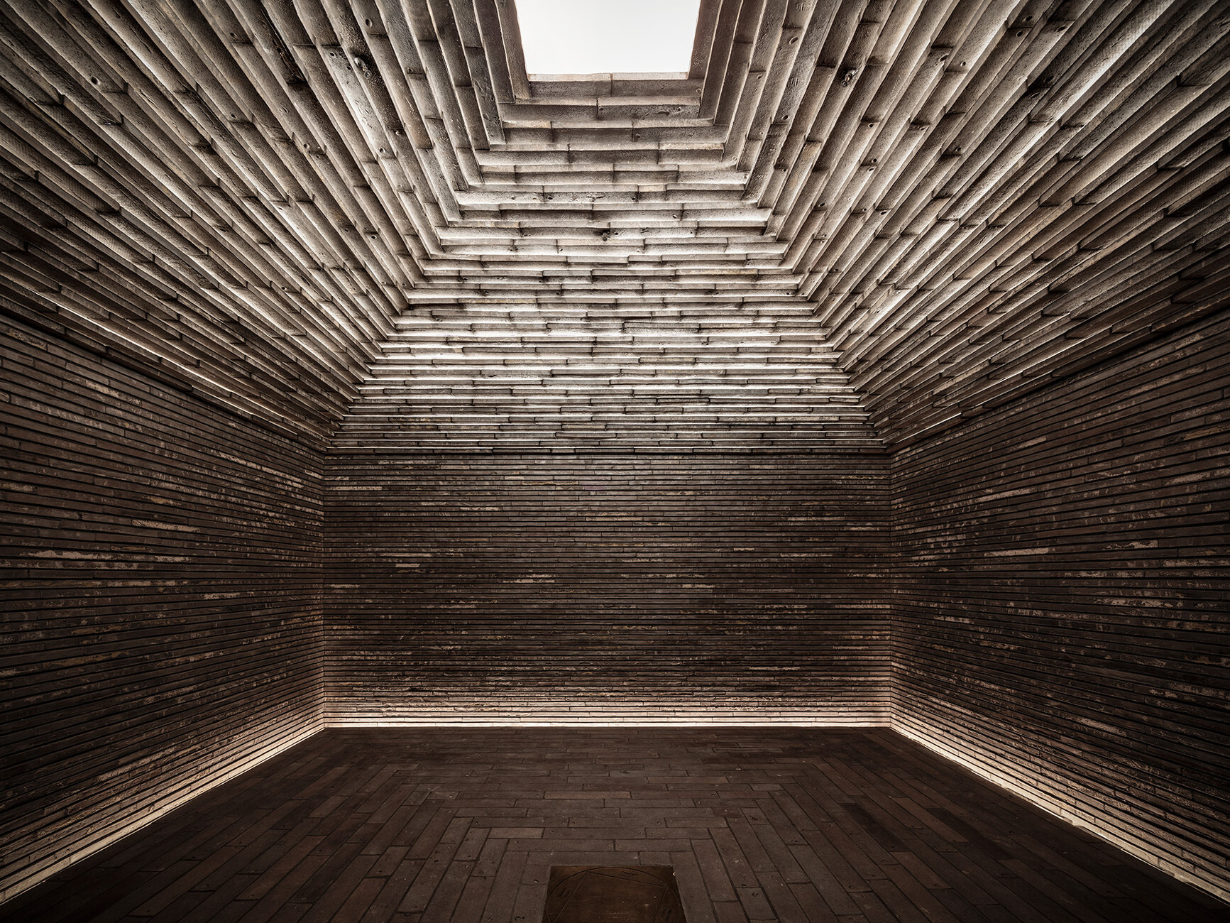 Wände, Boden und Gewölbe des Raums der Stille sind vollständig mit dunklen gebrannten "Kolumba"-Ziegeln von Petersen Tegl verkleidet. Ziegelsteine, die nicht nur eine jahrhundertelange Tradition Handwerkskunst mit sich bringen, sondern auch auf eine besondere Entstehungsgeschichte zurückblicken: "Kolumba" wurde 2000 als gemeinsames Projekt des Schweizer Architekten Peter Zumthor mit dem dänischen Hersteller für das Kolumba Museum in Köln entwickelt. Der Einsatz eines einzigen Materials lässt den Berliner Raum der Stille wirken, als sei er aus einem großen Stein herausgemeißelt. Durch leicht versetzte Versprünge im Gewölbe entsteht eine Pyramidenform, die jeweils durch ein indirekt beleuchtetes Okulus-Fenster abgeschlossen wird. "Der Ziegel verleiht dem Raum ein Gefühl von Ewigkeit und Geborgenheit. Die Zeit scheint in diesen Räumen stillzustehen, so dass man sich vollkommen auf seine Gedanken konzentrieren kann", erläutert Hans Joachim Paap, Architekt und Partner von gmp. Um die besondere Atmosphäre des Raums der Stille zu erreichen, war der Einsatz eines besonderen Materials fundamental. "'Kolumba' ist ein sehr schöner Ziegel mit einer fantastischen Oberfläche. Die warme, dunkelbraune Farbe schafft eine gute Atmosphäre", führt Paap weiter aus. "Jeder Stein ist einzeln hergestellt – man sieht deutlich die Fingerabdrücke, die entstanden sind, als die Steine aus ihrer Form genommen wurden. Der Ziegel verleiht dem Raum ein Gefühl von Ewigkeit und Geborgenheit. Die Zeit scheint in diesen Räumen stillzustehen, so dass man sich vollkommen auf seine Gedanken konzentrieren kann."