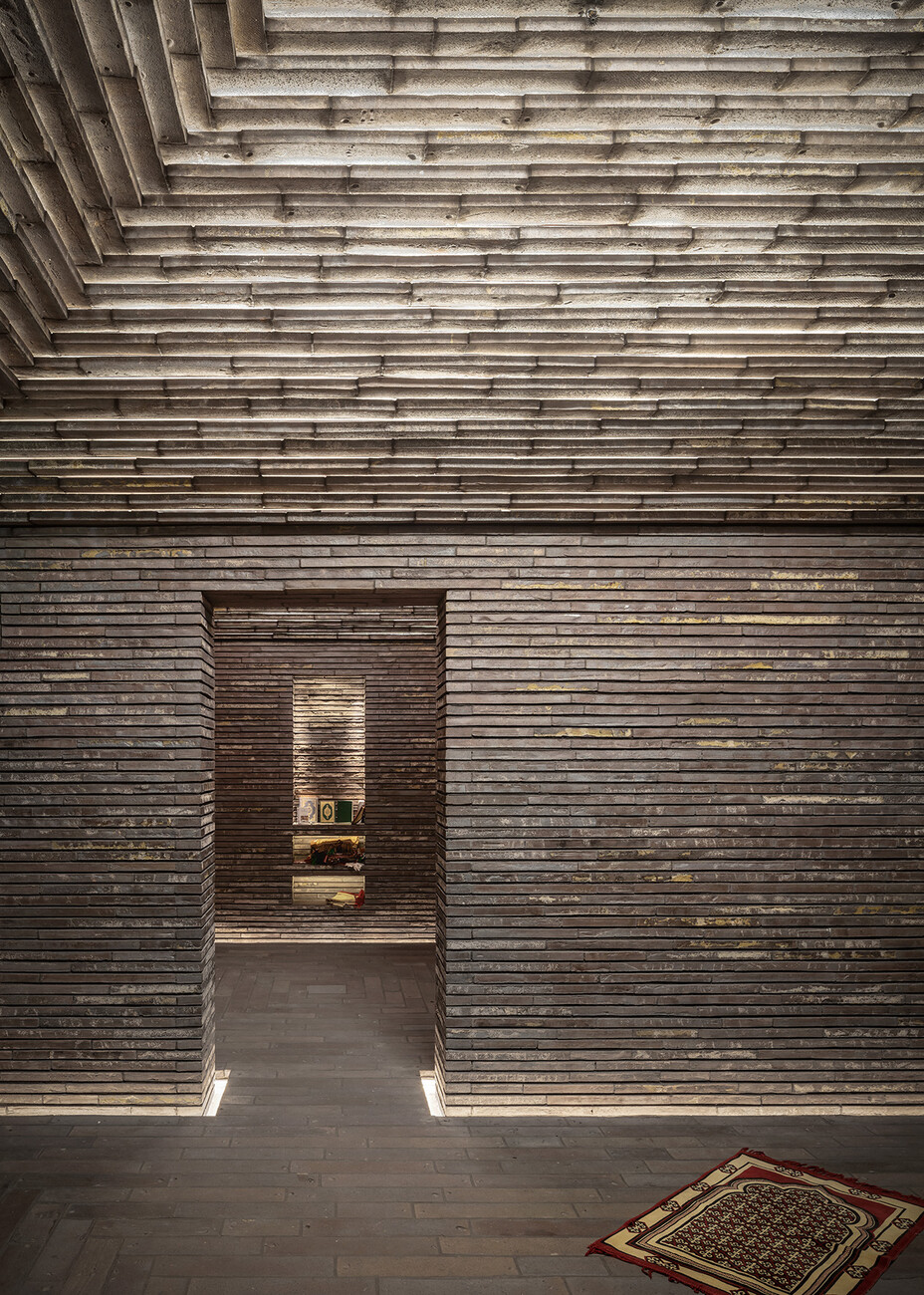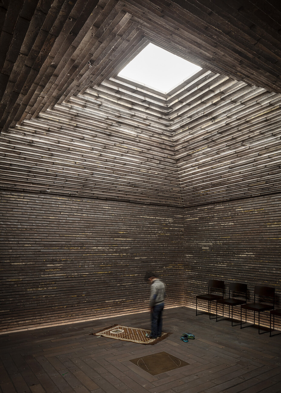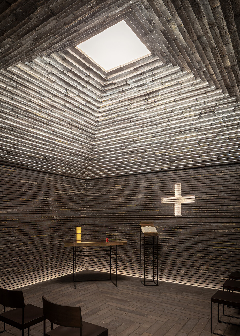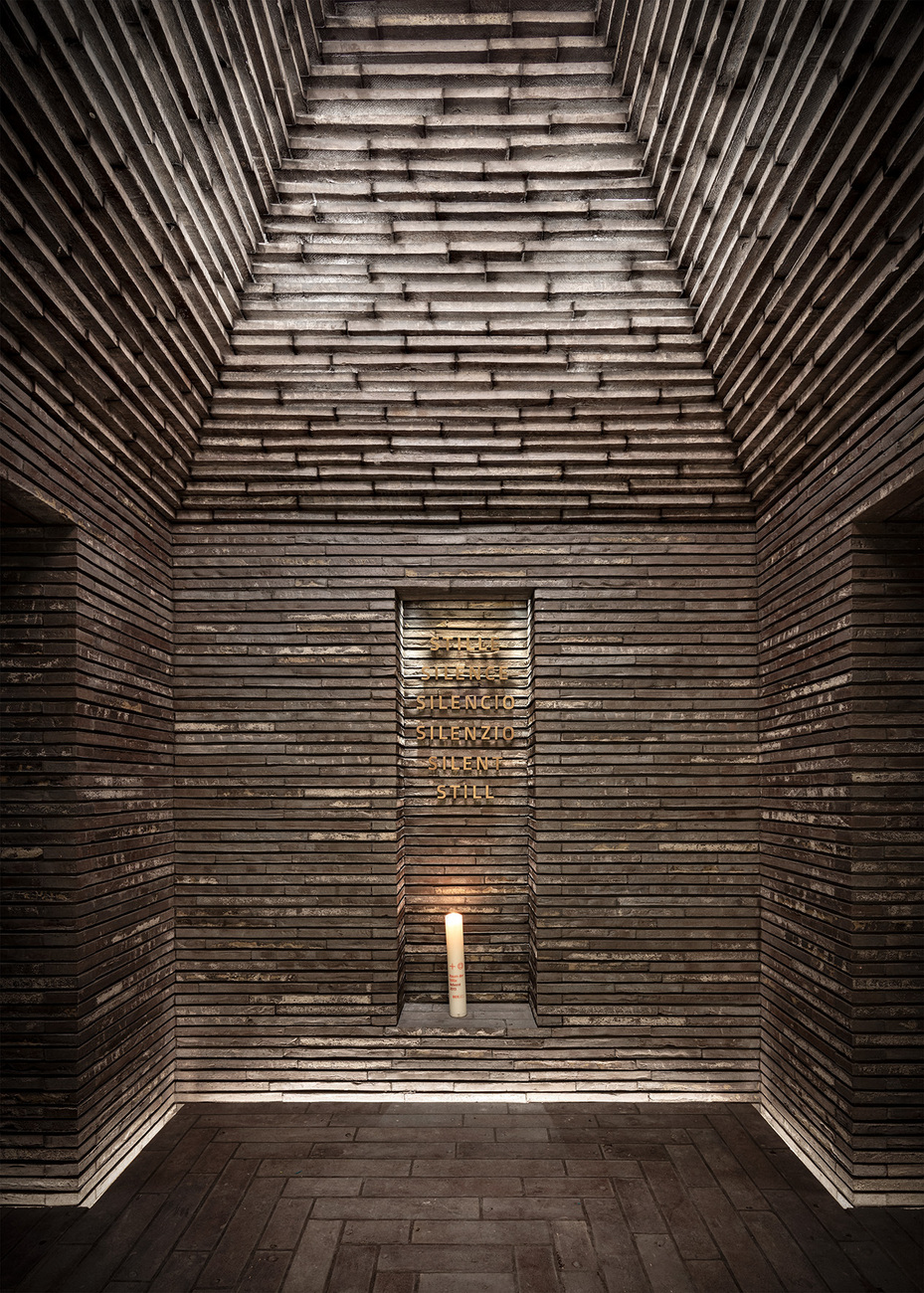 Die klar reduzierten Formen des "gemauerten" Raums der Stille wecken Assoziationen mit archaischen Bauten, mit frühchristlicher und islamischer Ziegelarchitektur. Darüber hinaus verknüpfen die Ziegel den Entwurf lokal: Auch in Berlin und Brandenburg herrscht eine lange Tradition von Ziegelbauten vor. Diese Referenzen tragen umso mehr zur symbolisch-spirituellen Ausdruckskraft des Entwurfs bei, die Paap herausstreicht: "Der Ziegelstein ist ein Ausdruck der grundlegenden Elemente für die menschliche Existenz: Feuer, Erde und Wasser." Vollständig wird die Wirkung des Raums der Stille durch ein durchdachtes Lichtkonzept, durch das die Ziegelräume ihre Wirkung erst voll entfalten können. Die Gewölbedecken bestehen aus immer kleiner werdenden quadratischen Rahmen aus Kolumba-Ziegeln, die an einer Stahlkonstruktion mit 2 Zentimetern Abstand zwischen den Rahmen befestigt sind. Die Fugen sind hinterleuchtet. Zusammen mit den Okuli und einem hinterleuchteten Spalt zwischen Wand und Boden, der die Orientierung im Raum erleichtert, tauchen sie die Räume in kontemplatives Licht. Die Steine scheinen sich fast aufzulösen, ein Effekt, wie man ihn etwa aus gotischen Kathedralen kennt.