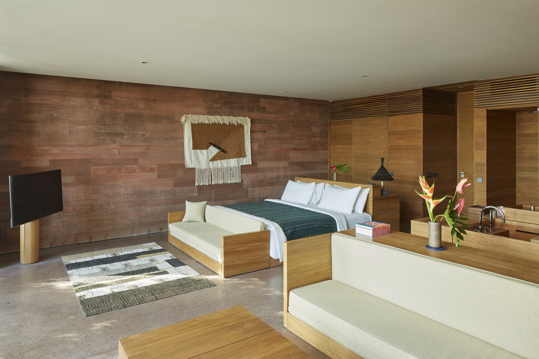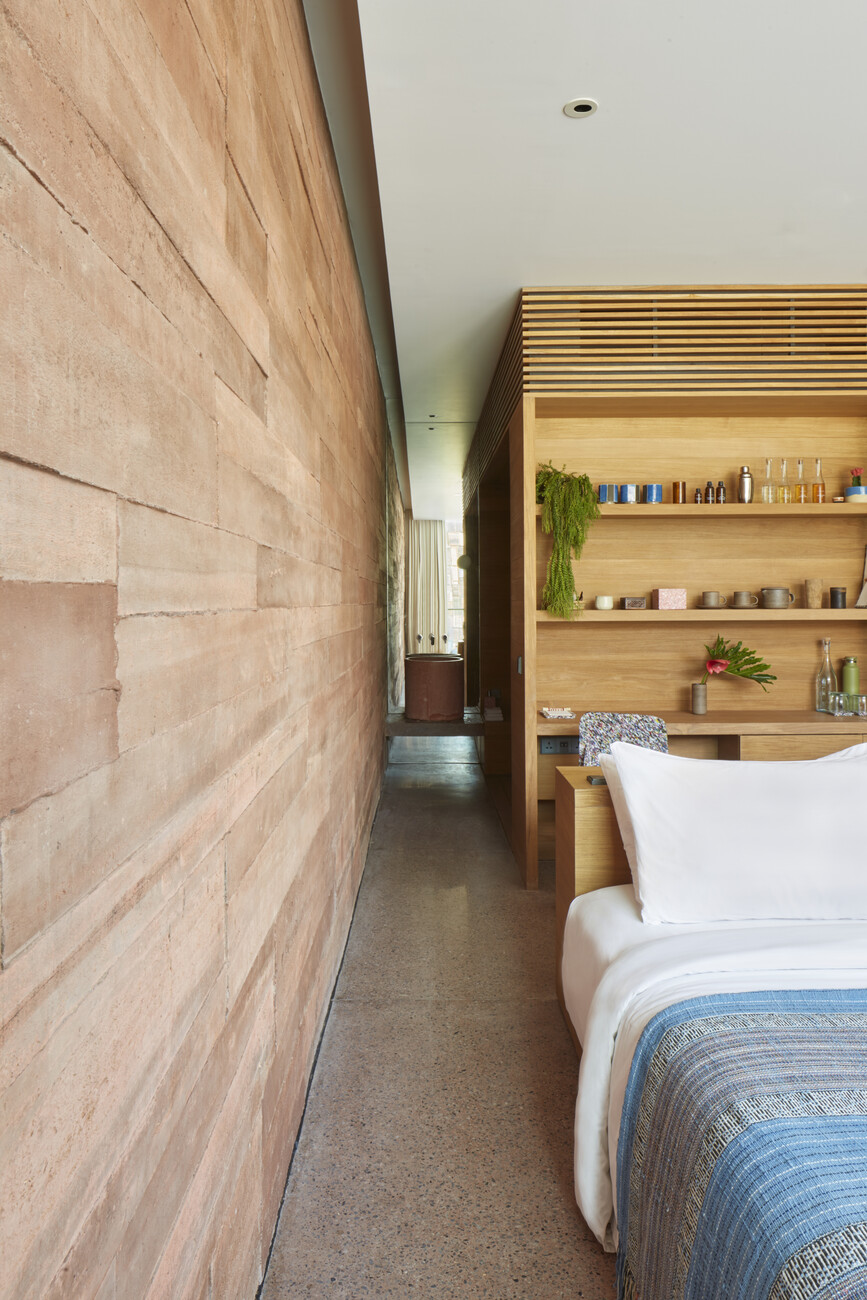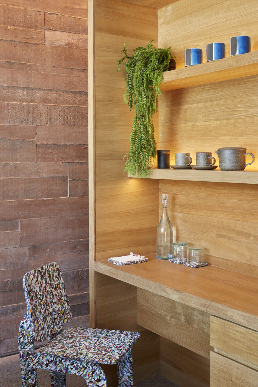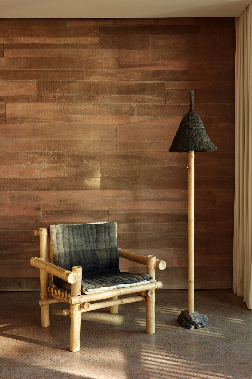 Mit ihrer Architektur beziehen sich die Architekten in verschiedener Hinsicht auf die lokale Baukultur. So verweist der Grundriss der Anlage auf die traditionellen indonesischen und balinesischen Hofhäuser. Das durchbrochene geometrische Ornament der Fassaden zum Innenhof, durch die das Licht in die dahinterliegenden Flure zu den Gästezimmern fällt, greift die Gestalt des balinesischen Tika-Kalenders auf. Dieser Kalender, dessen Jahr 210 Tage hat, bestimmt bis heute die Zeitrechnung auf Bali. In den 168 Gästezimmern wird der Raumeindruck vom rotgefärbten Beton der Wände, dem Terrazzo als Bodenbelag und dem minimalistisch gestalteten Mobiliar aus Teak dominiert. Akzente setzen Einzelmöbel, die die britischen Avantgardedesigner Max Lamb und Faye Toogood entworfen haben und die von örtlichen Kunsthandwerkern sowohl aus traditionellen Materialien als auch recyceltem Kunststoff gefertigt wurden.