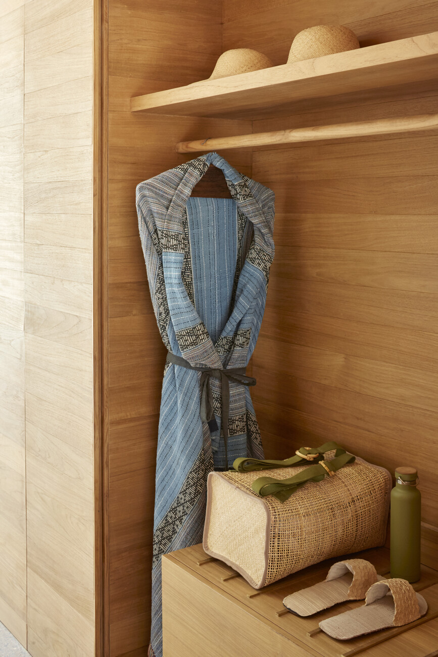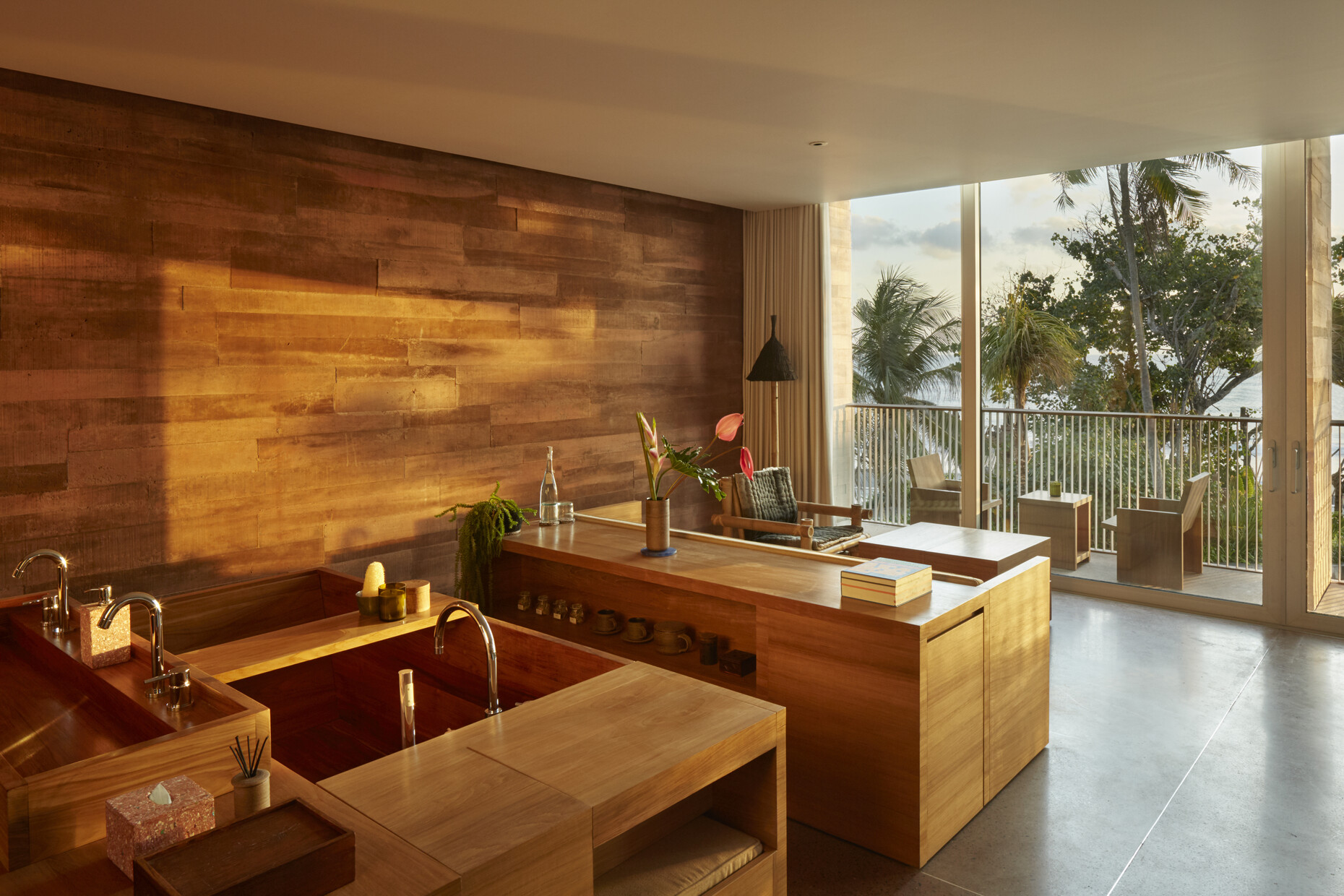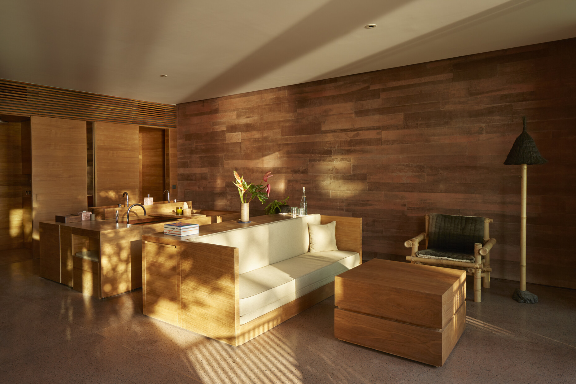 Mit ihrer Architektur beziehen sich die Architekten in verschiedener Hinsicht auf die lokale Baukultur. So verweist der Grundriss der Anlage auf die traditionellen indonesischen und balinesischen Hofhäuser. Das durchbrochene geometrische Ornament der Fassaden zum Innenhof, durch die das Licht in die dahinterliegenden Flure zu den Gästezimmern fällt, greift die Gestalt des balinesischen Tika-Kalenders auf. Dieser Kalender, dessen Jahr 210 Tage hat, bestimmt bis heute die Zeitrechnung auf Bali. In den 168 Gästezimmern wird der Raumeindruck vom rotgefärbten Beton der Wände, dem Terrazzo als Bodenbelag und dem minimalistisch gestalteten Mobiliar aus Teak dominiert. Akzente setzen Einzelmöbel, die die britischen Avantgardedesigner Max Lamb und Faye Toogood entworfen haben und die von örtlichen Kunsthandwerkern sowohl aus traditionellen Materialien als auch recyceltem Kunststoff gefertigt wurden.