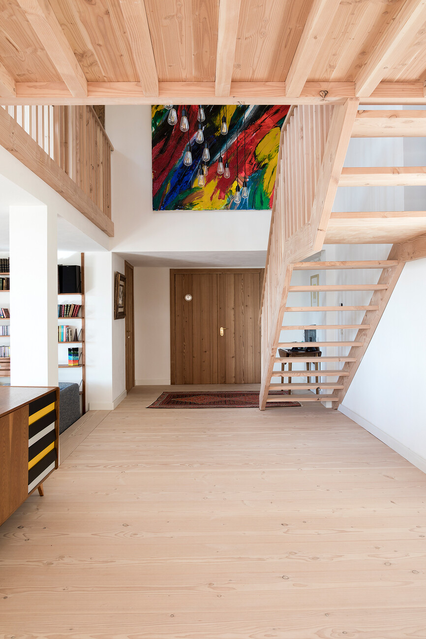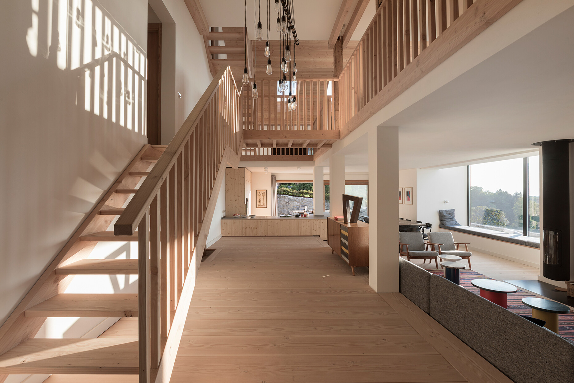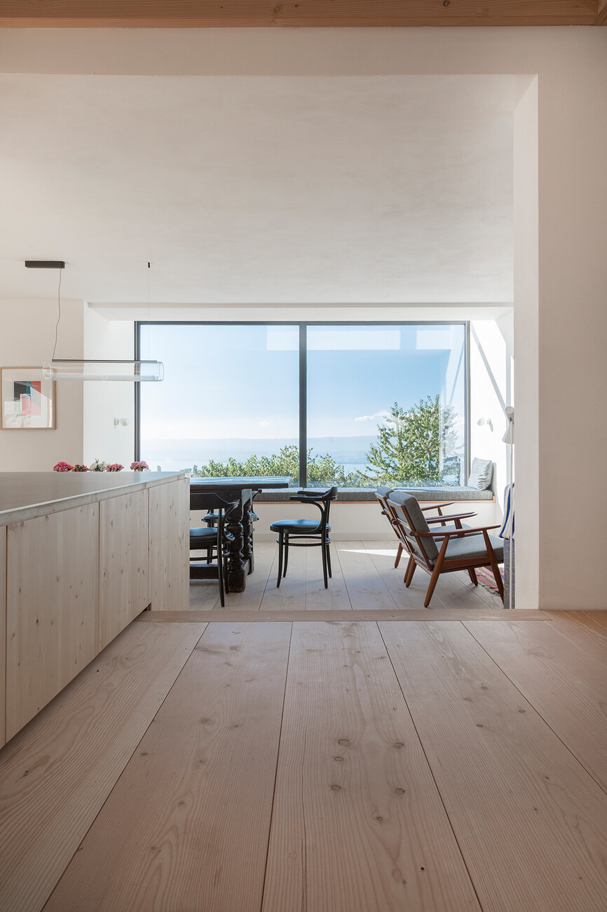 Bereits der Vorbesitzer hatte die landwirtschaftlich genutzten Teile des Hauses zu Wohnräumen ausgebaut und dabei den kleinen Bauernhof in ein etwas kitschiges Chalet verwandelt – ein Stil, der so gar nicht dem Geschmack der heutigen Eigentümer entsprach. Zudem war bei diesem ersten Umbau der Übergang zwischen altem und neuen Teil nicht zufriedenstellend gelöst worden. So beschlossen die neuen Besitzer, das Gebäude noch einmal tiefgreifend umzugestalten. Sie entkernten das Haus weitgehend, legten eine neue Treppe an und vergrößerten die Fenster, um mehr Licht in die Räume zu lassen. Im Inneren verschwanden die pseudo-alpinen Holzverkleidungen und Balustergeländer, die im ersten Umbau montiert worden waren. Stattdessen schufen die neuen Eigentümer einen großen Wohn- und Essraum mit offener Küche und Galerieebene. Alles wirkt hell und großzügig. Viele bodentiefe Fenster holen das See- und Alpenpanorama in die Räume hinein.
