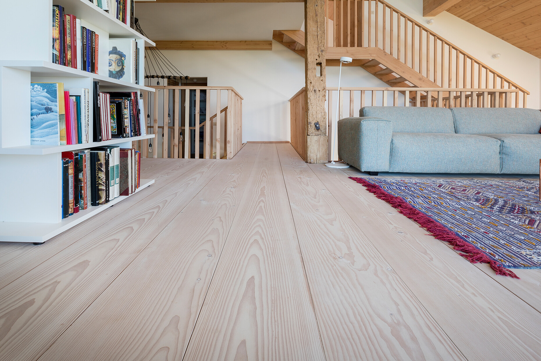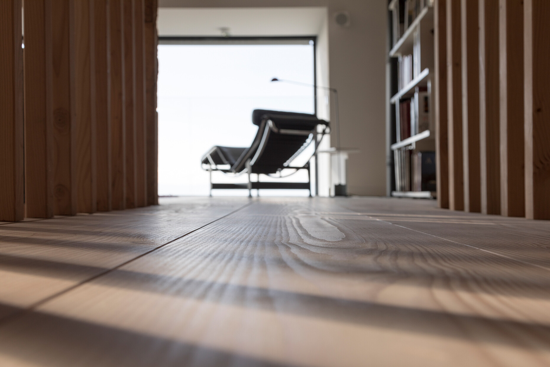 Ganz wesentlich zum neuen Raumeindruck tragen auch die Bodendielen von pur natur bei. Sie ersetzen die zuvor verlegten Terrakottafliesen, die nicht recht zum Wesen des Hauses passten. Die neuen Hauseigentümer wünschten sich offenporiges Holz für den Fußboden und eine Verarbeitung, die die Natürlichkeit des Materials klar erkennbar lassen sollte. Außerdem planten sie, durch die Verwendung raumlanger Dielenbretter den großzügigen und fließenden Charakter des Hausinneren noch einmal zu unterstreichen. Der neue Holzboden von pur natur besteht aus massiven Douglasiendielen. Sie wurden aus teils über 100 Jahre alten Bäumen gefertigt, die in Deutschland geschlagen und anschließend sorgfältig und schonend getrocknet wurden. Durch die Behandlung mit weißer Bodenseife wurde das Holz noch heller und ebenmäßiger. So tritt der Boden optisch etwas zurück und setzt dadurch die spektakuläre Landschaft vor den Fenstern noch stärker in Szene. Trotzdem verliert er seine reizvolle Ausstrahlung nicht, die dem Haus viel optische Wärme und Atmosphäre verleiht.