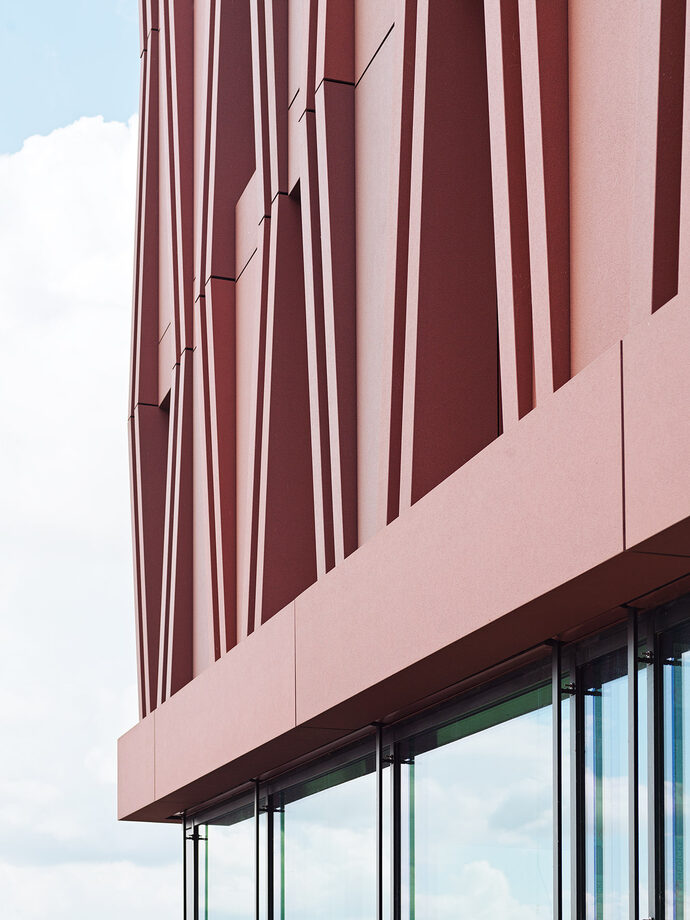 Das Architekturbüro Auer Weber hat diese für die Fassade des "PREVIER" aufgegriffen: Rund 17.000 Quadratmeter Großformatplatten und dreidimensionale formparts sind in der Kooperation mit Rieder entstanden, für die eigens sechs Rot-Abstufungen kreiert wurden. Eine individuell gestaltete, langlebige und wetterfeste Gebäudehülle, die es mit dem rauen Wetter der Hansestadt aufzunehmen weiß. Im Detail wurden gut 2.645 vertikale Lisenen im Doppel-U-Profil gefertigt, die als stilprägende Merkmale den Bau passend zu den zahlreichen schmalen Fenstern optisch gliedern. Dazu kamen 2.500 horizontale Brüstungsprofile in U-Form und 1.500 Quadratmeter Platten. Aus den zahlreichen Elementen entstand so eine monolitische Gebäudehülle, die dank der sanften Dynamik der formparts und concrete skin Platten von Rieder eine moderne Ästhetik hat. Diese sind auch haptisch spannend: Die vertikalen Lisenen wurden in den unterschiedlich stark sandgestrahlten Oberflächen "ferro light", die horizontalen Brüstungen in "ferro plus" realisiert.