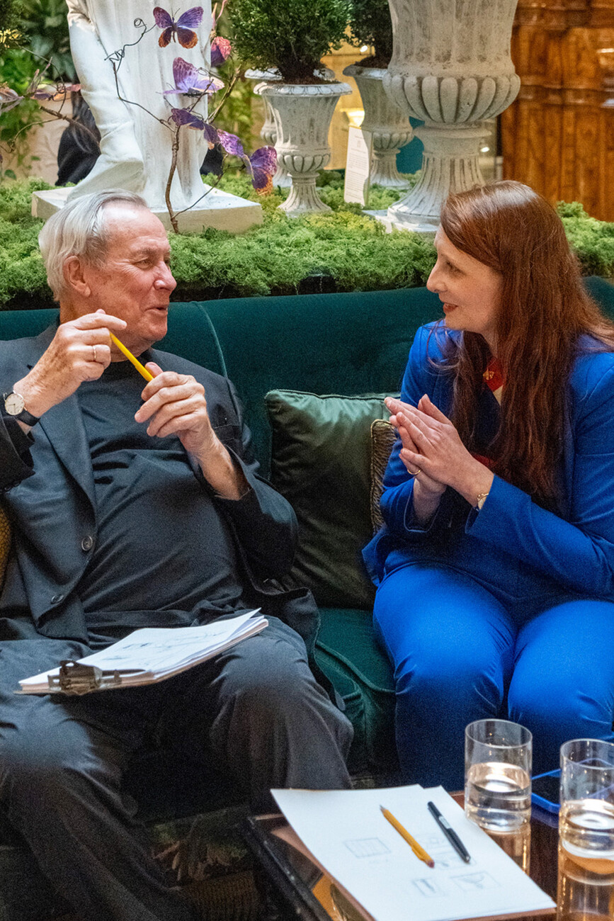 Robert Wilson: Das ist auch eine Frage der Balance. Wir müssen sie zulassen, das ist alles. Schauen Sie: Draußen vor dem Gebäude steht ein Baum, er hilft das Gebäude zu sehen und das Gebäude hilft den Baum zu sehen. Das Ganze ist eine Choreografie: Die Menschen, die auf dem Gehsteig laufen, der Autos, die auf der Straße fahren, dem starren Gebäude und den sanften Bewegungen der Blätter am Baum. Alles passiert gleichzeitig. Im klassischen griechischen Theater gibt es einen Protagonisten und einen Antagonisten sowie einen Chor. Im klassischen Ballett gibt es eine Primaballerina und ein Corps de ballet. Die Kunst besteht darin, diese natürliche Balance künstlich zu konstruieren. In der Musik kann man Szenen parallel in unterschiedlichen Tempos erzeugen. Jedes Gegenteil trifft auf sein Gegenteil. Man kann zudem von einem zum nächsten wechseln, das nennt man Thema und Variation. KomponistInnen, ChoreografInnen, ArchitektInnen nutzen das. Es ist eine Konstruktion, die sich in der letzten Sekunde noch ändern kann. Jede Entscheidung bewirkt eine Veränderung. Was kommt zuerst? Was kommt zuletzt? Ein Beispiel: Die Balletttänzerin Margot Fonteyn war 43 Jahre alt, als sie mit Rudolf Nureyev auftrat, der zu der Zeit 23 Jahre alt war. Das Publikum applaudierte stehend 30 Minuten nach ihrem Auftritt, aber sie sagte zu ihm, nochmal werde ich so nicht mit dir tanzen wollen. Warum? Er hatte die Balance nicht gehalten, ihr keinen Raum für kleine Pausen gegeben, die aber mit Blick auf den unterschiedlichen Energiehaushalt der beiden wichtig gewesen wären. Es geht um das Gesamtbild, die Zeit und den Raum gut zu nutzen. Zu wissen, was man erreichen möchte und was es dafür braucht. Versuchen Sie sich das vor Augen zu halten, wenn Sie im Theater sind. Es ist eine Gesamtkonstruktion aus Zeit und Raum.