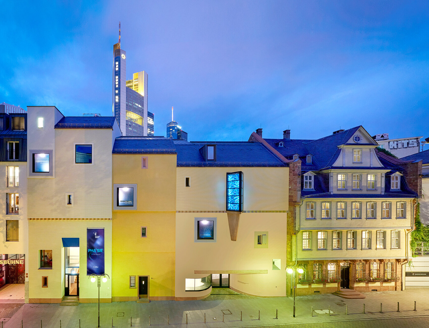 An seiner Stelle ist nun ein dreigeteilter Bau entstanden: "Wir wollten das Goethe-Haus nicht mit einem Neubau erschlagen. Daher haben wir aus einem Haus drei Häuser gemacht, drei Fassaden und drei Eingänge in die Eingangshalle des Romantik-Museums, in die Wechselausstellung sowie einen vertikalen Eingang für die Schulklassen zu den Räumen der Kunstvermittlung", erklärt Prof. Mäckler. Die Dreiteilung der Fassade mit jeweils eigener Putzstruktur, unterschiedlichen Fensterformen, Friesen und Traufhöhen im Übergang zum Schieferdach lockert den Bau auf und schafft eine neue Dynamik im Gesamtbild, die der vorher leblos wirkende Gasse einen neuen Glanz verleiht. Die Farbgebung in sanften Gelbtönen ist wie die Fassadentypologie selbst an das Goethe-Haus angelehnt, so dass sich ein fließender Übergang von Alt und Neu ergibt. Harmonisch wirkt auch das Zusammenspiel mit der Architektur von Michael Landes, der neben dem städtebaulichen Konzept die Gestaltung der Goethe-Höfe, des Cantate-Saals der Volksbühne und der angrenzenden Wohnungen übernommen hat. Ein Tunnelbauwerk an der Gartenmauer des Goethe-Hauses verbindet darüber hinaus die Räume der Wechselausstellung mit dem Magazin in den Kellerräumen des Freien Deutschen Hochstifts.