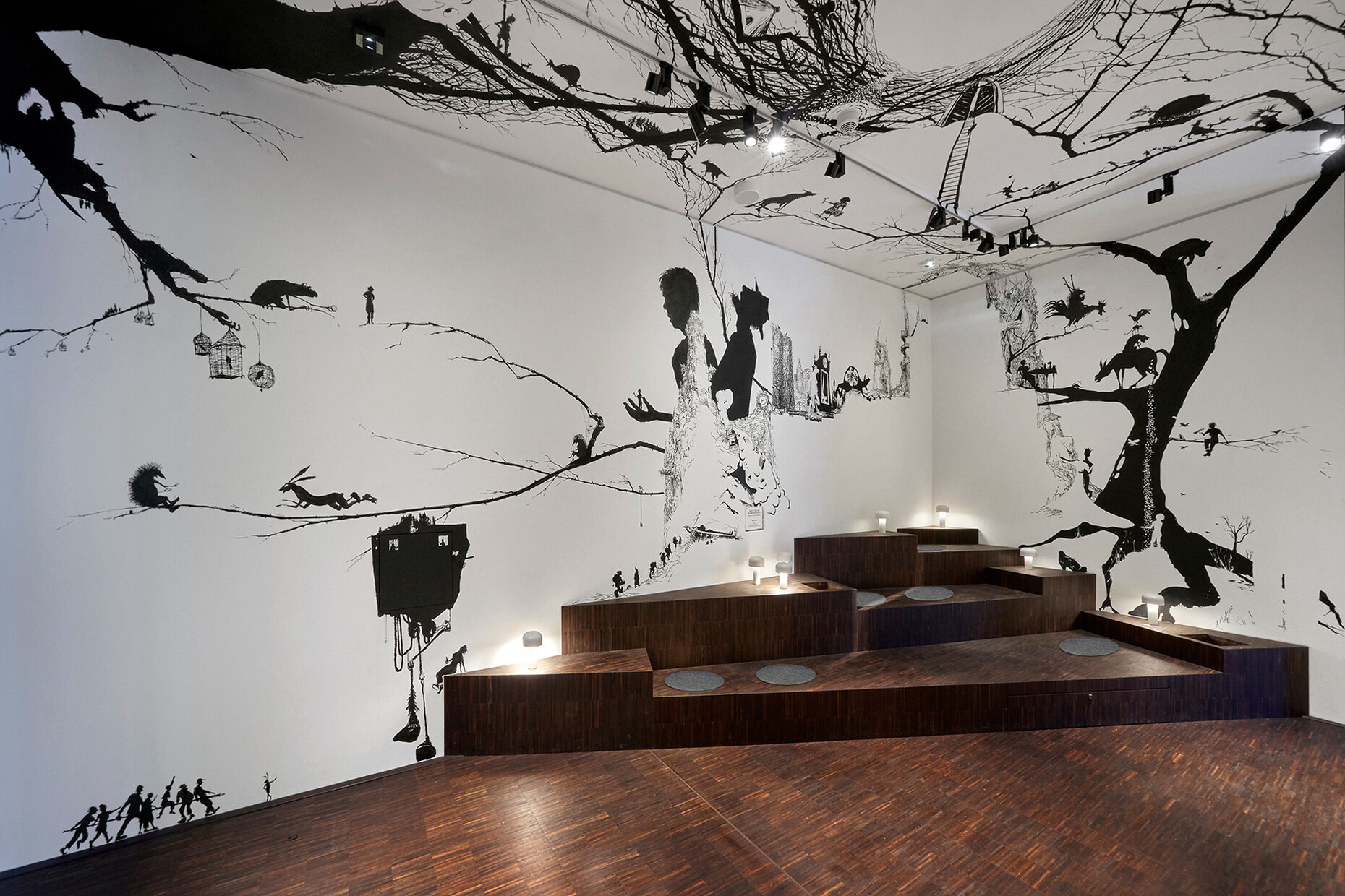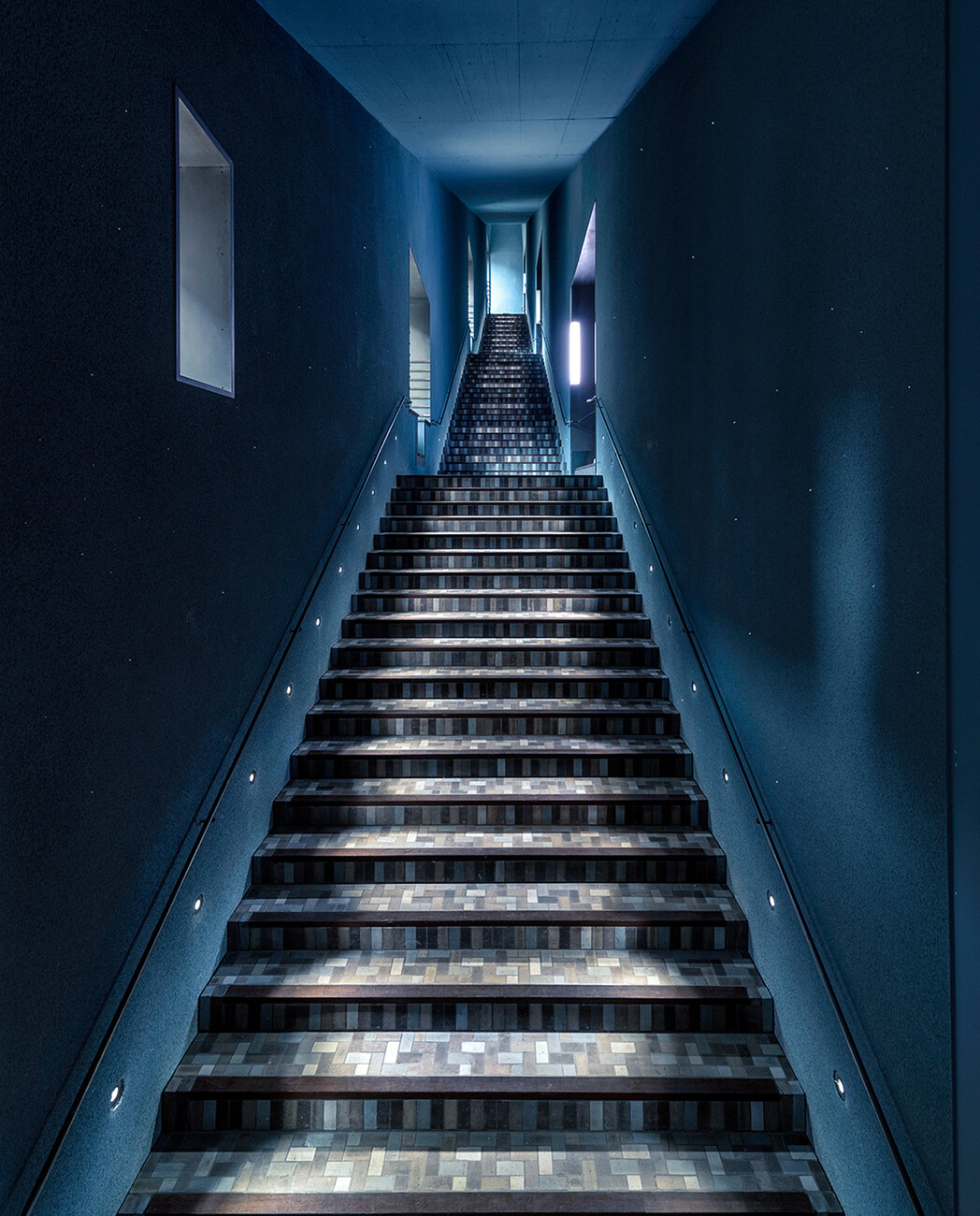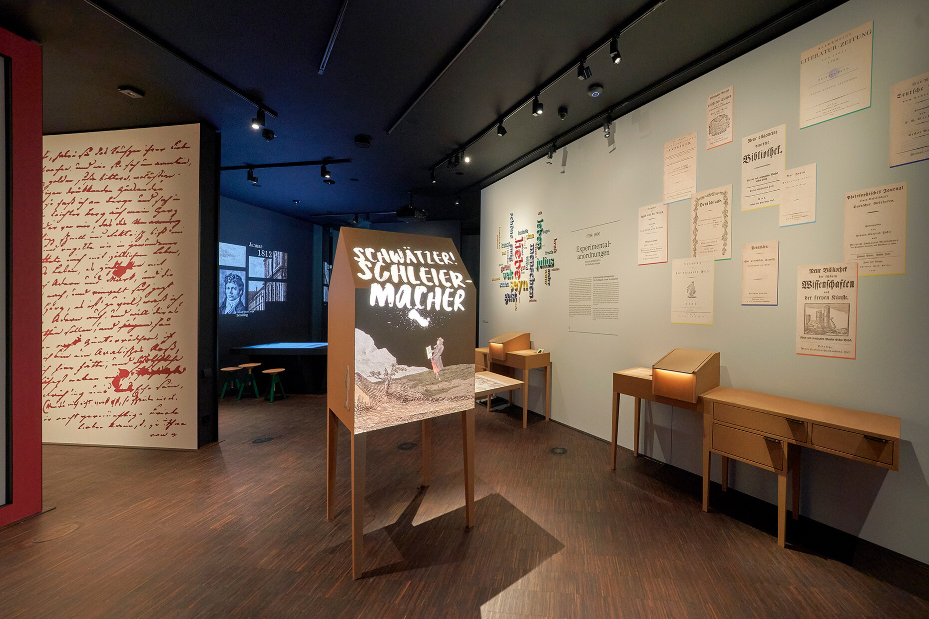 Zum Wohlbefinden im Raum gehört auch das Tageslicht, dass im Fall des Romantik-Museums allerdings zugleich auch ein Feind der empfindlichen Exponate ist, die unter UV-Strahlung und hohen Lux-Werten schnell Schaden nehmen würden. Wie baut man also ein Museum, das im Grunde kein Licht zulassen darf, ohne dass es zu einem fensterlosen Bunker wird? Die Lösung findet sich im Verlauf der Haupttreppe, die ihren Platz hinter der Straßenfassade des Hauses hat. Drei große Fenster liegen so alleine auf Höhe der Zugänge zu den Dauerausstellungen, darüber hinaus gibt es unter anderem ein Gaubenfenster, drei Erkerfenster und zwei blinde Fenster. Die Ausstellungsstücke befinden sich hingegen geschützt in den Räumen, die von der Treppe zum Hof abgehen und für die das atelier deLuxe ein Lichtkonzept erdacht hat, welches eine ruhige Atmosphäre schafft und Orientierung gibt. Schon die Treppe selbst ist eines der Highlights des Baus und trägt mit gutem Grund den Namen "Himmelstreppe": Ganz in dunkles Blau getaucht, täuscht sie die Illusion von Unendlichkeit vor. Ihre Form verjüngt sich nach Oben, die Leuchten und Eingänge zu den Ausstellungsräumen werden kleiner. Der Kratzputz an den Wänden des Aufgangs verstärkt die Tiefenwirkung zusätzlich. Die Illusion als wichtiger Bestandteil der Romantik erhält so eine Referenz in der Architektur. Überhaupt zieht Mäckler mit vielen architektonischen Elementen die Linie zum Thema des Museums: "Es ist ein sehr romantisches Gebäude, weil es mitspricht in unserer romantischen Erzählung. Wir haben uns diese Unterstützung durch die Architektur gewünscht und das ist wunderbar gelungen", so die Chefkuratorin und Direktorin des Freien Deutschen Hochstifts, Prof. Dr. Anne Bohnenkamp-Renken. 35 interdisziplinäre Stationen bietet die Dauerausstellung, die alle aus einem Objekt der umfangreichen Sammlung des Deutschen Hochstifts entwickelt wurden. Diese sind mal narrativ, mal erklärend aufgebaut und chronologisch geordnet, viele spannen untereinander Bezüge. Die Form der Präsentation ist dabei multimedial angelegt.