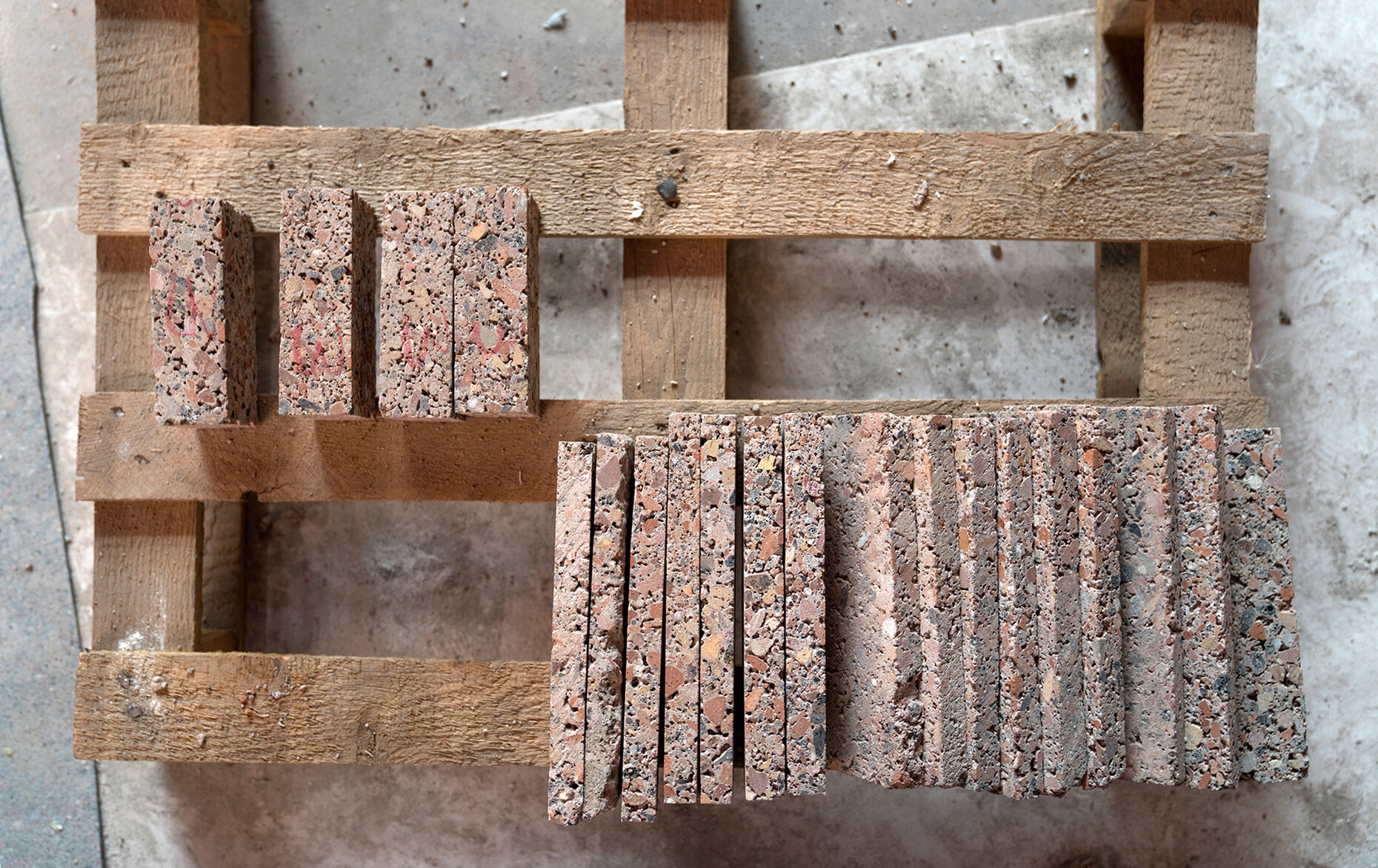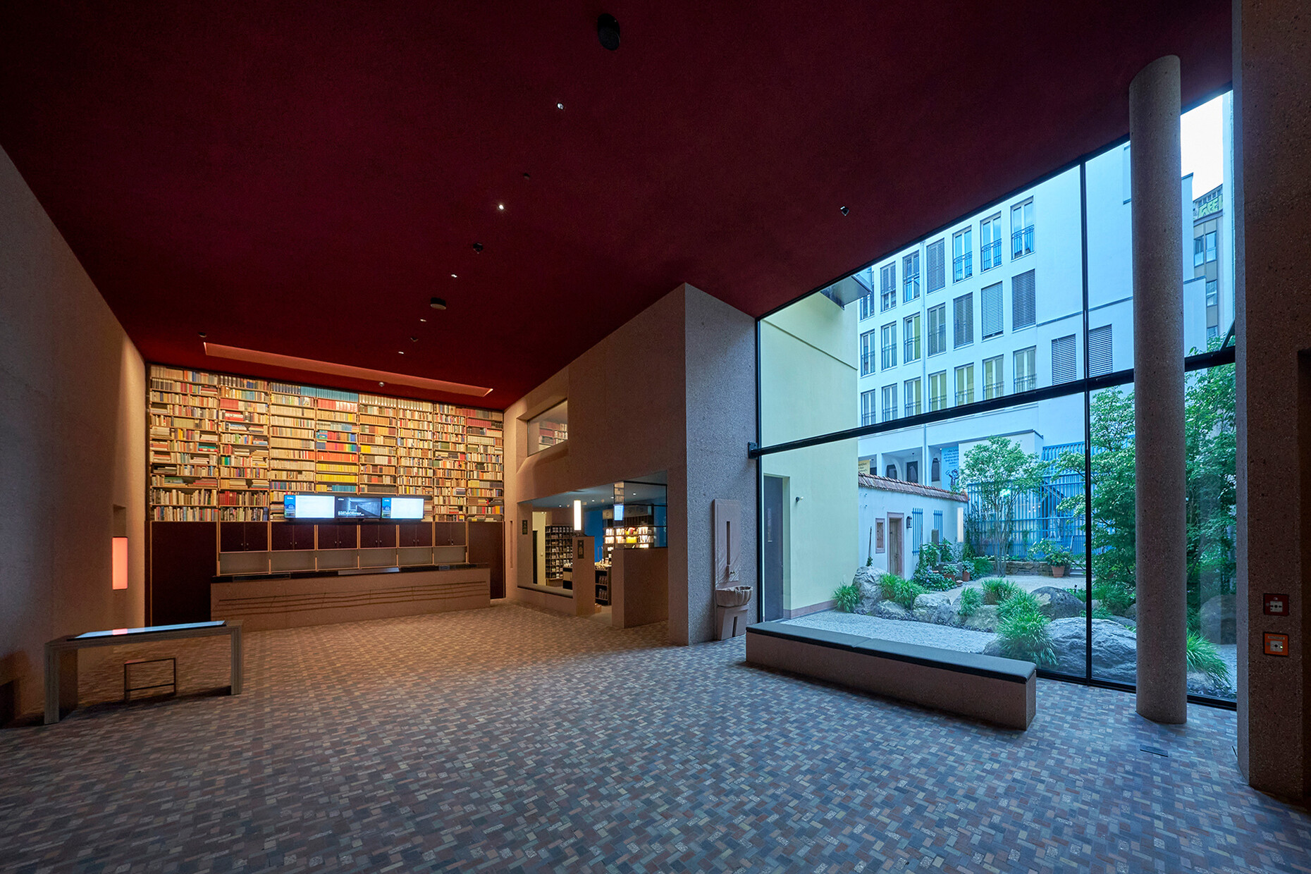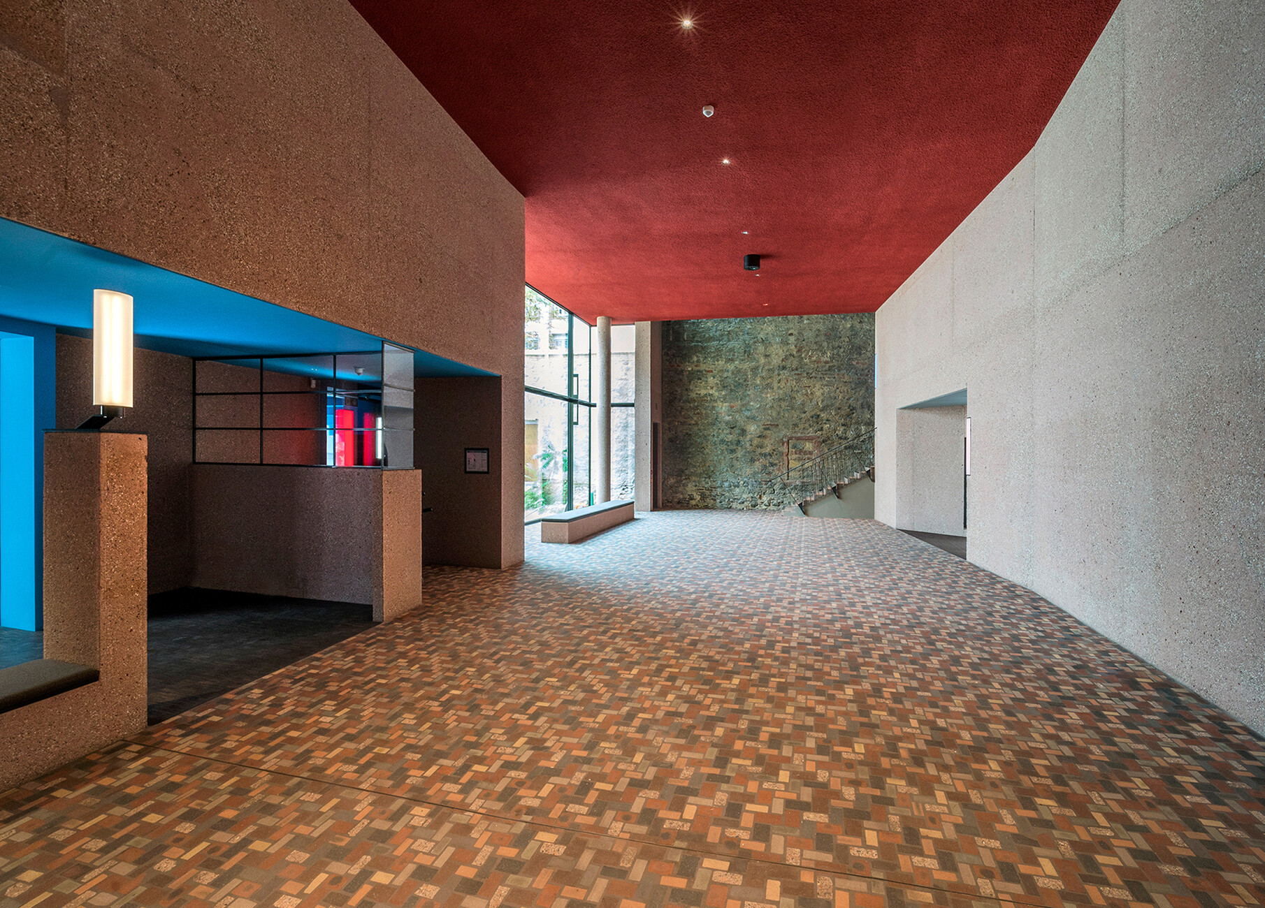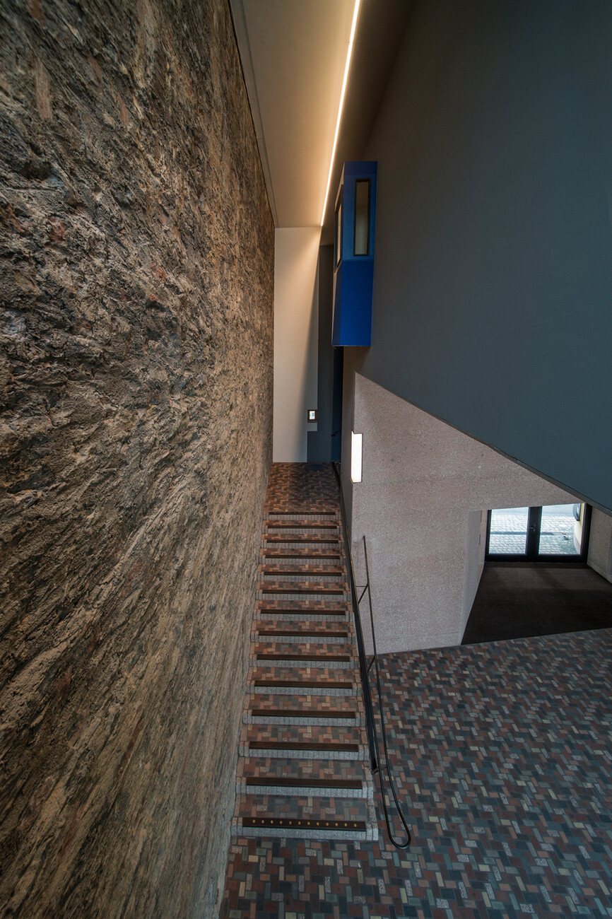 Dass Prof. Christoph Mäckler die Geschichte der Stadt und ihrer Bauten zu schätzen weiß und sich intensiv mit ihr auseinandersetzt, zeigt sich schon beim Betreten des Museums in einem besonderen Detail: Der Bodenbelag im zweigeschossigen Foyer besteht aus Steinen des abgerissenen Hauses, aufbereitet von der Trümmerverwertungsgesellschaft, einem gemeinnützigen Unternehmen, das bereits die Trümmer nach dem Krieg wiederverwertete, um Frankfurt wieder aufzubauen. Dank der unterschiedlichen Gesteinsarten wirkt der Boden nun wie ein Terrazzo. Auch auf die Wände des Foyers lohnt ein zweiter Blick, denn dem Beton wurde mit kleinen Natursteinen in unterschiedlichen Mischungen sowie Pigmenten eine natürliche Optik verliehen, die an den Ort referiert. An manchen Stellen ist der Beton mit dem Stockhammer so lange bearbeitet worden, bis der Naturstein zum Vorschein kam. Im Zusammenspiel mit der Brandmauer des Goethe-Hauses stehen die Oberflächen so miteinander im Einklang – alle sind verwoben mit dem Ort und einem Stück Stadtgeschichte. "Die Materialität und die Farbigkeit von Gebäuden hat einen großen Einfluss auf das Wohlbefinden im Raum", so Mäckler.