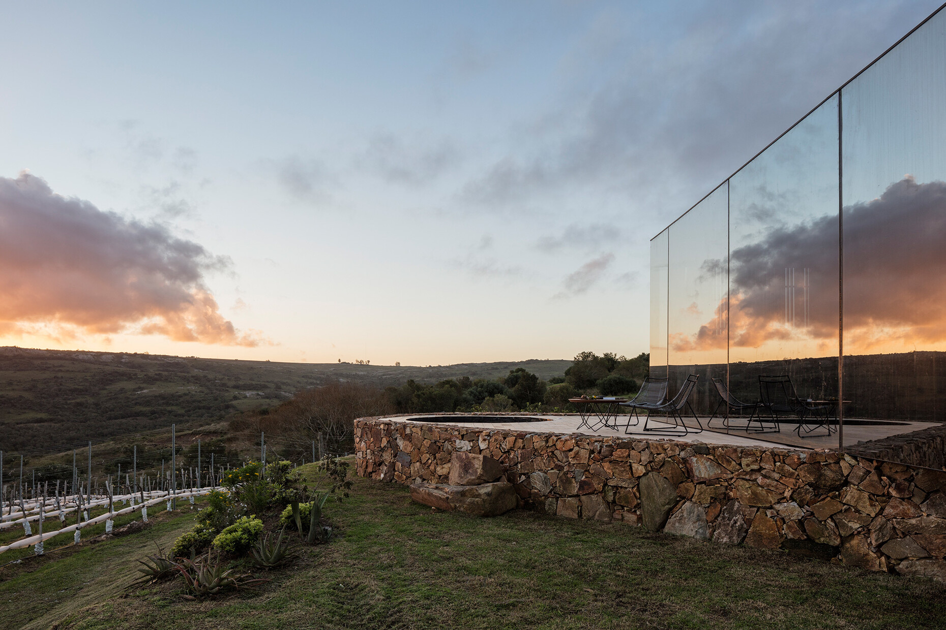 In die außergewöhnliche Kulturlandschaft haben MAPA Architekten das Sacromonte Landscape Hotel eingebettet. Es besteht aus insgesamt 13 Bungalows, die an den landschaftlich reizvollsten Plätzen des Areals errichtet wurden. Alle diese container-artigen Pavillons wurden industriell in Montevideo aus Stahlrahmen vorfabriziert und anschließend nach Sacromonte gebracht. Dort wurden sie auf organisch geformten Podesten, die aus dem örtlichen Stein gemauert sind, aufgestellt.