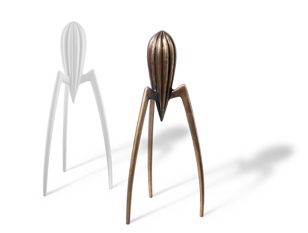 Die „Traumfabrik“ – wie die Firma Alessi auch genannt wird – bringt zu diesem Anlass die einer Rakete, einer Raumkapsel oder einer Spinne ähnelnde Zitronenpresse in zwei Sondereditionen heraus: Mit einem mattweißen Keramiküberzug oder in einer auf 299 Exemplare limitierten Edition aus schwerer, gegossener Bronze. Womit womöglich abermals betont wird, dass es sich bei diesem Gerät um einen Zwitter handelt, der Zweck und Zweckfreiheit in sich vereint. (mm)