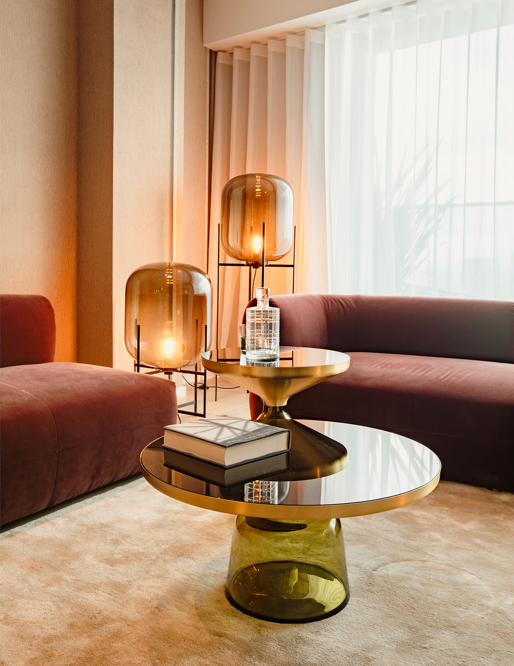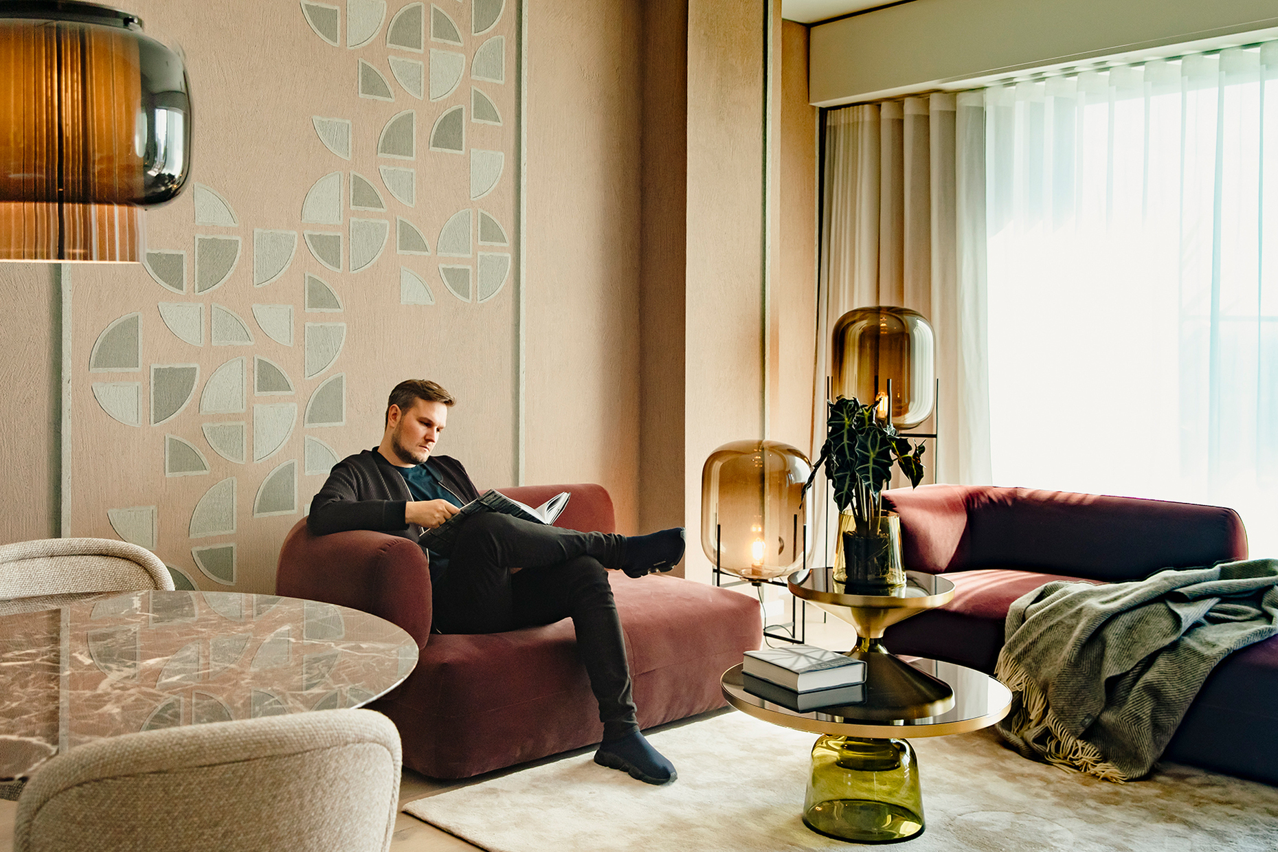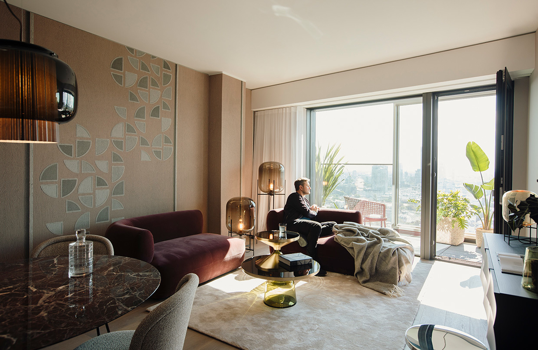 Im Zuge der Inneneinrichtung des Apartments wählte er kontrastreiche Materialien: Weicher Samt trifft auf getöntes Glas, Marmor auf geometrisches Wanddekor. Oberflächen aus Metall setzen zudem feine Akzente. Die harmonische Wohnatmosphäre wird mit gedeckten, natürliche Farben unterstrichen sowie über die geschickte Kombination der Designs: Stammen die Produkte überwiegend aus der Feder von Herkner selbst, schaffen sie im Zusammenspiel mit sinnlicher Formensprache und sanfter Eleganz ein stimmiges Gesamtbild. Der "Bell Table" von Classicon trifft so auf die Stehleuchte "Oda" von Pulpo, der Servierwagen "Grace" von Schönbuch auf den Stuhl "118" von Thonet, der Sessel "Pipe" von Moroso auf den Spiegel "Sillon" von &tradition. Den herrlichen Blick auf die Skyline von Frankfurt am Main genießt man indes auf dem großzügigen Balkon im Outdoorstuhl "Carousel" von Emu. "Ich möchte eine Atmosphäre aus Raum, Architektur und Interieur schaffen", so Herkner.