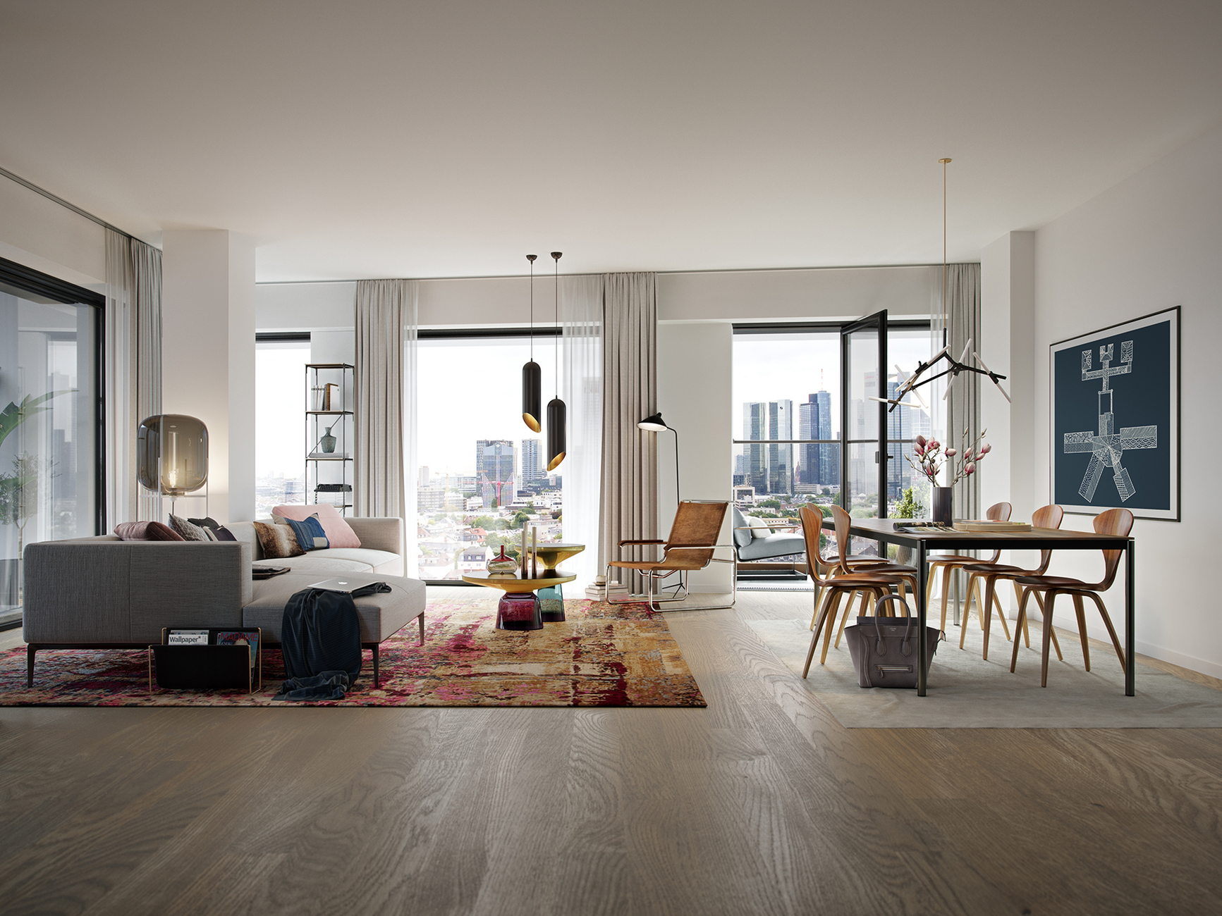 Wohnen mit Panoramablick: Im One Forty West ist das bald garantiert, denn selbst das niedrigste Apartment des Gebäudes liegt auf 110 Metern Höhe. cma cyrus moser Architekten haben den Bau im Frankfurter Senckenberg-Quartier erdacht, der aktuell kurz vor der Fertigstellung steht und sich in bester Lage mit gut 140 Metern in den Himmel streckt. "Wir gestalten hier ein Hochhaus mit einer hybriden Nutzung, also Premium-Wohnen mit Hotel und Gastronomie im Top-Segment", so die Architekten Andreas Moser und Oliver Cyrus. Die Grundrisse und Basisausstattung der Wohnungen entwarf die Ippolito Fleitz Group. Ein Musterapartment auf 80 Quadratmeter im 25. Stock bekam nun eine besondere Widmung: Sebastian Herkner hat sich der Ausstattung angenommen. Das One Forty West ist ihm dabei bereits gut vertraut, denn der international bekannte Produktdesigner agiert seit Anfang letzten Jahres in Zusammenarbeit mit dem Bauherren Commerz Real als Markenbotschafter für das Hochhaus.