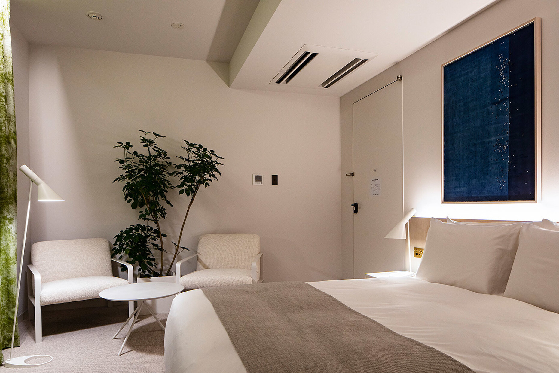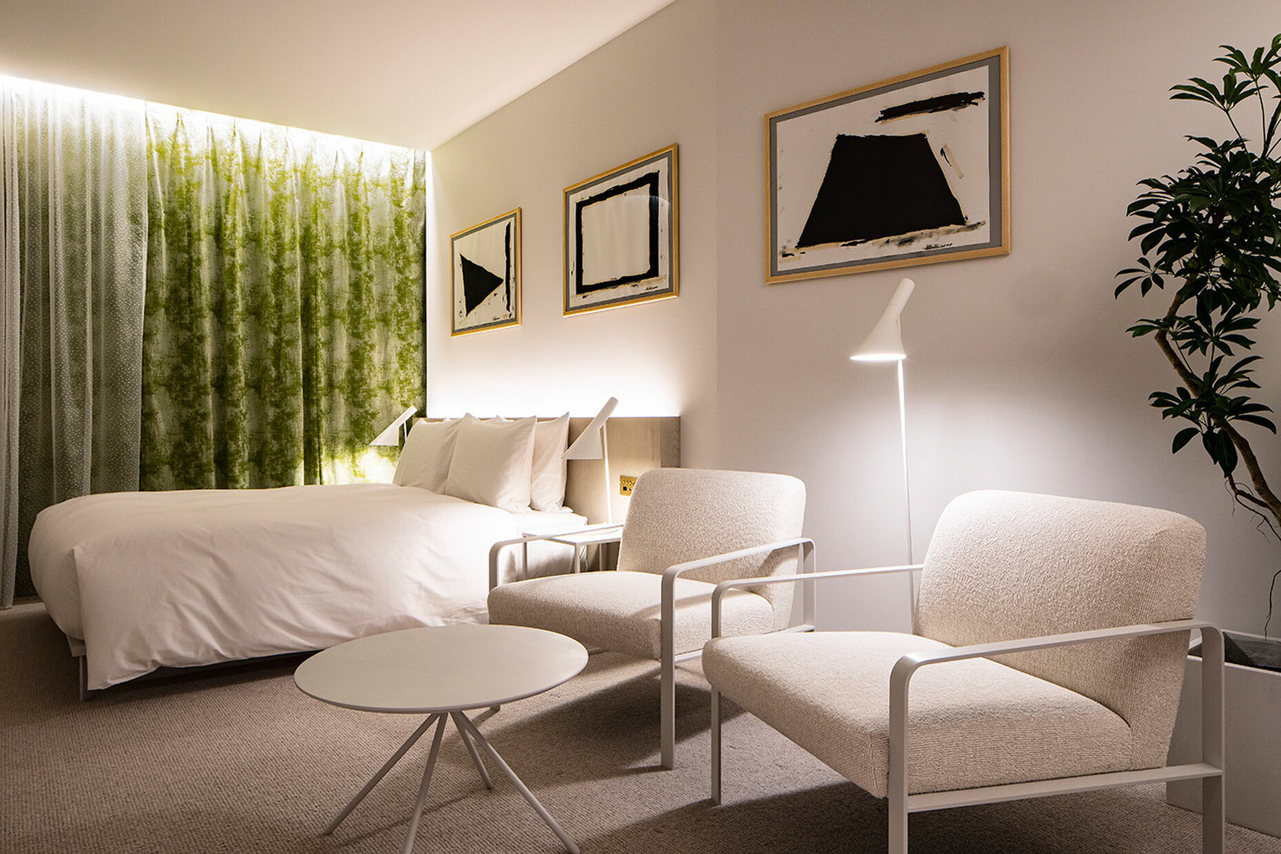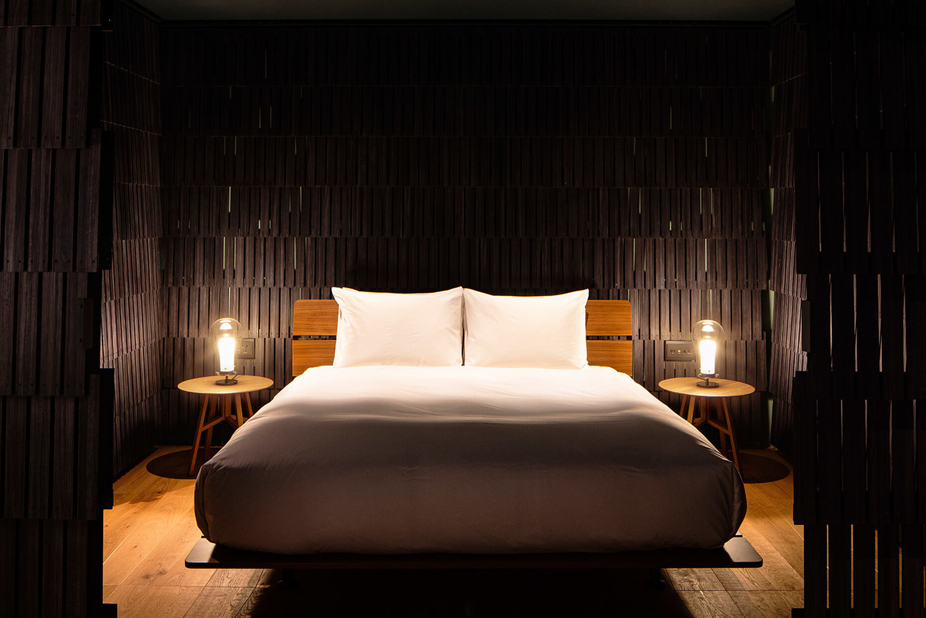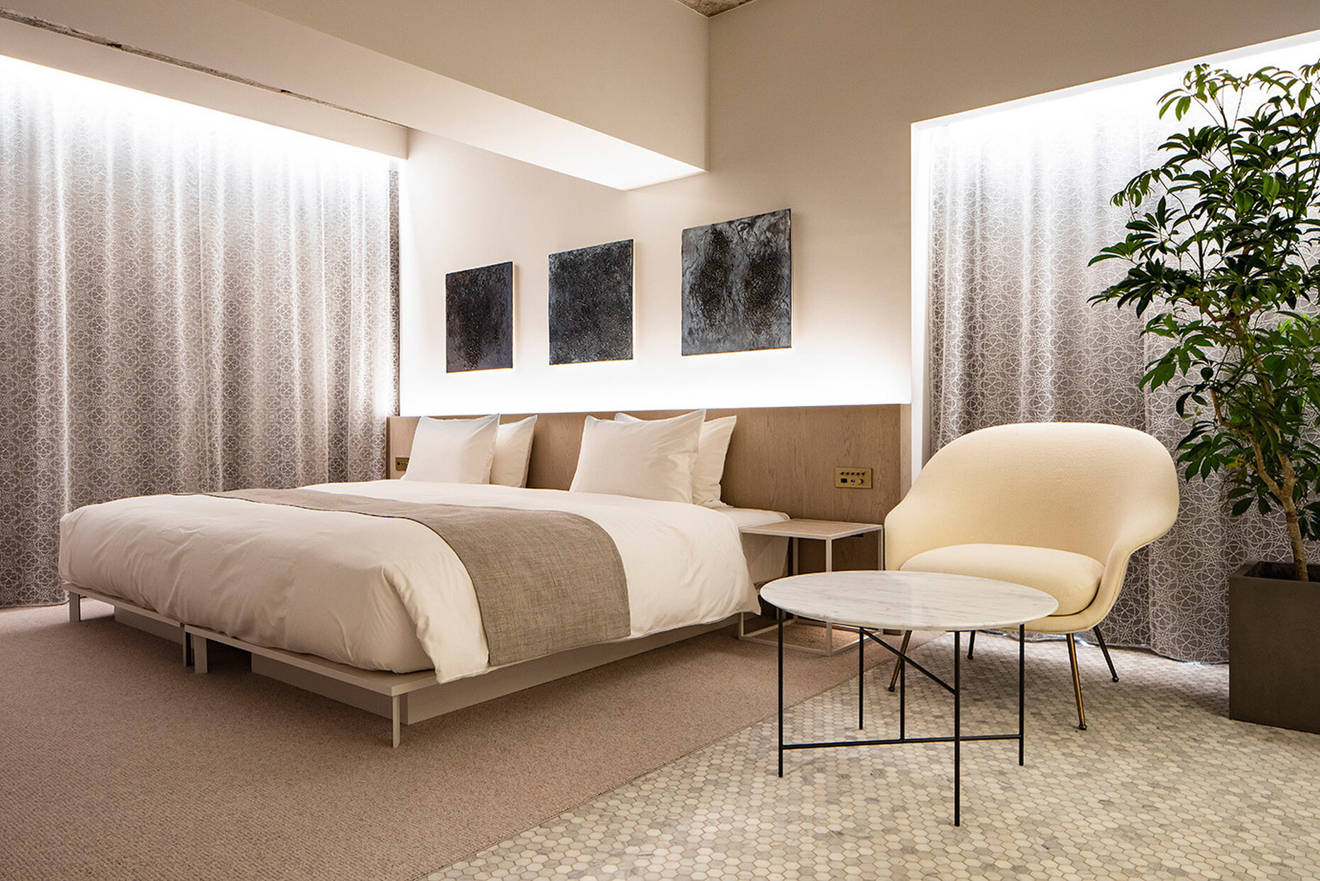 Anders als in Kisho Kurokawas "Nakagin Capsule Tower", in dem eine Wohnkapsel der anderen gleicht, unterscheiden sich im Shiroiya Hotel alle 25 Zimmer in ihrer Größe und Gestaltung. Der Bestandsbau, der ursprünglich einmal 75 Hotelzimmer bot, wurde großzügig entkernt und auf 17 Einheiten reduziert. Für vier Hotelzimmer haben die eingeladenen Architekten und Designer eine Carte Blanche erhalten: Michele de Lucchi, Jasper Morrison, Leandro Erlich und Sou Fujimoto konnten jeweils ein Zimmer frei gestalten. Das Ergebnis sind vier innenarchitektonische Einzelstücke. Der britische Designer Jasper Morrison hat so seinen Raum in eine Holzkiste verwandelt, vom Boden bis zur Decke: Alle Oberflächen sind mit einer Holzvertäfelung verkleidet. Schließt der Gast die Fensterläden, eröffnet sich der Eindruck in einer überdimensionierten Exportkiste für den Kunsttransport zu stehen. Laut Morrison soll der Reisende selbst zum "kostbaren Inhalt" des Zimmers werden. Auch sein italienischer Kollege Michele de Lucchi wählt Holz als Basismaterial. Der "2725 Elements Room" zeigt ebenso viele dunkle Schindeln, die in ihrer Gesamtwirkung vermögen eine Lücke zu schließen zwischen Skulptur und Innenarchitektur. Der argentinische Konzeptkünstler Leandro Erlich hingegen arbeitet mit einer detaillierten Struktur aus in sich verschlungenen Metallrohren. Erlich beschreibt seine Installation als "dynamic excavation that highlights the power of empty space and air". Mit einem Verweis auf die unsichtbaren Städte von Italo Calvino will er das sichtbar werden lassen, was in einem Gebäude sonst unsichtbar bleibt. Seine leuchtende Röhrengebilde "Lighting Pipes" bespielen auch das Atrium der Lobby.