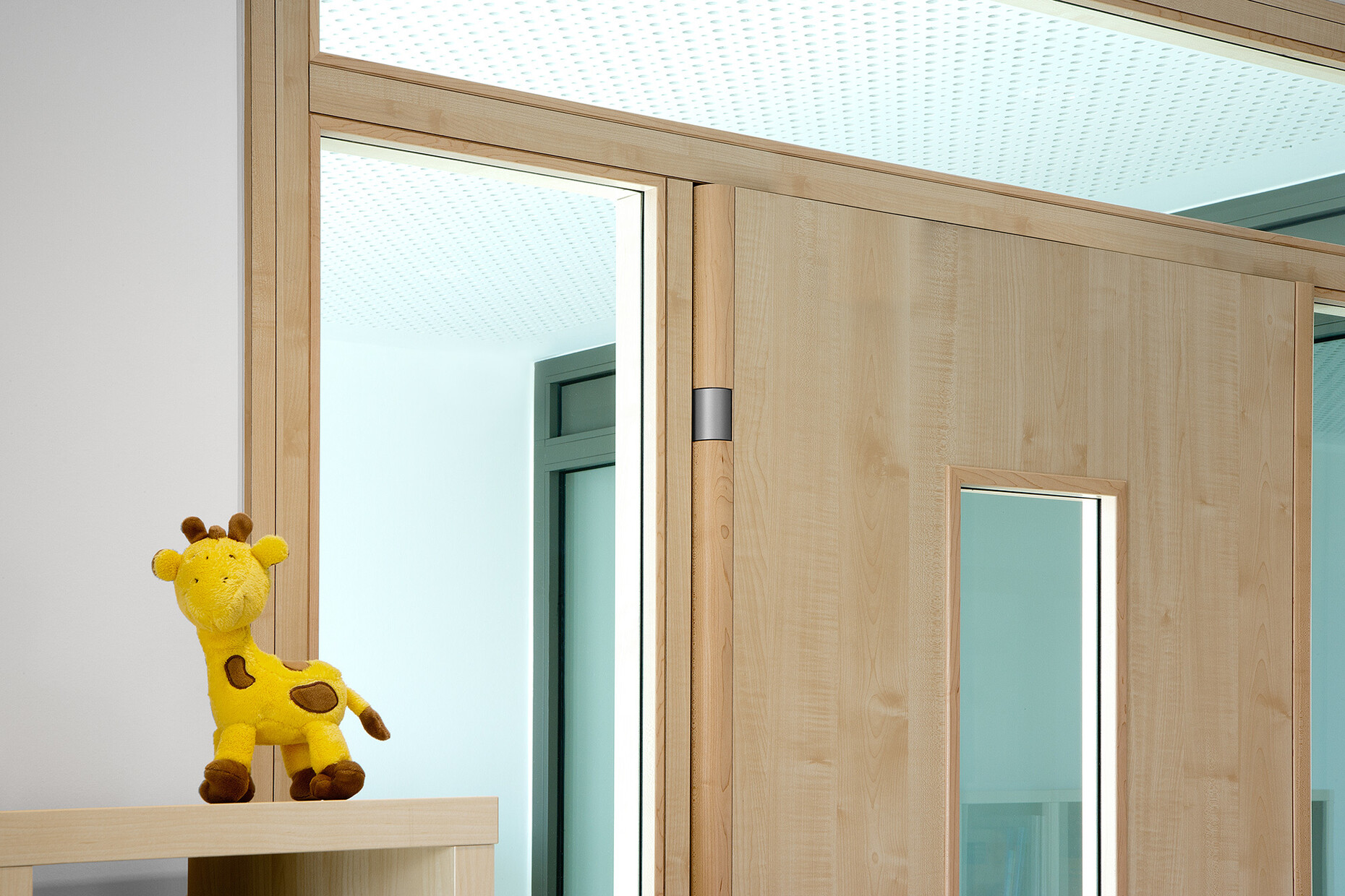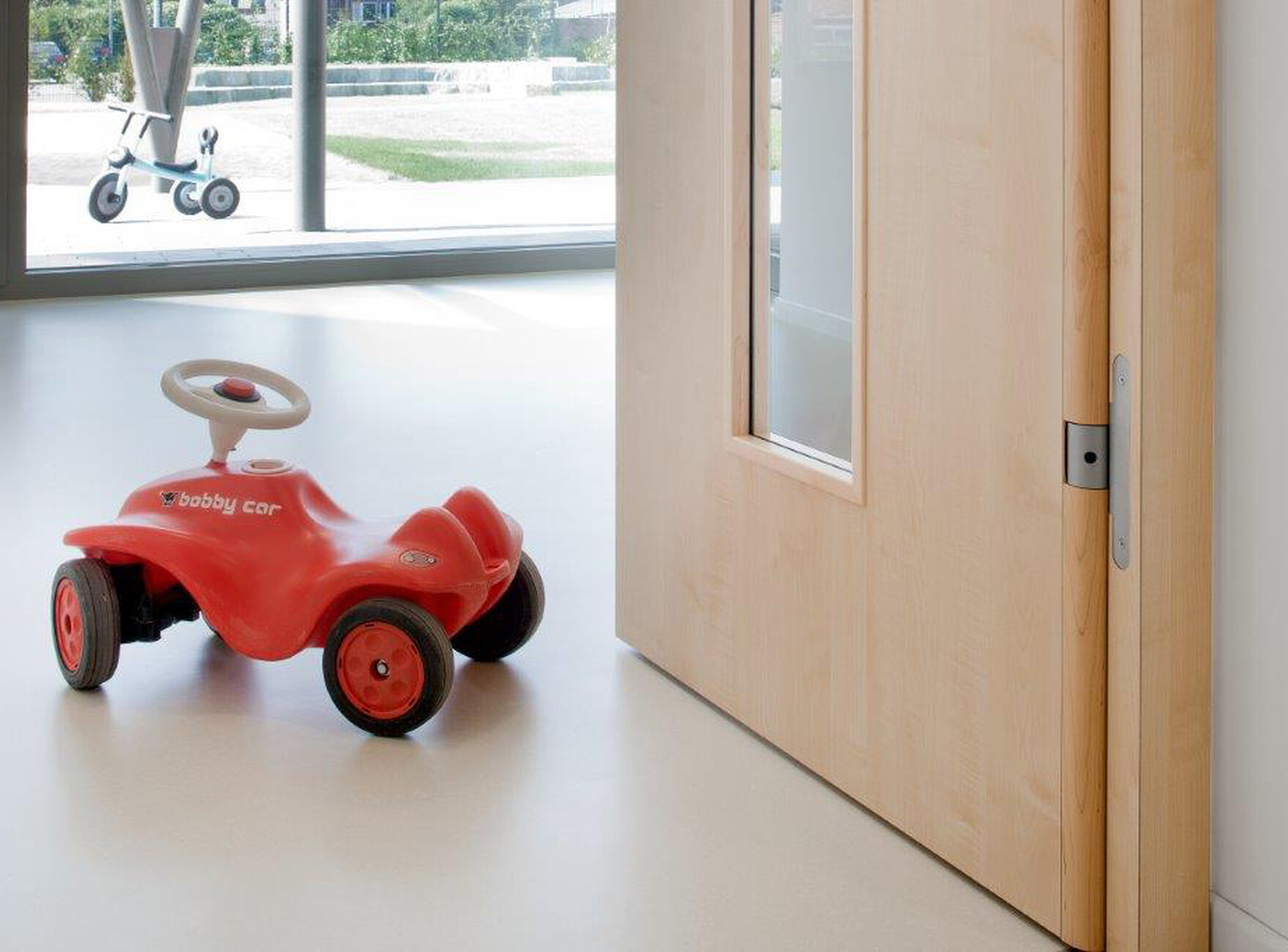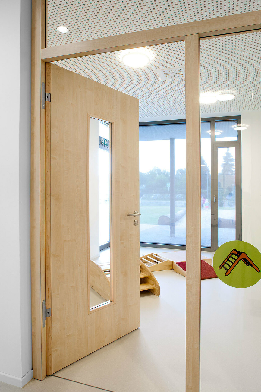 So verlangt die Deutsche Gesetzliche Unfallversicherung, das die Türen von Kitas an den sogenannten Nebenschließkanten gesichert werden: Zwischen Tür und Rahmen dürfen keine Finger geraten können. Um diese Gefahr zu bannen, nutzen die Architekten SIMONSWERK-Türbandsysteme der Modellvarianten "VARIANT VX 7099 Klemmschutz" für hölzerne Zargen und "VARIANT VN 7100 AL Klemmschutz" bei Aluminiumzargen. Die Bandsysteme führen das Türblatt mit gleichbleibend minimalem Abstand zur Zarge und verhindern so zuverlässig, dass Kinder an dieser Stelle mit ihrer Hand in den Zwischenraum hineingeraten und sich verletzten können. Die Funktion der Tür ist dadurch in keiner Weise beeinträchtigt: Die Bandsysteme erlauben einen uneingeschränkten Öffnungswinkel bis 180 Grad und tragen Türen bis zu einem Gewicht von 120 Kilogramm. Zudem sind sie leicht zu montieren und bieten eine attraktive Optik. Die komfortable 3D Verstellung erlaubt die Justierbarkeit um drei Millimeter in jede Richtung sowie die Veränderung des Andrucks um ebenfalls plus und minus drei Millimeter. Dank der Bandtechnik von SIMONSWERK konnten die Architekten formschöne Türlösungen in Ihrer Kindertagesstätte mit dem guten Gefühl realisieren, dass die Hände der kleinen Nutzer gut geschützt sind.