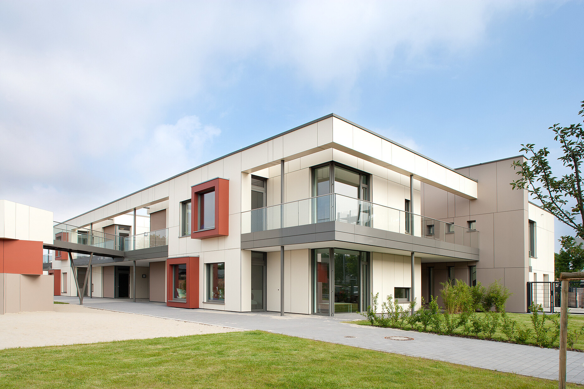 Die neue Kita entstand nach einem Entwurf der architektur-werk-stadt Balhorn Wewer Karhoff als sandsteinfarbiger, zweigeschossiger Bau mit Erkerfenstern in einem warmen Rotton. Im Inneren dominieren lichtes Weiß und helles Holz. Um die speziellen Anforderungen zu erfüllen, die in Kindertagesstätten an die Klemmschutz bei Türen gestellt werden müssen, griffen die Architekten auf die Bandtechnologie eines anderen erfolgreichen Unternehmens aus Ostwestfalen zurück: SIMONSWERK.