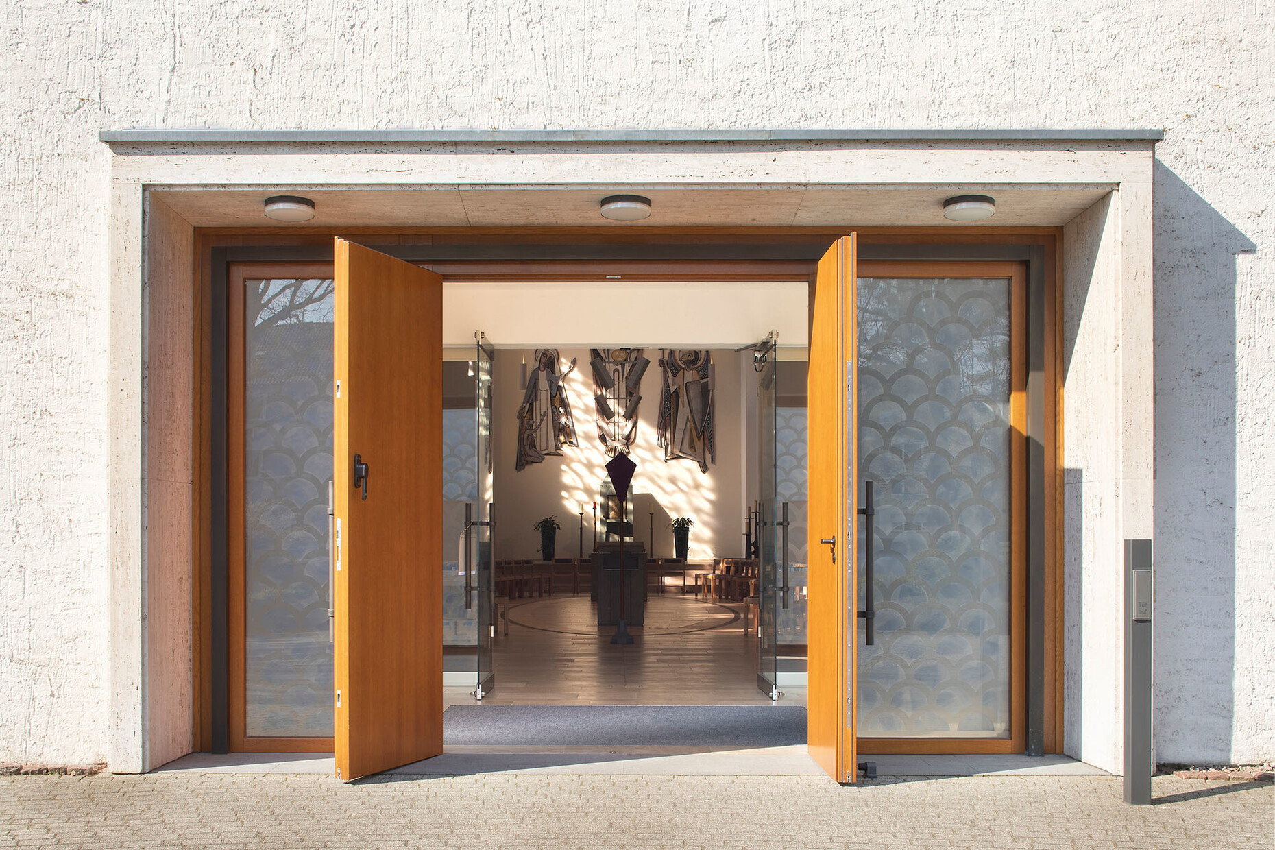 Auch die Eingangssituation wurde neugestaltet. Bislang war das Kirchenportal traditionell dreigeteilt: eine Doppelflügeltür für Prozession in der Mitte, eingefasst von einflügligen Seitentüren, durch die die Gläubigen in die Kirche gelangten. Das Portal wirkte durch das dunkel gestrichene Holz wenig einladend und verlieh der Kirche zusammen mit dem wuchtigen "Westwerk" einen abweisenden Charakter. Die neue doppelflüglige Kirchentür dagegen ist aus naturfarbenem Eichenholz geschreinert und besitzt statt der Seitentüren Fenster, die zusätzliches Licht ins Kircheninnere leiten.