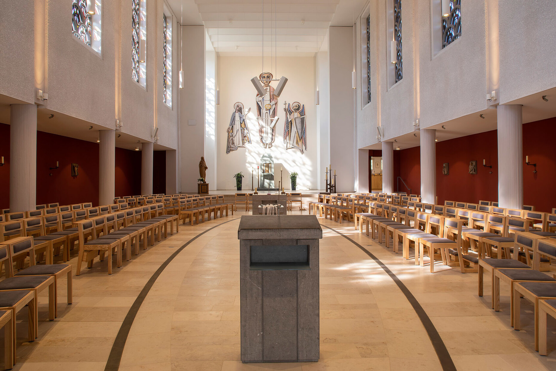 Die Geschichte der St. Michaelskirche in Paderborn-Sennelager ist die vieler Pfarrkirchen in Deutschland. Gebaut wurde sie Ende der Fünfzigerjahre, als der Paderborner Vorort und damit auch die Zahl der Gemeindemitglieder kontinuierlich wuchs. Heute sieht man sich auch hier mit sinkenden Gläubigenzahlen konfrontiert. Deshalb nutzte man die Gelegenheit, die der geringere Raumbedarf bot, und änderte gleichzeitig mit einer gründlichen Renovierung des Baus auch das liturgische Konzept.