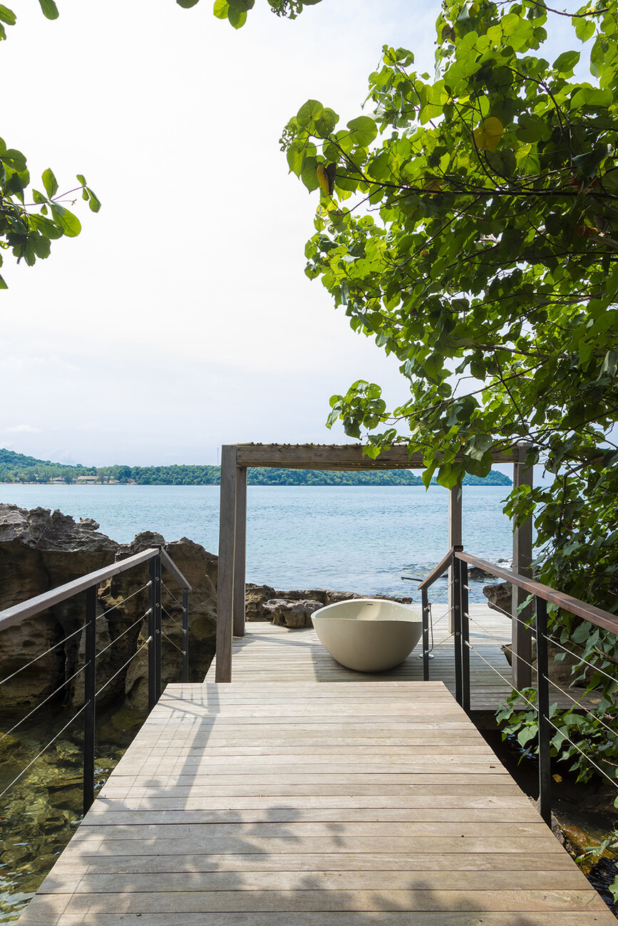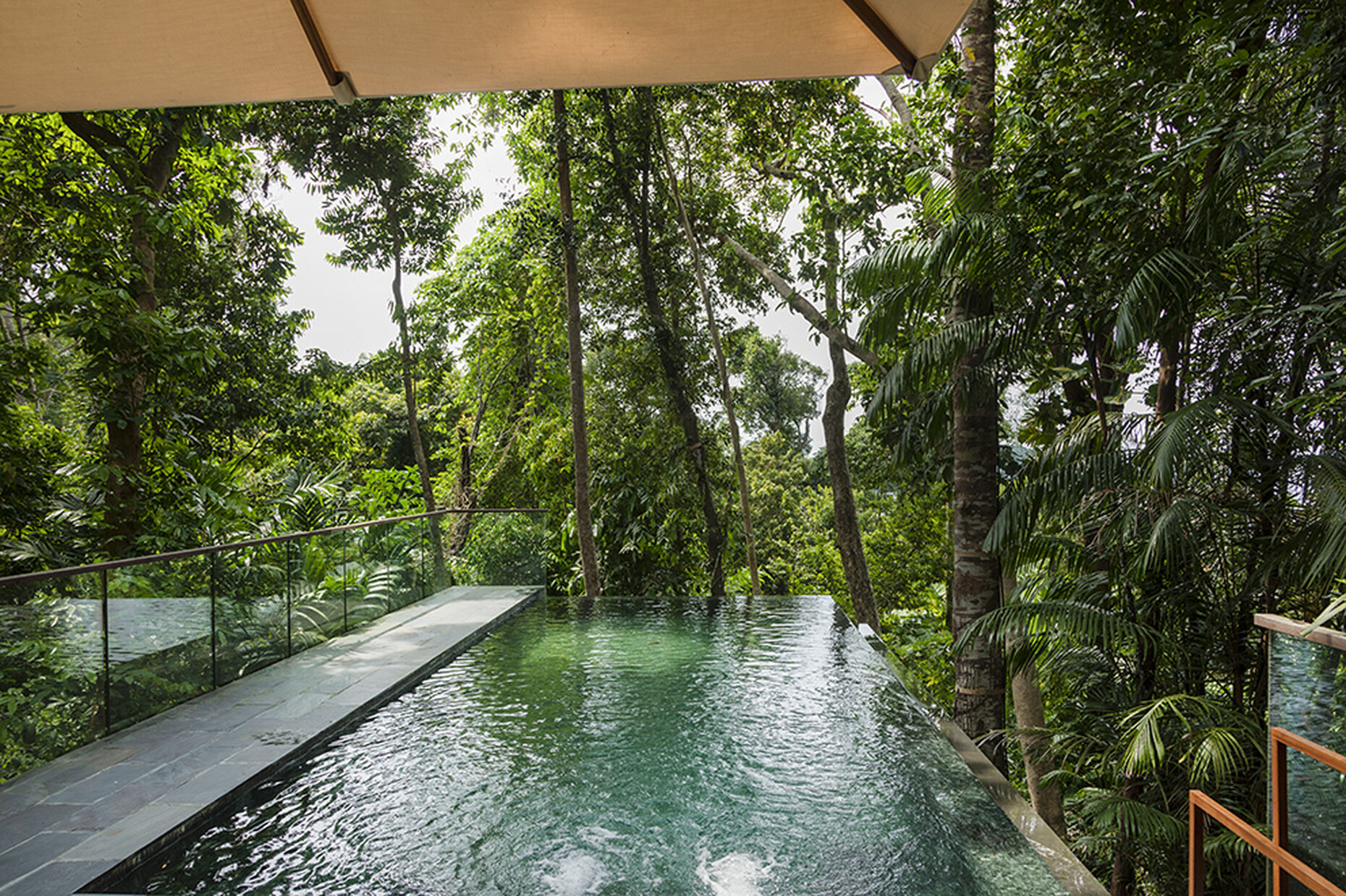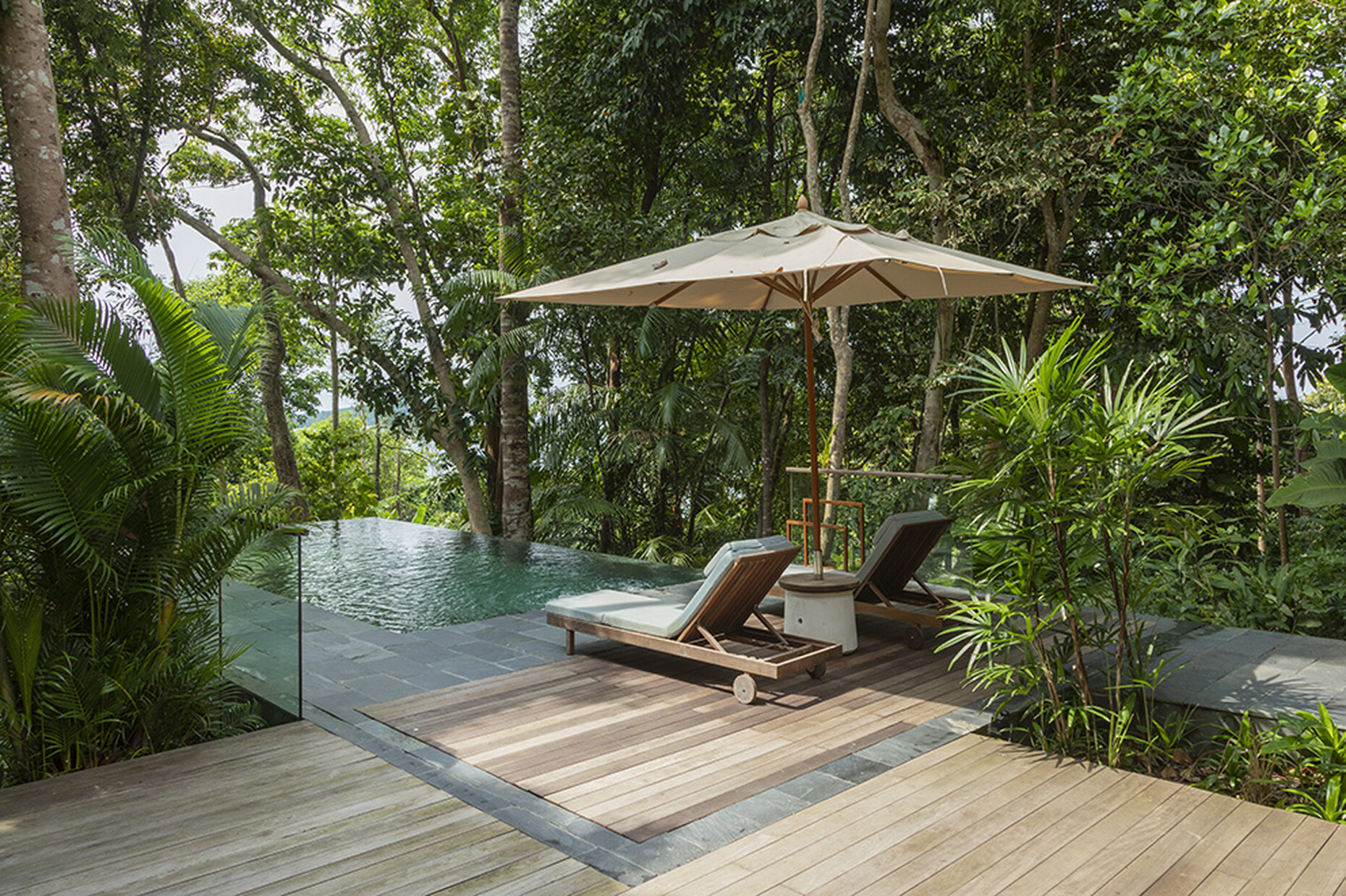Während die Biofarm auf dem Festland liegt, steht das Resort auf einer 12 Hektar großen Insel mit reicher tropischer Vegetation. Es besteht aus insgesamt 40 Villen, zwei Restaurant und einem großen Spa. Auch hier wurde höchster Wert darauf gelegt, dass die Gebäude weder den Regenwald mit seinen 50 Meter hohen Bäumen und seiner reichen Tierwelt noch das maritime Ökosystem beeinträchtigen. Vor dem Bau wurden deshalb umfassende botanische, biologische und meeresbiologische Studien durchgeführt.
