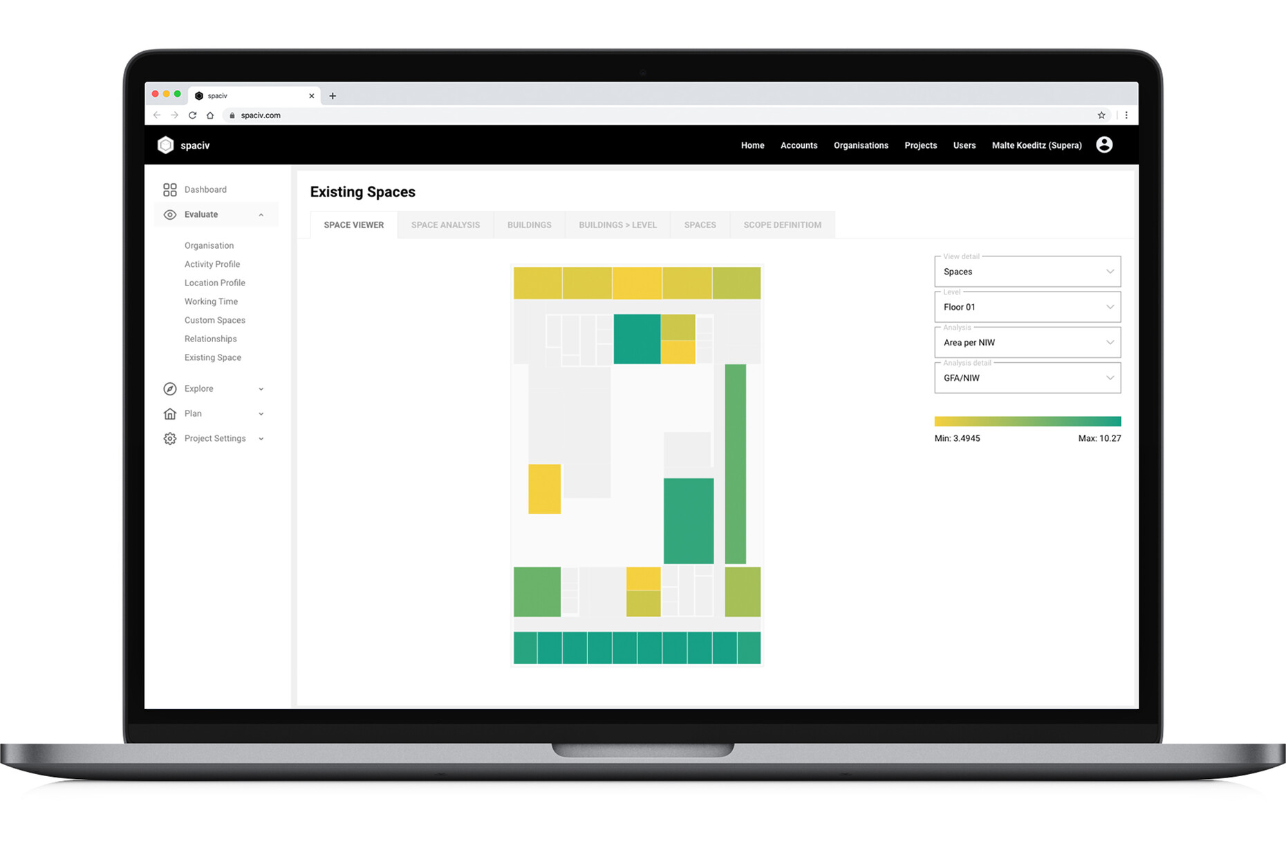 Malte Köditz: Mit Spaciv wollen wir verändern, wie wir als Gesellschaft Flächen konsumieren. Das Ganze ist ein digitales Tool, das es uns auf einer sehr detaillierten Ebene ermöglicht, den jeweiligen Flächenbedarf zu analysieren und die Planung entsprechend anzupassen. Flächen werden heutzutage oft verschwendet, weil die NutzerInnen gar nicht wirklich wissen, was sie tatsächlich benötigen.