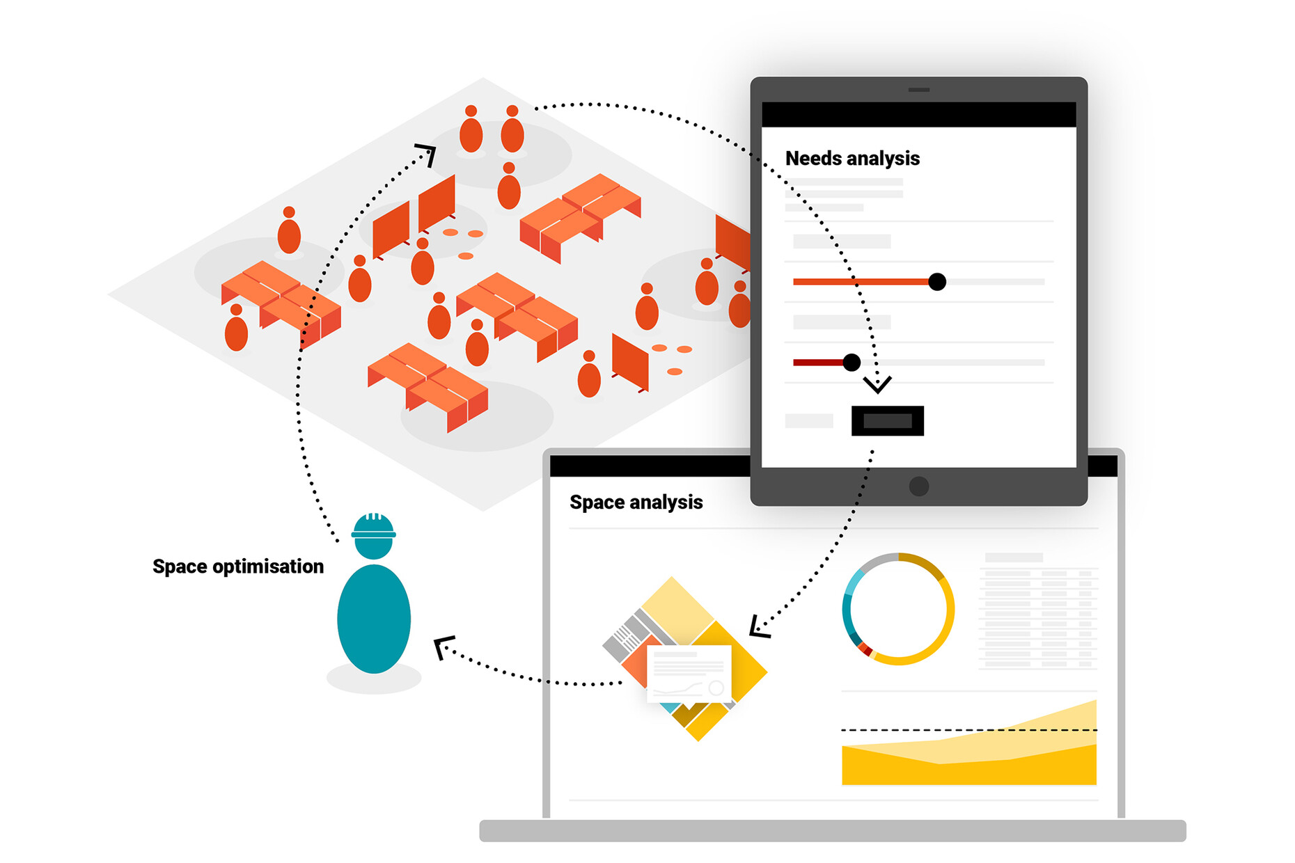 Malte Köditz: Granularität heißt in unserem Fall, dass wir immer auf Positionsebene rechnen. Wenn wir also eine Organisation analysieren, die zum Beispiel 5.000 Mitarbeiter hat und wir das dann in die einzelnen Organisationseinheiten runterbrechen, dann können wir jede einzelne Position – also den Mitarbeiter oder die Mitarbeiterin der Organisation – in jedem Schritt mit dem benötigten Flächenbedarf verknüpfen. Wir können dabei vom Groben ins Feine gehen und vom ersten Moment an Ergebnisse liefern. Darin steckt dann auch das Potenzial für die Optimierung, die nicht nur aus einer Ermittlung der tatsächlich benötigten Fläche besteht, sondern auch in der Möglichkeit, individuelle Arbeitswelten zu schaffen, die auf die jeweiligen MitarbeiterInnen genau zugeschnitten sind.
