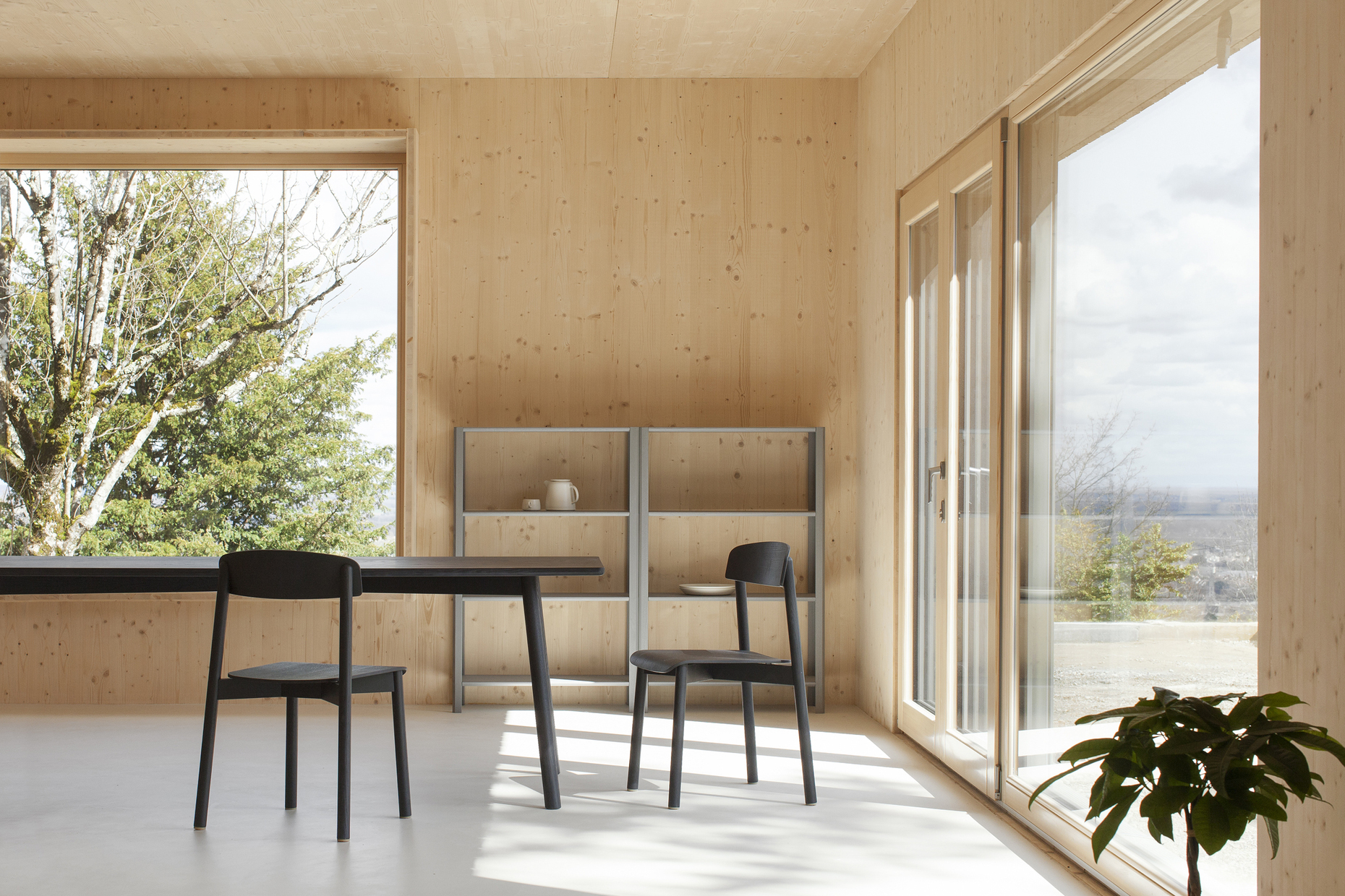 Einen sanften Kontrast findet sich in den Zimmern aus naturbelassenen Holz im Interieur von Stattmann Neue Moebel. Vom "Add Stool", einem stapelbareren Hocker, bis zur Massivholzbank "Profile Bench" sind die Möbel aus zertifizierter, nachhaltiger Forstwirtschaft gefertigt. Ebenso wie die fließenden Übergänge im Haus wurden diese aus Esche und Eiche mit Steckverbindungen entwickelt. In den Farbtönen Puder, Grau, Petrol und Schwarz gehalten, bieten sie sanfte Kontraste zu dem naturbelassenen Holz der Räume. Ausgeklügelt und minimalistisch ist auch das Heizsystem in Gebäude: Die Fenster sind nach Verlauf der Sonne positioniert, so dass die Wärme des natürlichen Lichtes ideal genutzt wird. Im Winter verteilt zudem ein Kamin die Wärme bis in das obere Stockwerk.