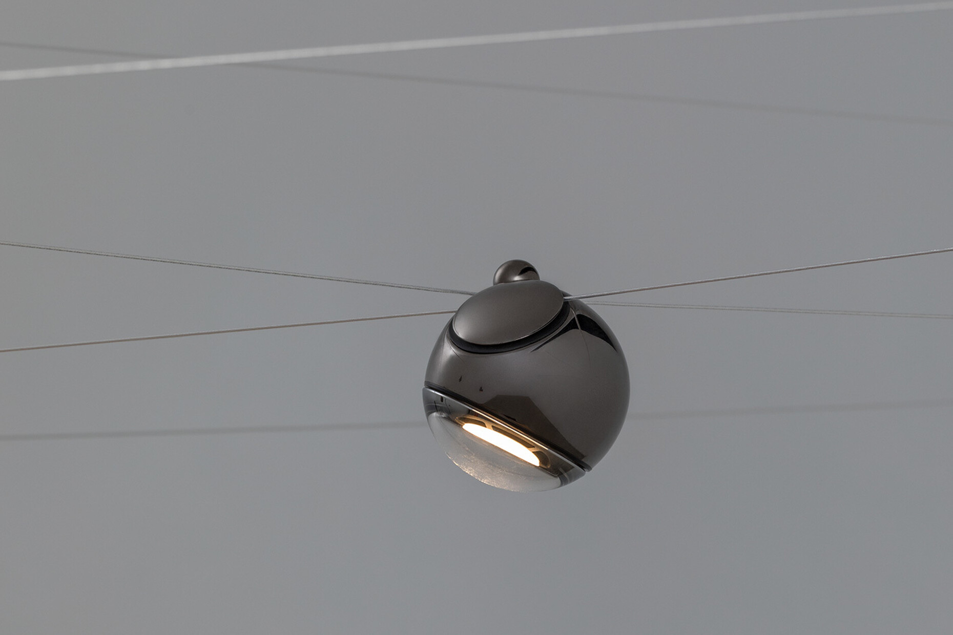 Durch die Kabel fließt eine geringe Stromspannung, die die Lampenkörper mit elektrischer Energie versorgt. Sie sind nicht weniger gestalterischer Teil als die eigentlichen Spots – denn sie bringen die dynamische Komponente, die die Lichtpunkte fast wie kleine Satelliten auf einer Umlaufbahn erscheinen lässt.