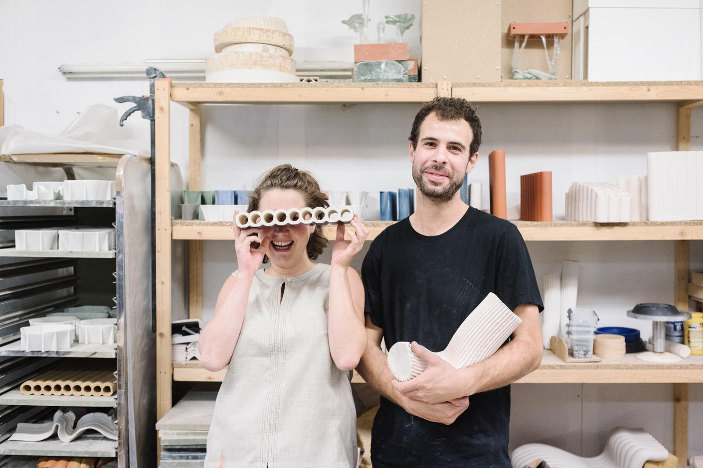 Industrielle Prozesse wie manuelle Fertigkeiten dürfen und sollen sich vermischen, finden Charlotte Cigan und Martin Duchêne. Ein besonderer Fokus ihres Keramikstudios für Design und Forschung mit Sitz in Brüssel liegt dabei auf der Art, wie die Objekte entstehen. Zur neuen Interpretation der Prozesse gehört für sie der Mut zum Versuch und Irrtum – alles bleibt im Fluss, nichts ist von vornherein klar. Nur die Basis ist jeweils gleich: eine Keramikmasse, die durch verschiedene Formen gepresst wird.