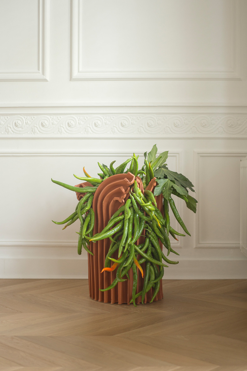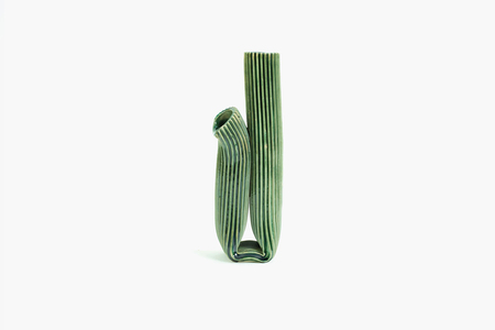 Für das experimentelle Vorgehen lässt sich das Duo mitunter auch von der Architektur inspirieren: "Balik" wurde somit aus der Idee heraus geboren, den Ton von seinen 'üblichen' Einsatzfeldern zu lösen. "Wir wollten daran erinnern, dass Ton, bevor er zu Porzellantassen oder Vasen wird, in erster Linie ein Baumaterial ist, auf dem wir laufen oder sitzen können, etwas, dem wir vertrauen können. Instinktiv begannen wir, unseren eigenen Ziegelstein zu formen, unser eigenes Modul, um verschiedene Arten von Strukturen und Skulpturen zu bauen", sagen sie. Das Projekt "Ogive" hingegen begann mit der Fragestellung, wie sich der Henkel in die Form der Tasse integrieren lässt und trotzdem die Hand vor der Hitze geschützt werden kann. Ihre Versuche führten Charlotte Cigan zu einem architektonischen Modell, das fest auf mehreren Flossen sitzt. In der Umsetzung und im Zuge der Gießprozesse entwickelte Studio Biskt die Idee der modularen Formen und verschiedenen Module, was "Ogive" letztlich nicht nur zu einer Kollektion an Tassen, sondern zum Experimentierfeld der Behälterformen werden ließ. Für "Tulumba" diente indes die Form des gleichnamigen türkischen Desserts als Inspiration: Die Terrakotta-Soliflores werden anschließend mit eigens entwickelten Bändern zu Sträußen zusammengebunden.