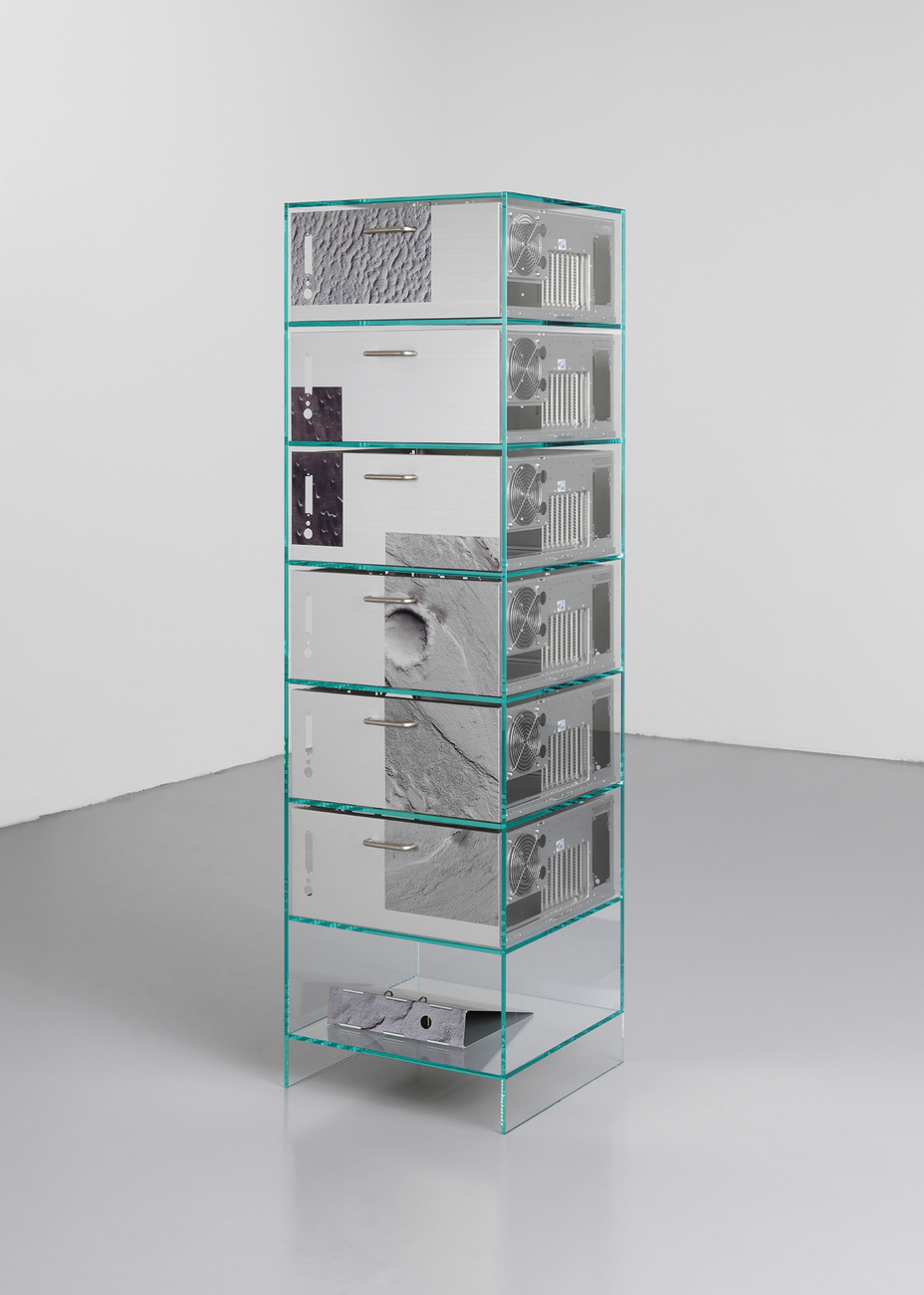 Studio Formafantasma: Alle Informationen, die wir verarbeiten, wie die Bücher, die wir lesen, kommen in den Objekten auf unterschiedliche Weise zusammen. Die "late veneer" Hypothese besagt im Grunde, dass einige der Metalle auf dem Planeten Erde durch Meteoritenschauer importiert wurden. Uns war diese kosmologische Referenz wichtig, weil sie die Art und Weise relativiert, wie wir unseren eigenen Planeten als eine stabile Einheit betrachten, die wir für die Produktion nutzen können.