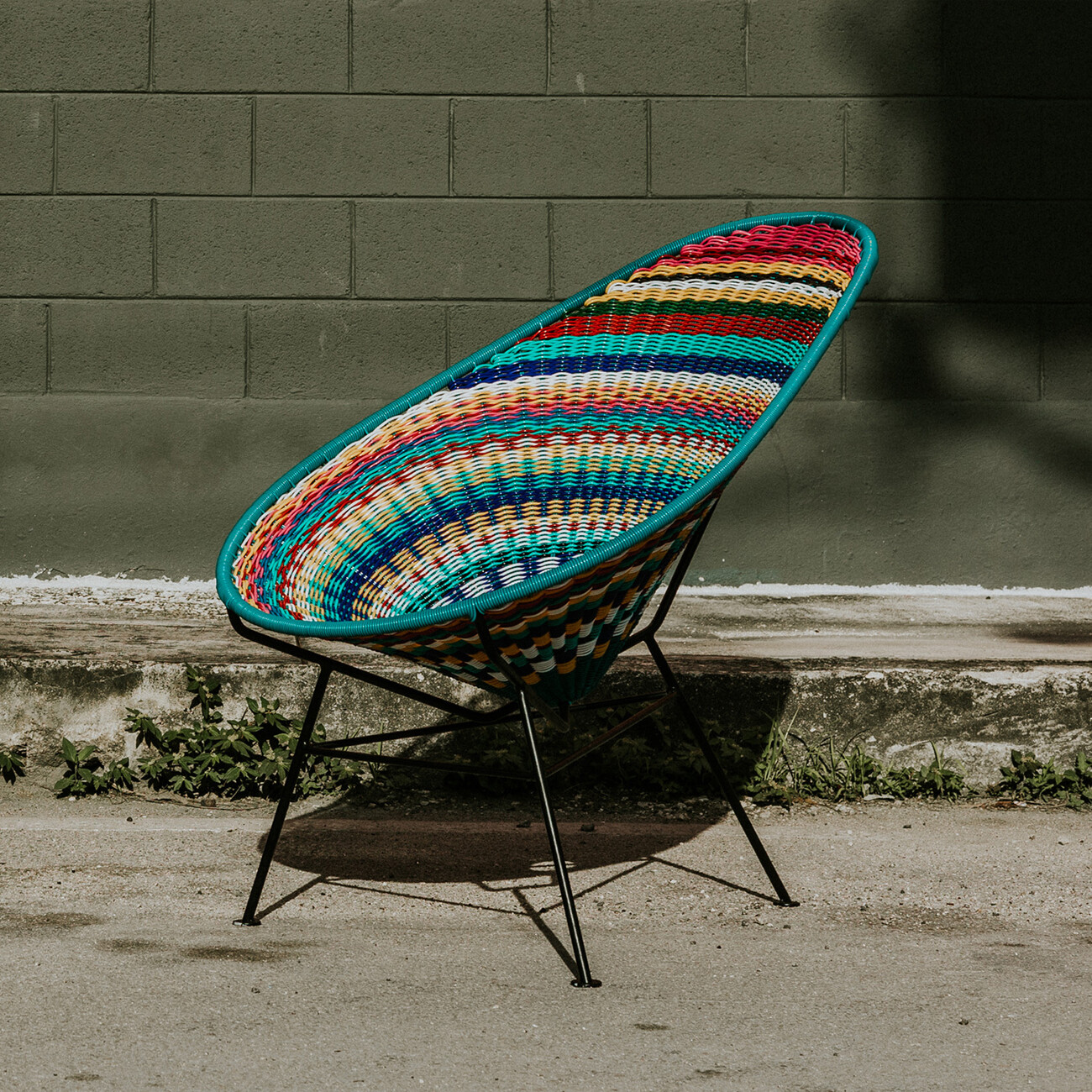 Der "Acapulco Chair" in der neuen Version OAXACA von Acapulco Design ist so farbenfroh und eklektisch wie die gleichnamige Region in Mexiko. Dynamisch ziehen sich die Kordeln in jeweils einer anderen Farbe kreisförmig zum Zentrum und bilden so eine Struktur, die zum Sitzen einlädt. Die Neuinterpretation des ikonischen Midcentury-Designs wird aus Achtung vor dem traditionellen Handwerk komplett in Mexiko gefertigt. Faire Arbeitsbedingungen sind dem Gründer von Acapulco Design, Benjamin Caja, dabei ebenso wichtig wie eine umweltbewusste Herstellung. Alle Modelle sind so frei von Phtalaten, Schwermetallen sowie UV-beständig.