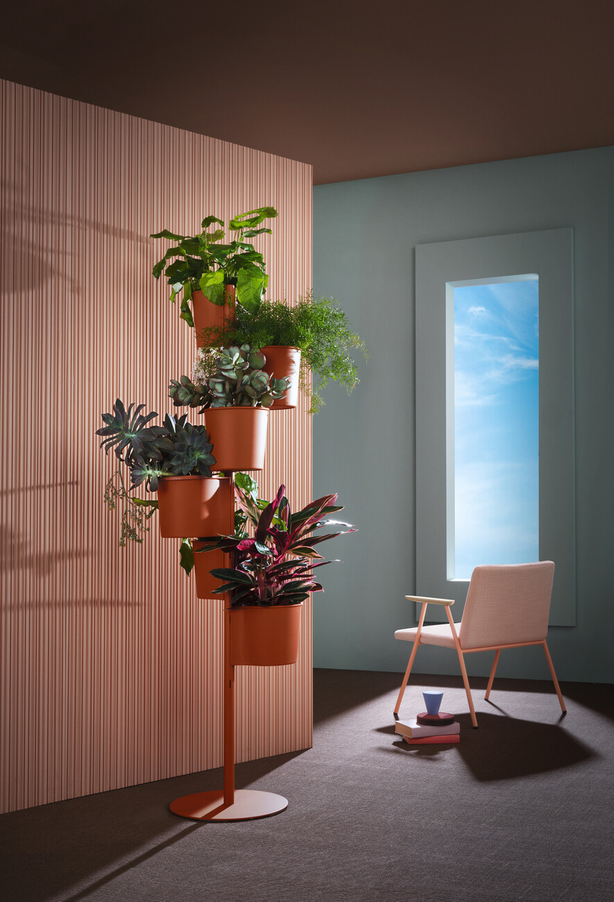 Das Zusammenbringen von Innen und Außen ist ein klassisches Thema in der Architektur. Dem trägt Pedrali mit "Hevea" Rechnung, einem Blumentopfhalter, der die Natur ins Innere holt. Als Basis dient eine Stange, an der sechs Blumentöpfe befestigt werden können. Dabei sind sowohl zueinander versetzte als auch spiralförmige Anordnungen umsetzbar, die vielschichtige Gestaltungsoptionen ermöglichen. So ist "Hevea" subtil in jedes Interior integrierbar, lässt vielfältige Kompositionsmöglichkeiten zu und bringt die Natur in Form kleiner Zimmerpflanzen in Innenräume.