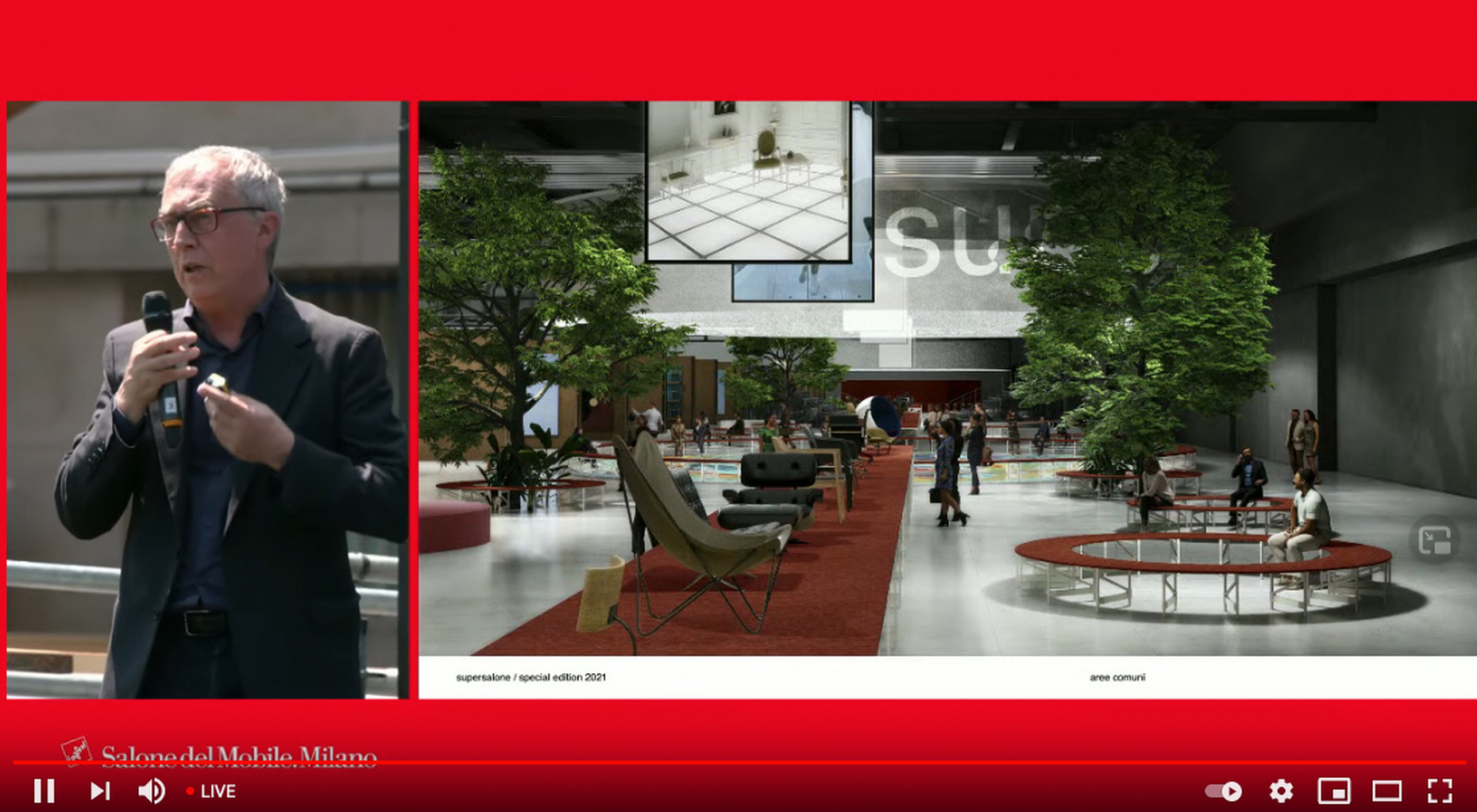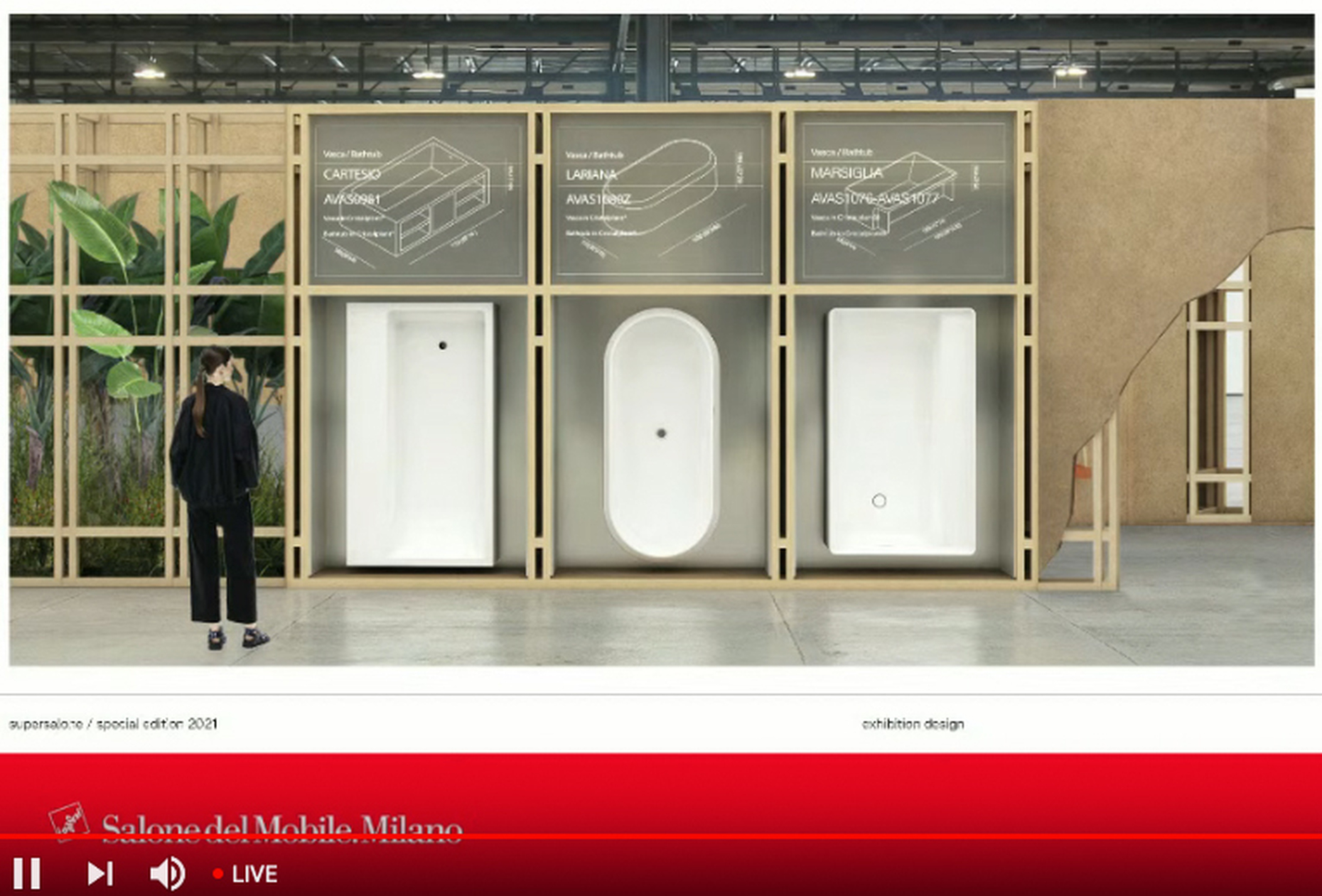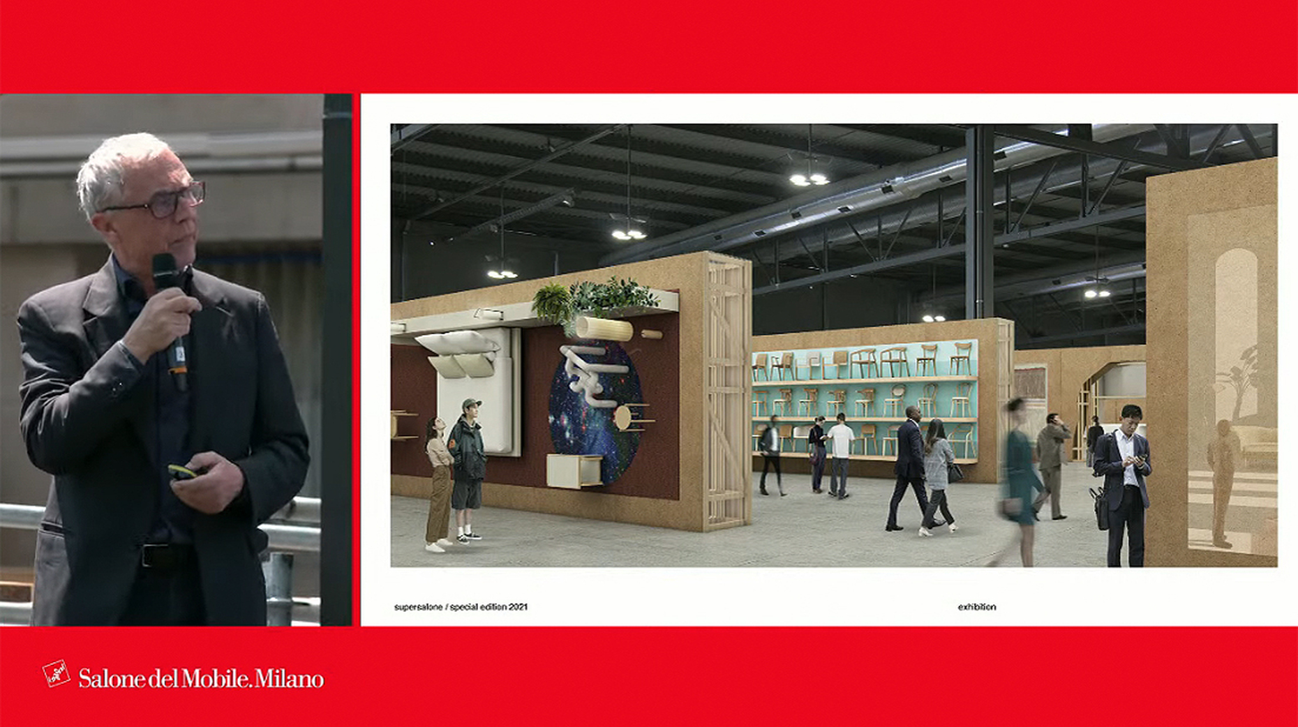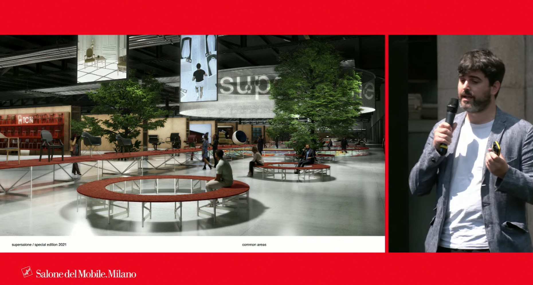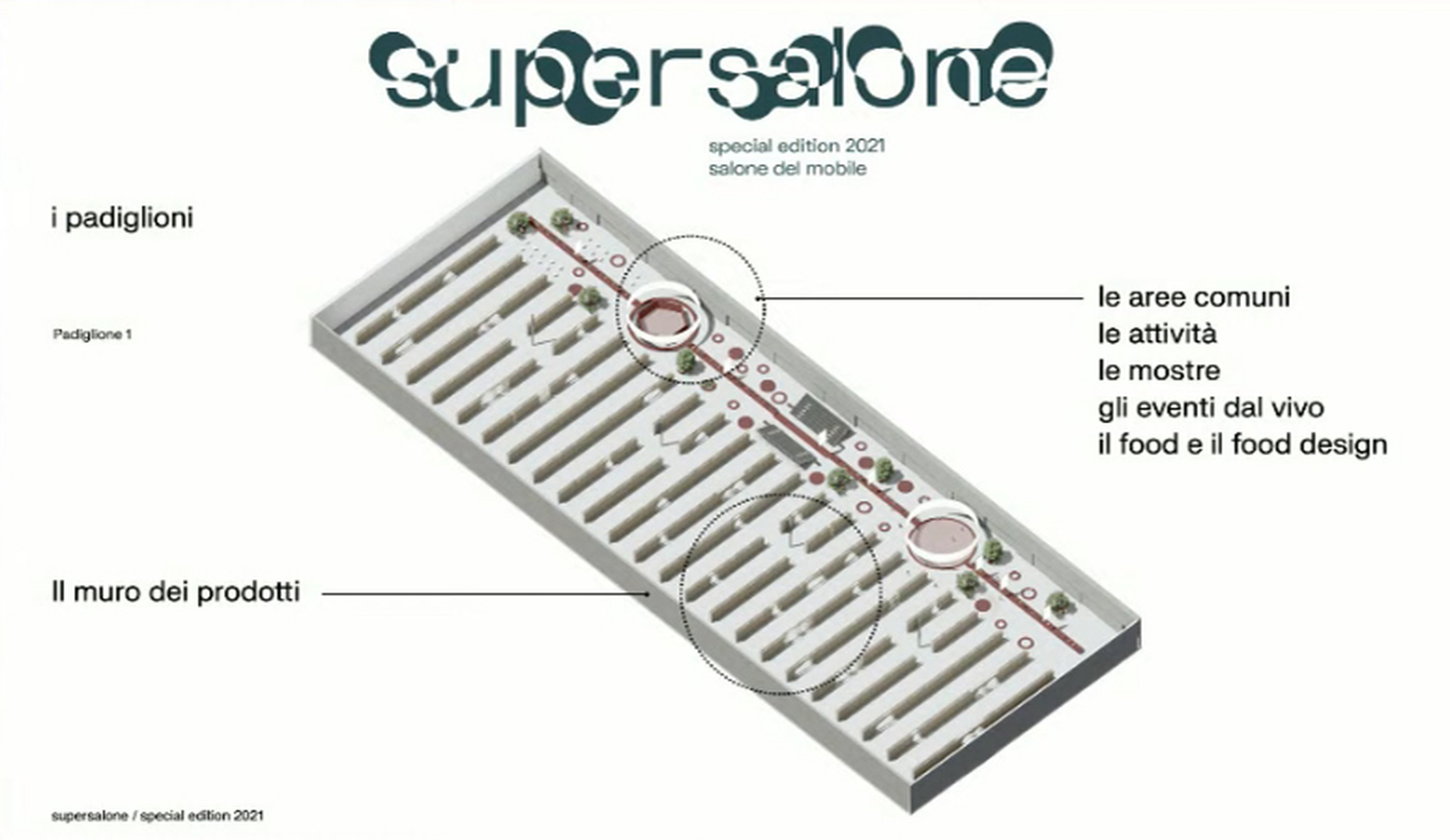 Der Architekt Andrea Caputo hat so für den "supersalone" eine weiterverwertbare Struktur aus Holz entworfen, die auf dem Mailänder Messegelände wie eine große Design-Bibliothek gleichermaßen die Laufwege der BesucherInnen leiten wird, wie den Herstellern die Möglichkeit zur Produktpräsentation bieten soll: Statt wie bisher gewohnt auf einer Fläche zu Wohnwelten arrangiert, werden die einzelnen Neuheiten an den Wänden flexibel hängend präsentiert. QR-Codes sollen Links zu weiterführenden Informationen, wie zu individuellen Angeboten bieten. Der "supersalone" wird im Veranstaltungszeitraum 5. bis 10. September 2021 auch für den Publikumsverkehr geöffnet sein, um kaufinteressierten EndverbraucherInnen die Möglichkeit zu geben, sich über die Produktneuheiten der letzten 18 Monate umfassend zu informieren und über die Kontaktoption mit den Herstellern direkt in Verbindung zu treten. Zum "supersalone" sind zudem weiterführende Kulturangebote geplant, die sowohl die aktuellen Entwicklungen im Design, wie Präsentationen zur Designgeschichte abbilden sollen und als Treffpunkt dienen werden – wie in Form von großzügigen Lounges, Rundgängen und Livemusik-Events. Ebenso werden Arbeiten von NachwuchsdesignerInnen zu sehen sein. Schon der Auftakt zum Messegelände setzt einen grünen Schwerpunkt: Als Part des städtischen Aufforstungsprojekts Forestami sind für die Begrünung des Empfangsbereichs der Messe am Osttor 200 Bäume vorgesehen, die im Anschluss an die Veranstaltung im Mailänder Stadtgebiet eingepflanzt werden.