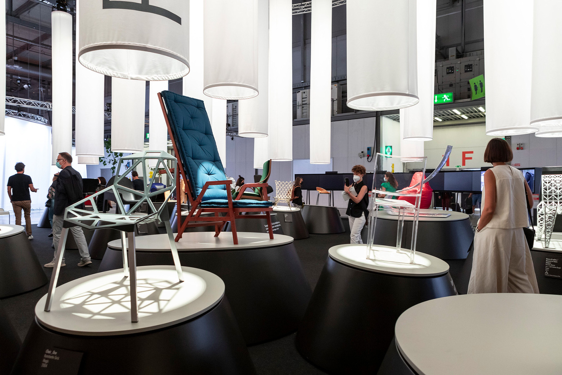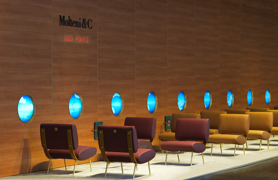 Das die einheitlichen Messeaufbauten aus unbehandeltem Holz vom Berliner Designer Lukas Wegwerth eine begrenzte Lebensdauer haben, wurde zugunsten eines umweltschonenden Recyclings auf dem supersalone nicht wie sonst verschleiert. Für die temporäre Ausstellung sollte kein Material verschwendet werden, selbst die am Oststor aufgestellten Bäume werden nach dem Ende der Veranstaltung eingepflanzt. Und so war der rohe Blick ins Herz der Messearchitektur ausdrücklich gewünscht. Das hatte durchaus Vorteile, denn dank der vielen Durchgänge und offenen Abschnitte ergaben sich immer wieder neue Pfade. Dass sich die BesucherInnen trotzdem teilweise in den Gängen drängten, konnte aufgrund ihrer geringen Breite nicht vermieden werden – ein Kontrast zu den ansonsten weitläufigen Flächen, die bis auf vereinzelte Sitzinseln nicht bespielt wurden und so etwas verloren wirkten. Aufgrund der noch geltenden Reisebeschränkungen zeigten überwiegend europäische HerstellerInnen Auszüge aus ihren Produktneuheiten und bestehenden Sortimenten. Eine umfangreiche Bandbreite wurde trotzdem geboten, was auch für die Art der Präsentation galt: Standen bei einigen Ausstellungsbereichen drei Stühle auf einer ansonsten leeren Fläche, maximal untermalt von einem überlebensgroßen DesignerInnenportrait an der Wand, durfte man bei Molteni&C in einer Installation von Ron Gilad Platz nehmen, die das Innere eines Flugzeugs im Retro-Stil inszenierte. Giorgetti ließ den Schaukelstuhl "Etoile" von Raffaella Pugliatti in einer zerlegten Version wie ein Mobile über der Fläche hängen und Knoll International wählte eine abstrakte, dreidimensionale Skyline von New York City vom Architekten Ippolito Pestellini Laparelli als Basis für die Präsentation, eine Hommage an die historischen Werbekampagnen des Unternehmens. Der Blick zurück auf erreichte Verdienste mischte sich an vielen Punkten mit Aufbruchstimmung. Zum Beispiel in Form der Ausstellung "Take your Seat – Solitude and Conviviality of a Chair" des ADI/Compasso d'Oro. Kuratiert von Nian Bassoli präsentierte diese 30 ausgezeichnete Stühle und über 100 ehrenvollen Erwähnungen der letzten Jahre und Jahrzehnte.