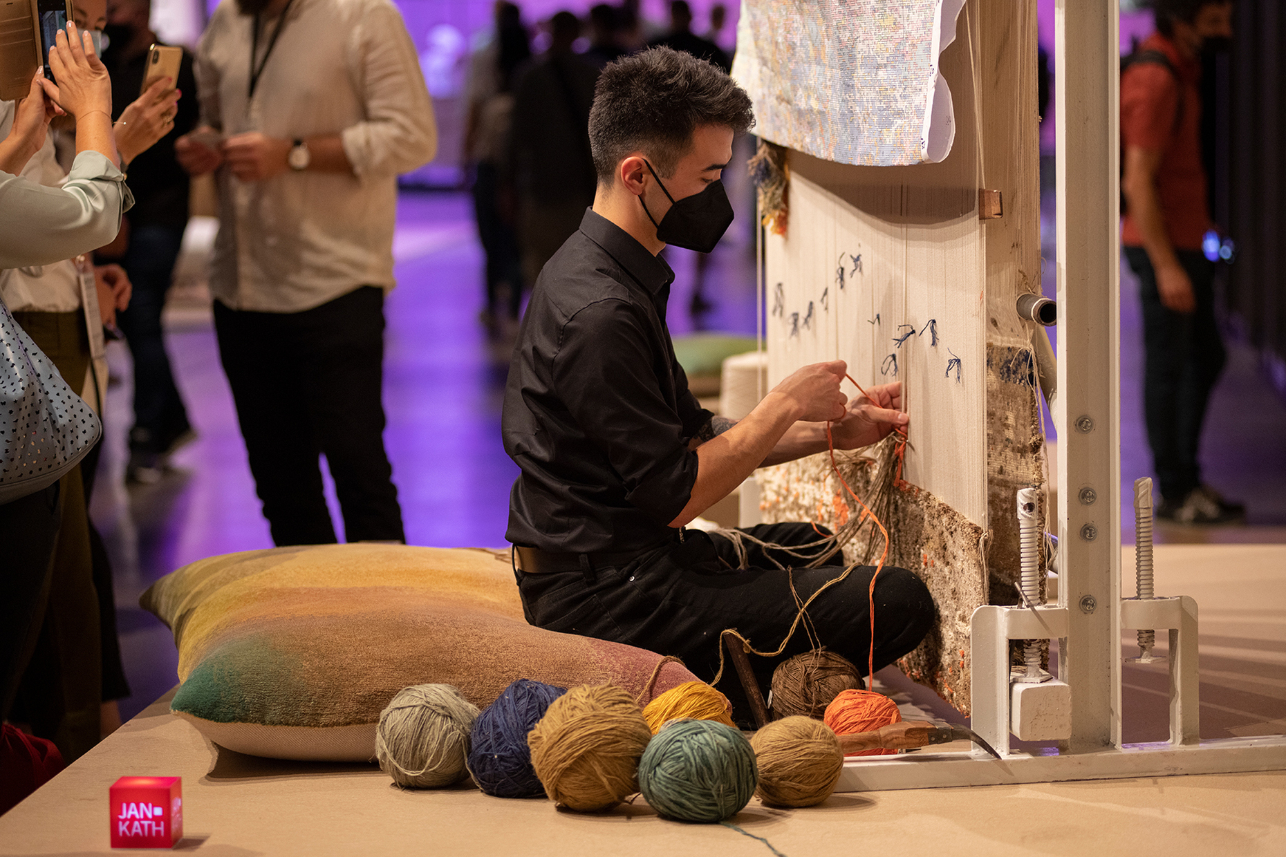 Reduktion auf das Wesentliche auf der einen Seite, die Suche nach Komfort und einer schützenden Atmosphäre auf der anderen: Der Teppich erlebte so als Wandbehang ein Revival, wie bei der Schau von Trame Paris in der Alcova oder in Form der Reproduktion des "Centimetre Rug" von Eileen Gray bei ClassiCon. Bei Jan Kath durfte man zudem seinem Sohn Sanchir über die Schulter schauen, der an einem Knüpfstuhl das traditionelle Handwerk vorführte. Seine erste Teppichkollektion stellte der Grafiker Peter Seville mit "Technicolor" für Kvadrat vor: Die vielfältigen Markierungen, mit denen das Fell von Schafen versehen wird, um Zugehörigkeit oder einen aktuellen Status zu vermitteln, übersetzte er in lockere Farbmelodien. Diese wirken fröhlich, ohne optisch zu sehr ins Gewicht zu fallen – ein elegantes Stück Pop, das Leben in die Räume bringt.