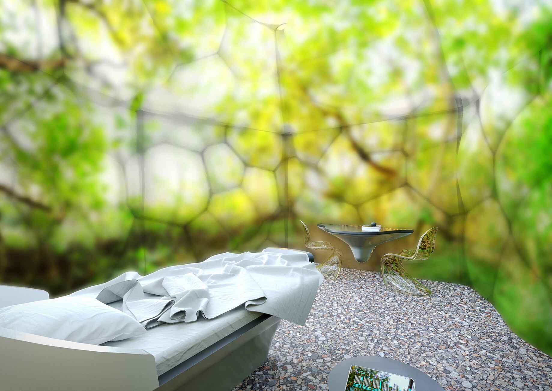 Sylvia Leydecker: Die Basis war die Frage, wie lassen sich möglichst viele Krankheitsbilder mit neuen Technologien auffangen? Die Antwort ist ein 3D-Druck-Konstrukt, materialeffizient, flexibel, modular. Ein smarter OLED-Cocoon, in dem PatientInnen durch die Anwendung neuer Technologien, Digitalisierung und Materialien genesen, ein gestalterischer Impuls. Der "Soulspace" könnte auch als kommunikatives Element die Gesundheitsdaten der PatientInnen speichern, so dass alles Hand in Hand geht. Ich denke man sollte nicht stur in den Raum hineinschauen, sondern eine Vernetzung anstreben, die individuell und atmosphärisch sein kann. Bis in alle Ewigkeit Spanplatte, HPL, Vinylboden kann nicht die Zukunft sein. Wir müssen case-based medizinische Expertise erzeugen, bezüglich der Krankheitsbilder, wie auch für die damit verbundene Krankheitsbilderdifferenzierung. Dann ist es auch möglich individueller auf diese einzugehen. Die multisensuelle Ebene muss gezielt genutzt werden, je nach individueller Anforderung der Situation.