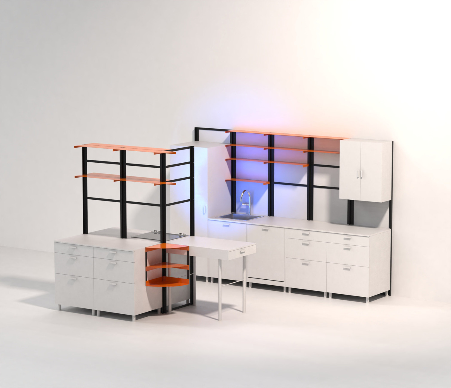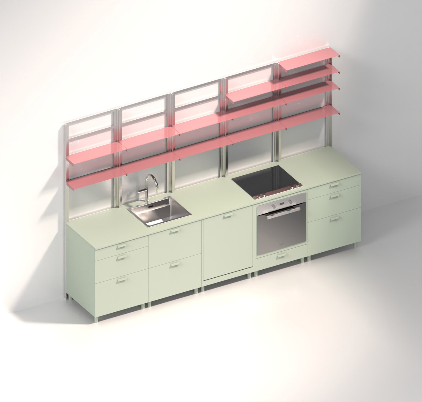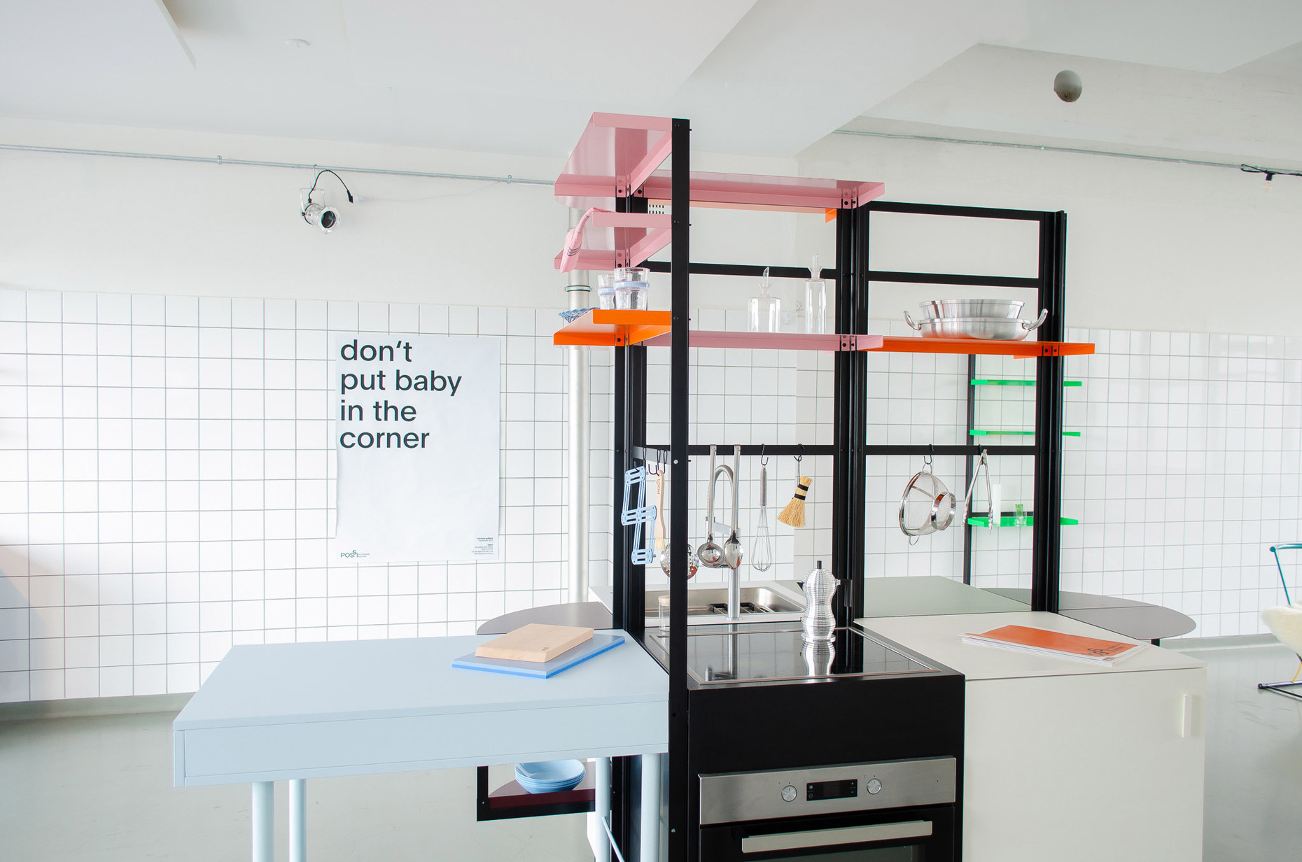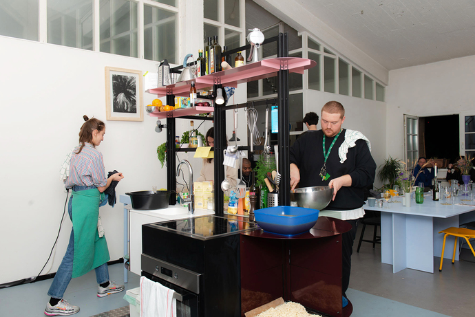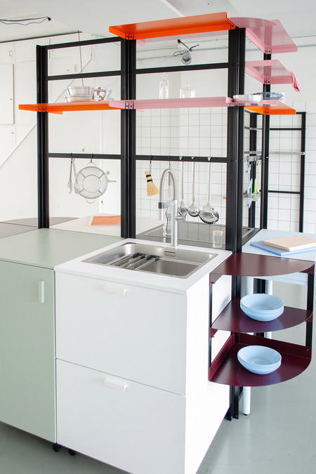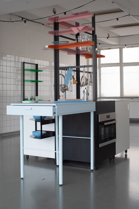 Für das Küchendesign hatte Schütte-Lihotzky vorab die Bewegungen des Menschen in einer Küche analysiert und ihren Entwurf daran ausgerichtet. "100 Jahre später verschwindet die Küche mit unscheinbaren Fronten und flach an die Wand gebaut geradezu in der Architektur, obwohl diese ein sozialer Raum ist, in dem wir uns sehr häufig aufhalten. Ich habe mich gefragt, warum das so ist", sagt Tanita Klein über ihren Entwurfsansatz. Mit "POSSI" hat sie ein System kreiert, das für das gemeinsame Kochen steht: Die flexiblen, modularen Küchenmöbel sind um ein zentrales Gerüst angeordnet und können jederzeit angepasst, ausgetauscht und neu zusammenstellt werden. Eine klare, praktische Struktur, deren versetzbare Ablageflächen in poppigen Farben wie Neongrün, Orange oder Rosa strahlen. Der Wechsel aus geschlossenen und offenen Flächen wirkt luftig und hält die wichtigsten Utensilien beim Kochen stets griffbereit. "Funktionalität hat für mich eine extreme Ästhetik", so die Designerin.