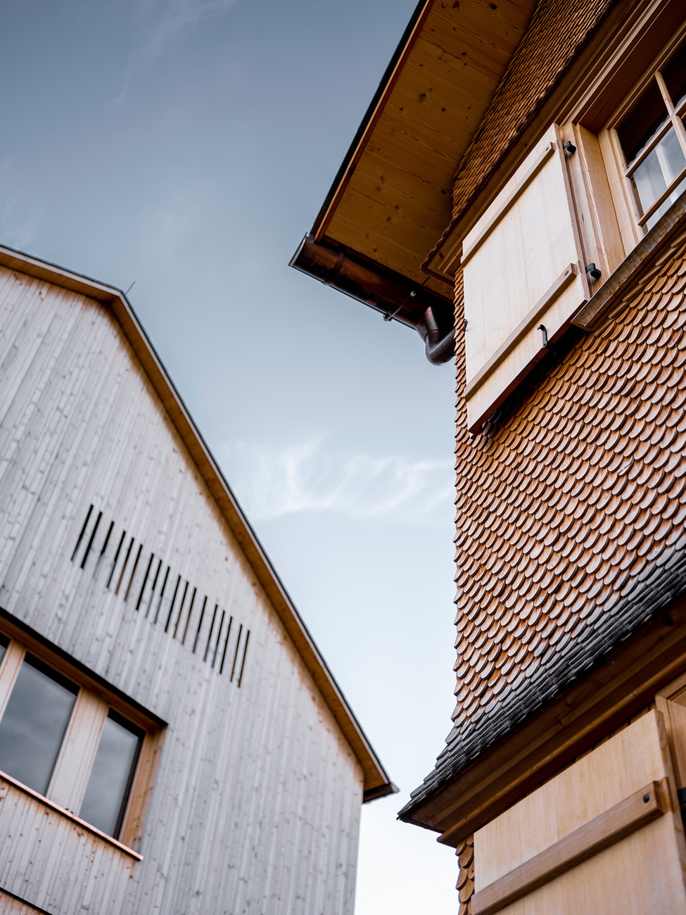 Jürgen Haller: Der Tempel ist in Mellau architektonisch gesehen der Bregenzerwald im Miniaturformat und weist alle Vorzüge der Baukultur des Bregenzerwaldes auf. Das Haus A ist der detailgetreue Wiederaufbau eines Gebäudes mit handwerklich-bäuerlicher Tradition. Typisch dafür sind z.B. Kasten- und Rautenfenster sowie die Rundschindeln. Das Haus B ist ein Neubau, der die regionale Bautradition in freier Interpretation fortschreibt. Es ist mit einem transparenten Holzvorhang verkleidet, der mit offenen und geschlossenen Fassadenflächen spielt. Außen und innen kommen heimische Holzarten wie Fichte und Eiche sowie geschliffener Estrich mit Sandzuschlag aus der Bregenzerach als Bodenbelag zum Einsatz. Verbunden sind die beiden Häuser im Untergeschoss über die Tiefgarage, sowie im Eingangsgeschoss über eine große Stube, die zum Verweilen und Entspannen einlädt. Eckbank, Kredenz und Sitzmöbel in der Tradition des Kanapees sowie der Ofen als zentrale Feuerstelle stehen für die typische Bregenzerwälder Gemütlichkeit und bieten dem Gast einen Wohlfühlort. Es wurden ausschließlich Handwerker und Betriebe aus der Region beauftragt.