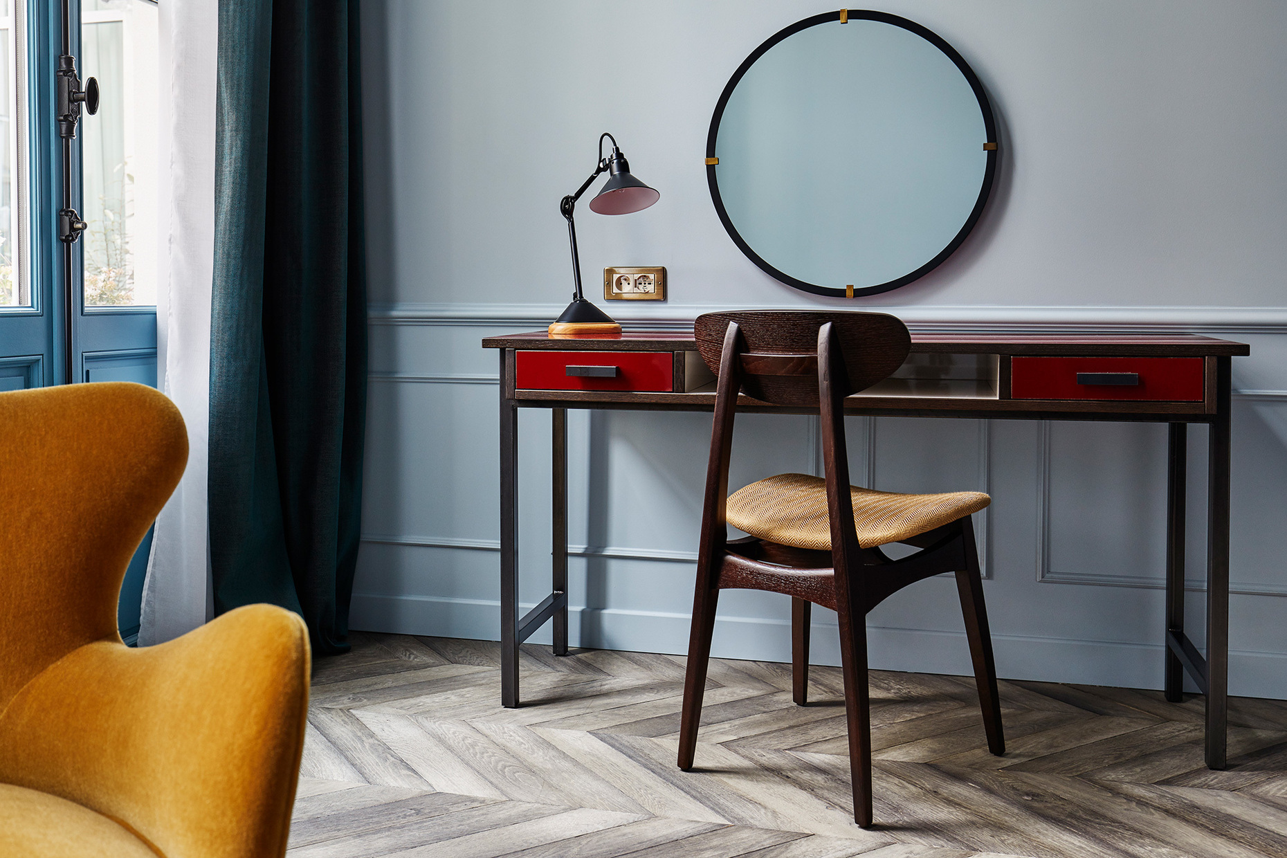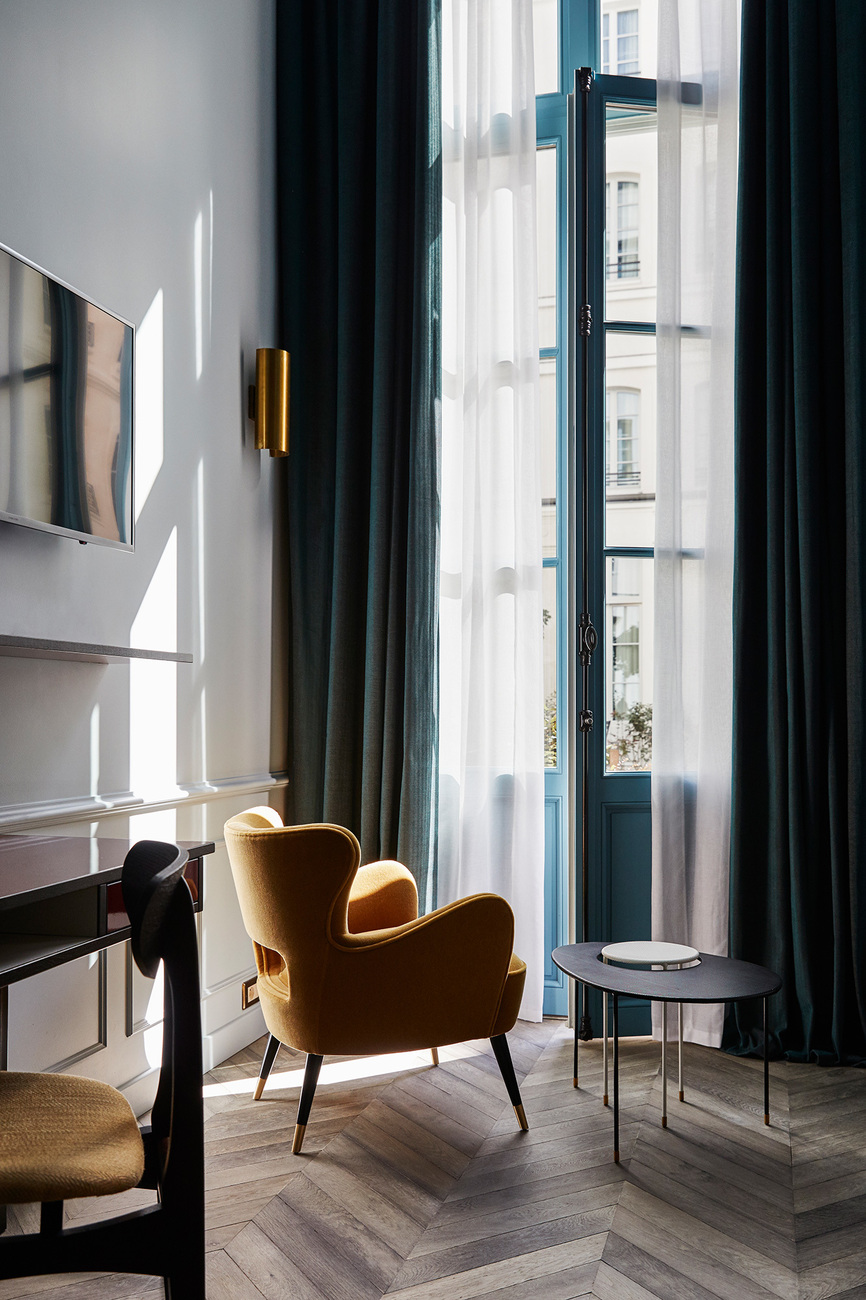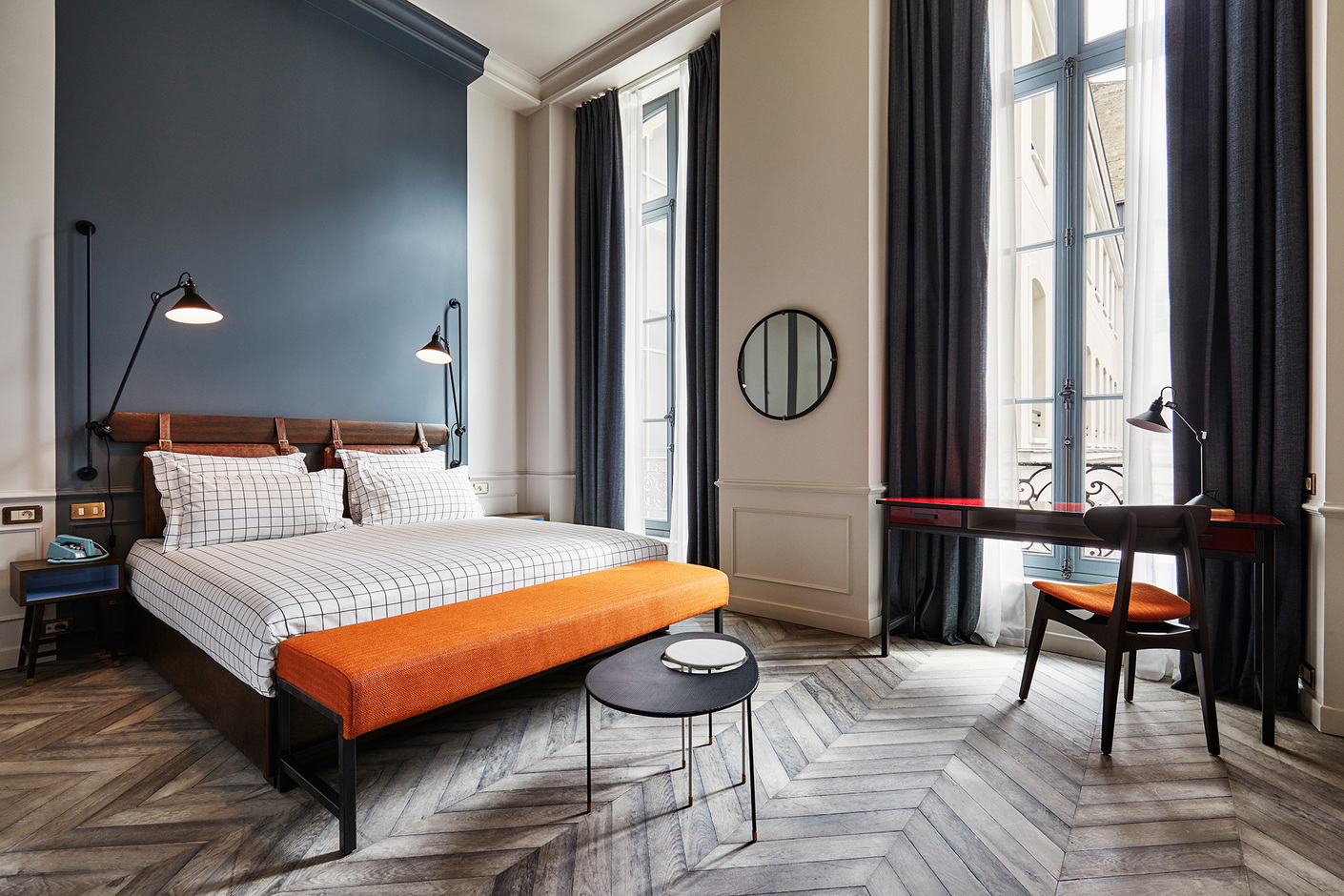 Einst war in dem großen Stadthaus des Architekten Nicolas d’Orbay aus dem 18. Jahrhundert eine Stofffabrik untergebracht. Die prachtvolle Fassade, rustikale Sichtholzbalken und zwei imposante Wendeltreppen sind noch aus dieser Zeit erhalten geblieben. Das Studio Humbert & Poyet, hinter dem der Architekt Emil Humbert und der Interior Designer Christophe Poyet stehen, haben sich bei der Gestaltung der Zimmer den "entspannten Luxus" zur Aufgabe gemacht.