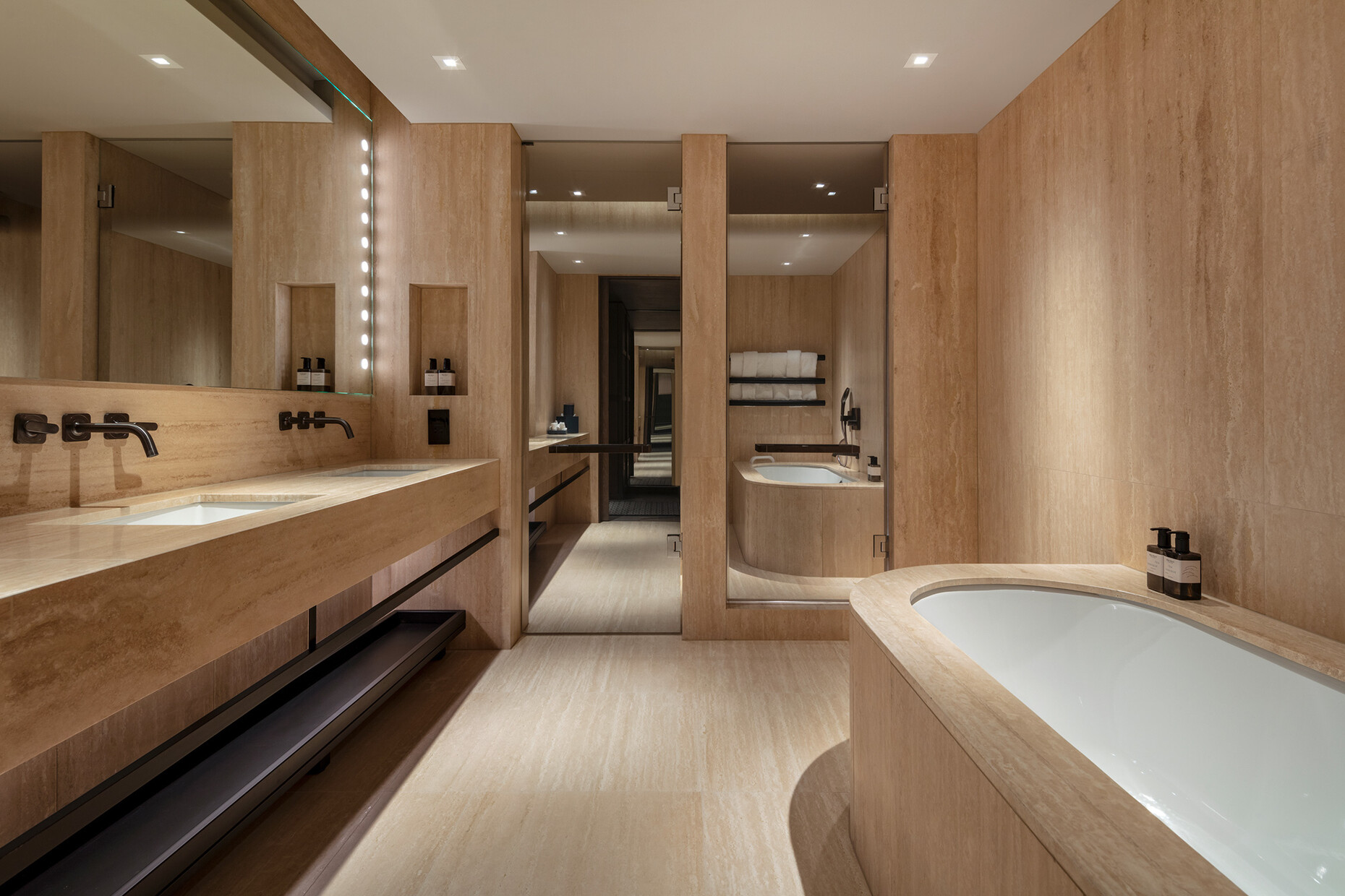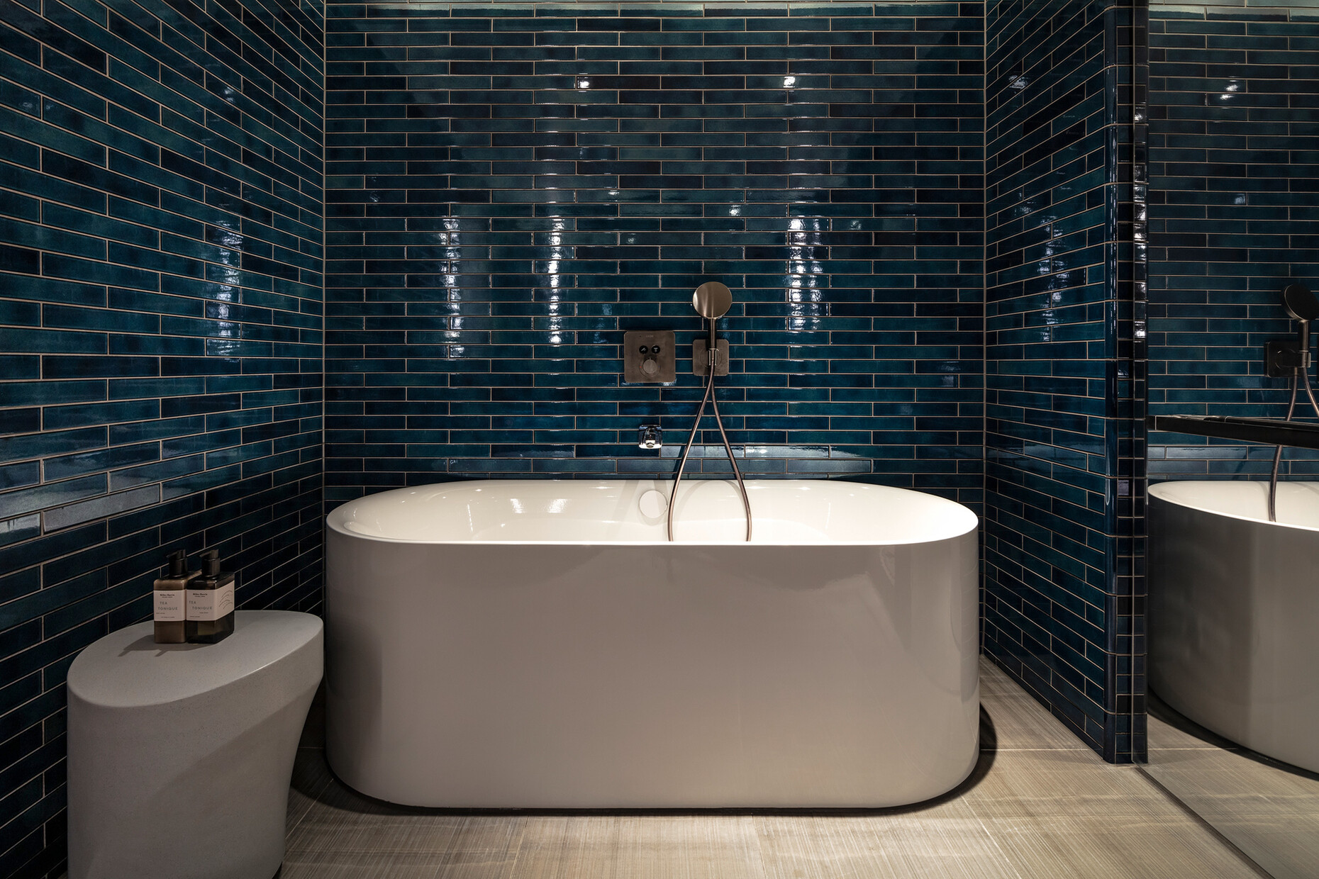 Dafür kamen drei verschiedene Badewannen-Modelle zum Einsatz, wobei die meisten Bäder mit "BetteForm" ausgestattet wurden, die auch als Dusche genutzt werden kann. So bietet das Badmöbel an einem Ende eine bequeme Rückenlehne, die ein entspanntes Baden ermöglicht und am anderen Ende einen steilen Abschluss, der die nötige Standfläche zum Duschen schafft. Für die Sicherheit der Hotelgäste sorgt ein maßgeschneiderter Griff, der farblich auf die Armaturen abgestimmt ist. Ein weiteres Badmöbel ist die freistehende "BetteLux Oval Silhouette"-Badewanne, die gestalterisch durch weiche, fließende Linien und einen filigranen Rand überzeugt und von zwei Personen gleichzeitig genutzt werden kann. Bei der dritten Badewanne entschieden sich Yabu Pushelberg für das ovale Zweisitzer-Modell "BetteStarlet Flair Oval".