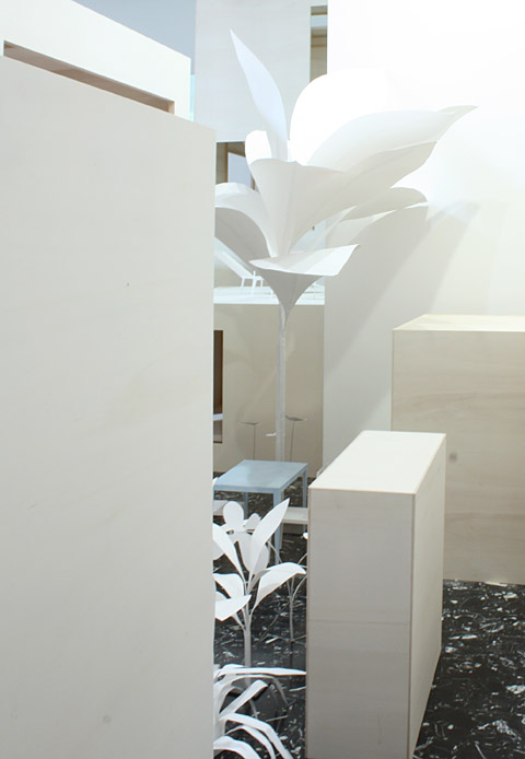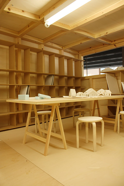 Auf dem wunderschönen Marmorboden des Pavillons stehen die Modelle zweier Häuser in verkleinertem Massstab: Das eine (die Puppenstube, in die ich schon von außen geschaut hatte) ist das Wohn- und Bürohaus von Atelier Bow-Wow in Tokio. Auch der Wohnteil, der sich hier oben befindet, ist liebevoll eingerichtet, mit kleinen Möbeln, kleinen Flaschen auf dem kleinen Kühlschrank und kleinen Zeitungen auf dem kleinen Wohnzimmertisch. Wir kennen diese Liebe zum Detail schon von den zauberhaften Planzeichnungen des Büros und ihren kleinen Modellen, beides ausgestellt auch in Sejimas Hauptausstellung.