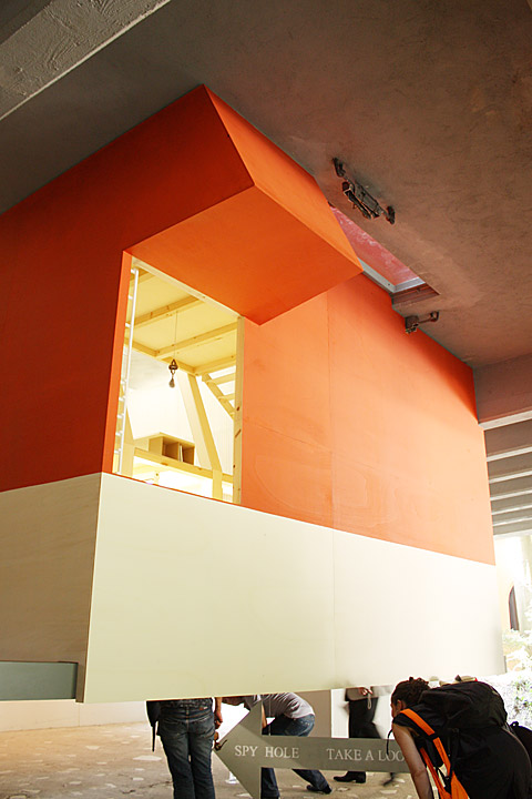 Ich nähere mich also dem schönen japanischen Pavillon aus den fünfziger Jahren von Takamasa Yoshizaka, ein fünfzehn auf fünfzehn Meter messender Oberlichtsaal, den metabolistische Betonscheiben in die Höhe stemmen. Unter dem Pavillon, ich verlangsame den Schritt, hängt eine sonderbare rot-weiße Kiste, daneben ein Pfeil mit der Aufschrift „Take a Look". Ich gehorche und finde meinen Kopf in einer Puppenstube wieder. Ein Architekturbüro mit allem Drum und dran, nur geschrumpft. Tische mit Plänen drauf, Stühle, Regale mit Modellen drin, mir schwindelt's. Verwirrt gehe ich unter dem Gebäude hervor und zum Eingang ein Geschoss höher.