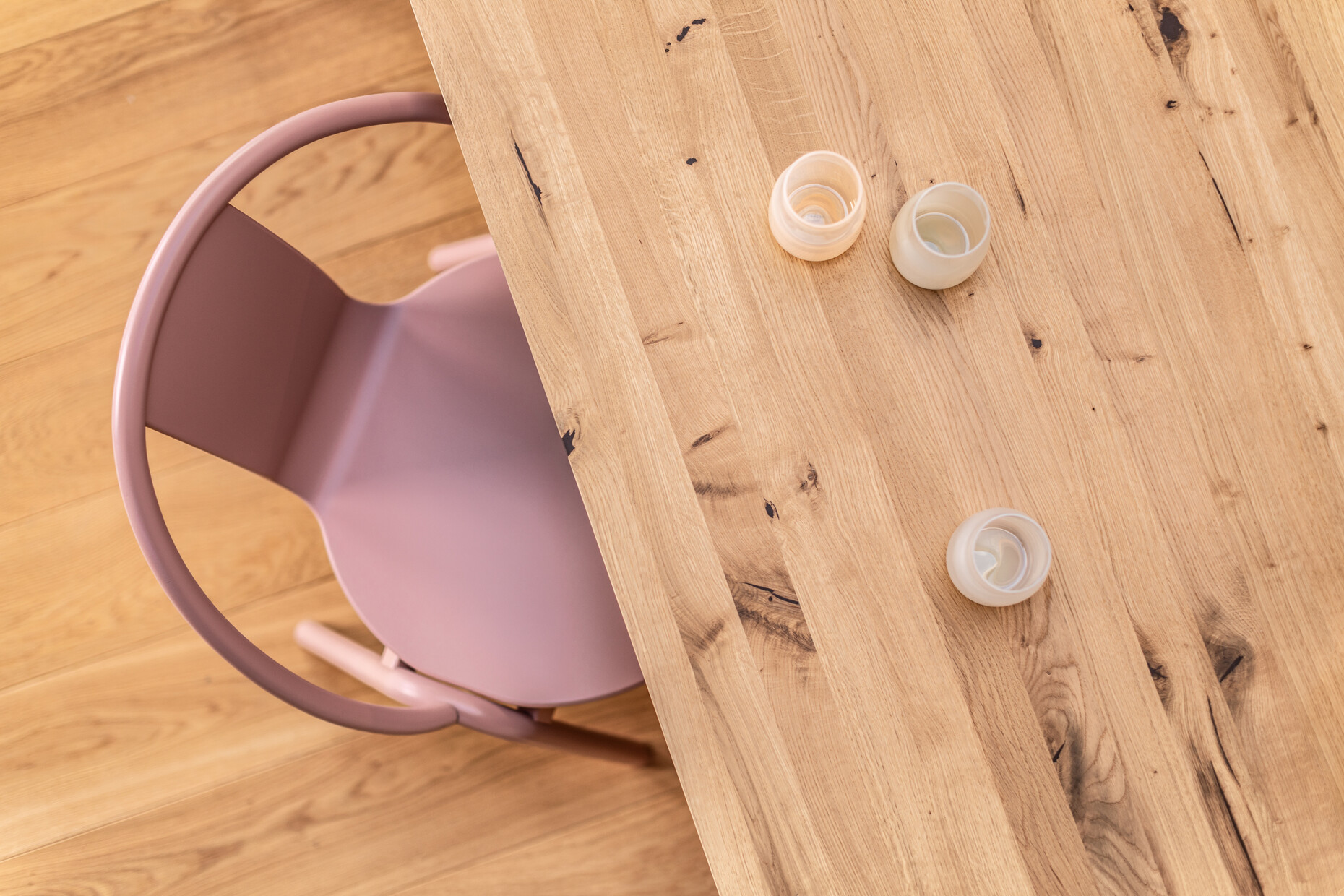 Erdacht hat die Kollektion "Again" der italienische Designer Alexander Gufler und feiert mit ihr ein Handwerk, das in der DNA von TON liegt: das Holzbiegen. Bugholz formt bei Stuhl und Barhocker einen großzügigen Halbkreis zur Rückenlehne. Kontrastiert wird die geschwungene Form von einem geraden Mittelstück, das senkrecht zum Sitz aus Sperrholz verläuft.