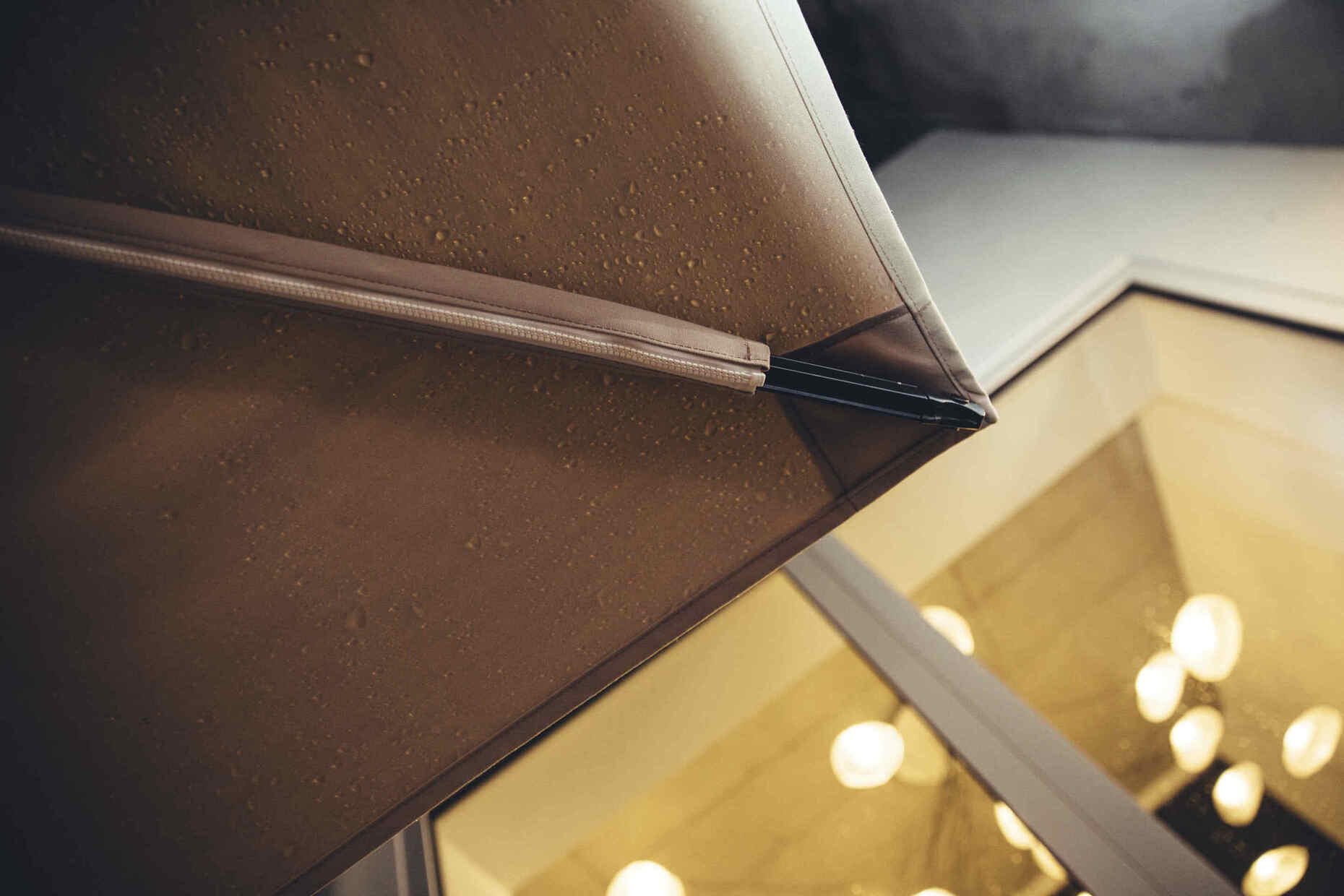 Dem großzügigen Schirm zur Seite stand der "Plantation Classic", der die Vorzüge der TUUCI-Beschattungen im kleineren Format zeigte. Der hochwertige Aluminium- und Edelstahlrahmen mit aluma-TEAK Holzoptik ist korrosionsgeschützt und wie bei seinem großen Bruder MAX Cantilever auch an kühleren Abenden ein nützlicher Begleiter. In der eleganten Konstruktion verteilt sich die Spannung des Schirms dank verstärkter Stützenverbinder auf den Rippen des "Plantation" effektiv und sorgt für zusätzliche Festigkeit. So gut beschirmt blieben alle Gäste trockenen Fußes und konnten in lockerer Atmosphäre den Abend entspannt ausklingen lassen.
