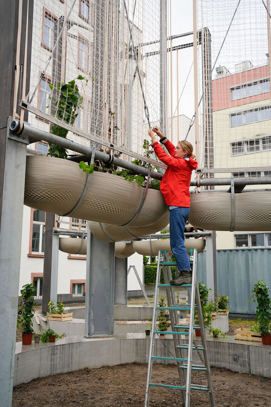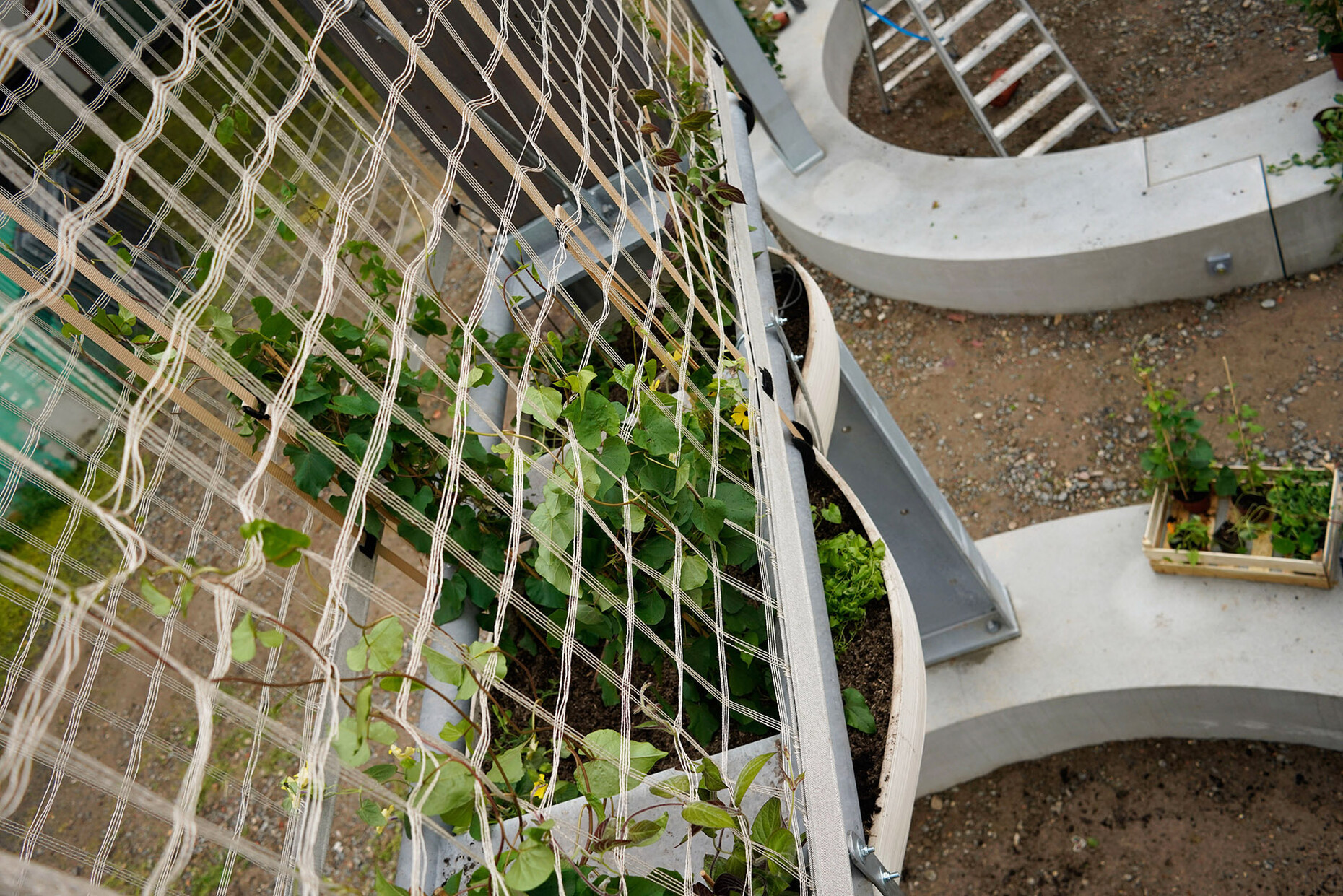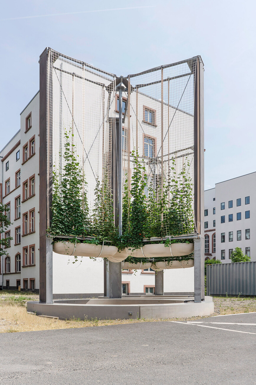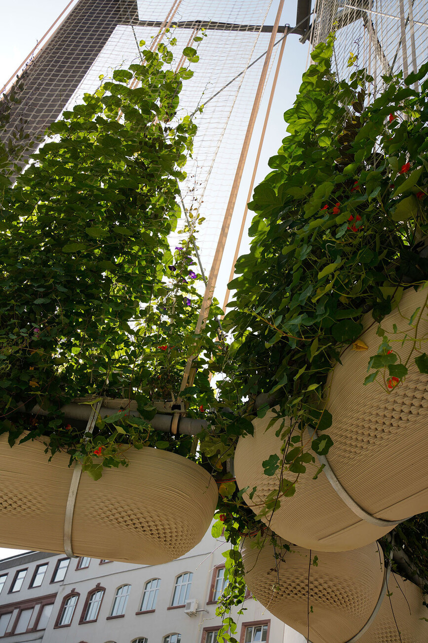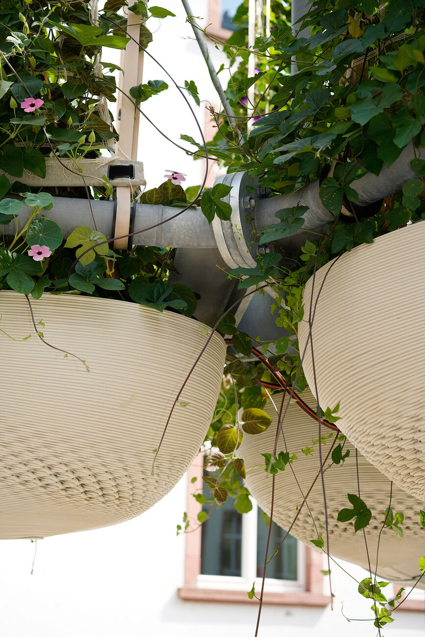 Und so zögerten die beiden Gründerinnen nicht lange, sondern holten sich PartnerInnen mit viel Expertise ins Boot. Malte Just von Just Architekten war von Beginn an ein wichtiger Partner, wenn es um die Schnittstellen zu Städtebau und Architektur ging. Für das ausgefeilte Tragsystem konnte das renommierte Ingenieurbüro Bollinger+Grohmann gewonnen werden. Dieter Gaißmayer, eine Legende unter den deutschen PflanzenexpertInnen, zeichnet für die Recherche der passenden Rankpflanzen verantwortlich. Bei der Entwicklung der Pflanzkübel und der mechanischen Details der Anlagen unterstützte Stefan Diez mit seinem Team von Diez Office. "Als Nicola mich wegen dem Projekt angefragt hat, habe ich sofort zugesagt", erinnert sich Stefan Diez. "Ich kenne sie schon seit fast 20 Jahren und weiß daher, dass alles, was sie anpackt, Hand und Fuß hat. Und sie weiß, dass ich mich gerne mit Architekturelementen und systemisch-technischen Details beschäftige." Außerdem sei es ihm als Designer ein Anliegen, sich auch mit den zukünftigen Herausforderungen unserer Zeit auseinanderzusetzen. Um die Pflanzgefäße und die Netzbefestigung zu entwickeln, hat Stefan Diez intensiv mit Dieter Gaißmayer zusammengearbeitet. In seiner Gärtnerei haben sie Freiland-Tests mit verschiedenen Kletterpflanzenarten hinsichtlich Wurzelraum, Wasserbedarf und Windlasten gemacht. Die Pflanzgefäße bestehen aus recyceltem Kunststoff und werden im 3D-Druck produziert.